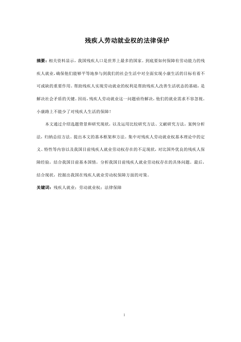 残疾人劳动就业权的法律保护摘要:相关资料显示,我国残疾人口是世界上最多的国家。到底要如何保障有劳动能力的残疾人就业,确保他们能够平等地参与到我们的社会生活中对全面实现小康生活的目标有着不可或缺的重要作用。帮助残疾人实现劳动就业的权利是帮助残疾人改善生活状态的基础,是解决社会矛盾的关键。因而,残疾人劳动就业这一问题亟待解决,他们的就业需求不容忽视。小康路上不能少了对残疾人生活的保障!本文通过介绍选题背景和研究现状,以及运用比较研究方法、文献研究方法,案例分析法,归纳总结方法。提出本文的基本框架和方法。集中对残疾人劳动就业权基本理论中的定义、特性等内容以及我国目前残疾人就业劳动权存在的不足现状,对比国外优良的残疾人保障经验,结合我国目前基本国情,分析我国目前残疾人就业劳动权存在的具体问题。最后,结合现状,挖掘出我国在残疾人就业劳动权保障方面的对策。关键词:残疾人就业:劳动就业权:法律保障1Legal Protection of Disabled Persons'Right to Work andEmploymentAbstract:According to statistics,there is the biggest disabled population in China around theworld.How to guarantee the employment of disabled people who are able to work and to ensuretheir equal participation in our social life plays an indispensable role in achieving the goal ofmoderately prosperous in all respects.Helping the disabled to realize their right to work andemployment is the basis to help the disabled to improve their living conditions and the key tosolving social contradictions.Therefore,the problem of employment of the disabled needs to besolved urgently,and their employment needs should not be ignored.It's not supposed to reducethe security of the disabled in well-off road.This paper introduces the background and research states of the topic,using of comparativeresearch methods,literature research methods,case analysis methods and summary methods.Thebasic framework and methods of this paper are proposed.Focus on the definition,characteristicsand other contents of the fundamental theory of labor and employment right of the disabled,aswell as the actuality of the employment rights of the disabled in China.Compare the excellentexperiences of legal protection of the disabled abroad,and analyze the specific problems existingin the employment right of disabled people in our country.Finally,combine with the currentsituation and excavate the countermeasures to protect their right from harm in our countryKeywords:employment of the disabled;right to employment;legal protection.2目录1.1研究背景和意义…1.1.1研究背景.…1.1.2研究意义.71.2文献综述81.2.2国外研究.81.3研究方法和内容…1.3.1研究方法…1.3.2研究内容…9第2章残疾人劳动就业权概述.。112.1残疾人劳动就业权的定义和特性..。112.1.2残疾人劳动就业权的特性…11第3章残疾人劳动就业权法律保障制度的域外探索和思考…133.1美国对残疾人劳动就业权的保障133.2日本对残疾人劳动就业权的保障.·133.3对我国残疾人劳动就业权法律保障引发的思考.…14第4章残疾人劳动就业权法律保障的现状及存在的问题·154.1目前我国残疾人劳动就业权的法律体系.154.1.1关于当前我国残疾人劳动就业权的法律制度..154.1.2当前我国残疾人劳动就业权的法律制度的实践就业表现..164.2.1残疾人劳动就业权的立法不足的现状…174.2.2目前关于残疾人劳动就业权的法律规定无法直接用于实践....184.2.3实施残疾人劳动就业权的机制不健全..18第5章完善我国残疾人劳动就业权法律保护制度的建议·195.1完善我国残疾人劳动就业权保障的立法体系.....195.1.2继续细化并完善现有的《残疾人保障法》5.1.3在立法中明确残疾人就业的社会福利以及保险等内容…215.2在司法活动中注重对残疾人劳动就业权的保障..215.2.2完善残疾人劳动就业权的司法救济制度…22结语.233