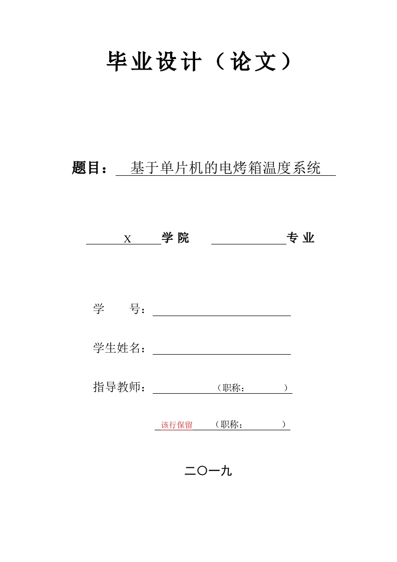 毕业设计(论文)题目:基于单片机的电烤箱温度系统学院专业学学生姓名:指导教师:(职称:该行保留(职称:)摘要由于中国的经济很快发展,人们的生活质量有所改善,群众的创新能力在不断进步。工人的劳力及其体力,将会由人们发明的机器来代替。这样一来还能促进工业的发展。电子技术的运用更加使得社会的格局变得更加的微妙。机电控制系统现如今慢慢的变成了机械行业以及电子行业技术集成的共性关键技术。使用者可以根据自己的想法来操作机器的动作。根据现在的机电控制技术的发展状况,其控制方式可以看到,主要是两种:单片机和PLC。于是我们决定用单片机控制。这个机器其实在当今生活中的使用中,已经渐渐普及。温度控制经常在工业的活动中可以普遍用到,比如:石油化工到电力的生产,治金到建材的运用,食品机械的加工等,都需要对温度进行控制,温度的合理控制对产品最后的质量也有很大的效果。由此可见,使用单片机进行温度控制在当代甚至未来都是会占据一定的位置。这篇文章其实是根据AT89C51单片机在对电烤箱用来控制温度过程的这个系统的设计。这个系统由两个部分构成:他们分别是硬件部分和软件部分。其中硬件部分包括:单片机电路、转换器电路以及键盘还有显示电路等等。软件部分包括:主程序等。文章最后对本设计进行了总结,并且我们也对用来控制温度的这个系统的发展发表了一些意见。关键词:用来控制温度的系统:电烤箱:单片机IAbstractWith the development of social economy,people's innovative ability is also constantlyimproving.Machines invented by people have replaced the labour and physical strength ofworkers and promoted the development of industry.The application of electronic technologymakes the social structure more delicate.The electromechanical control system has graduallybecome the common key technology of technology integration in mechanical industry andelectronic industry.Users can operate the machine according to their own ideasAccording to the current development of electromechanical control technology,itscontrol mode can be seen that there are mainly two kinds:single chip computer and PLC.Thedesign of this paper decides to use single chip computer to control.In fact,microcontroller inthe use of today's life,has gradually become popular.Temperature control can be widely usedin industrial activities,such as:petrochemical industry to power production,metallurgy tobuilding materials,food machinery processing,etc.,all need to control temperature,reasonable control of temperature has great effect on the final quality of products.It can beseen that the use of single-chip temperature control in the contemporary and even in the futurewill occupy a certain position.This paper is mainly based on AT89C51 MCU to design the temperature control systemof electric oven.The temperature control system of electric oven has two parts:hardware partand software part.The hardware part includes:single chip circuit,sensor circuit,amplifiercircuit,converter circuit,keyboard and display circuit.The software part includes the mainprogram,the operation control program and the program of each function realization module.Finally,the design is summarized.Some suggestions for the development of temperaturecontrol system are put forward.Key words:temperature control system;electric oven;single chip computerII