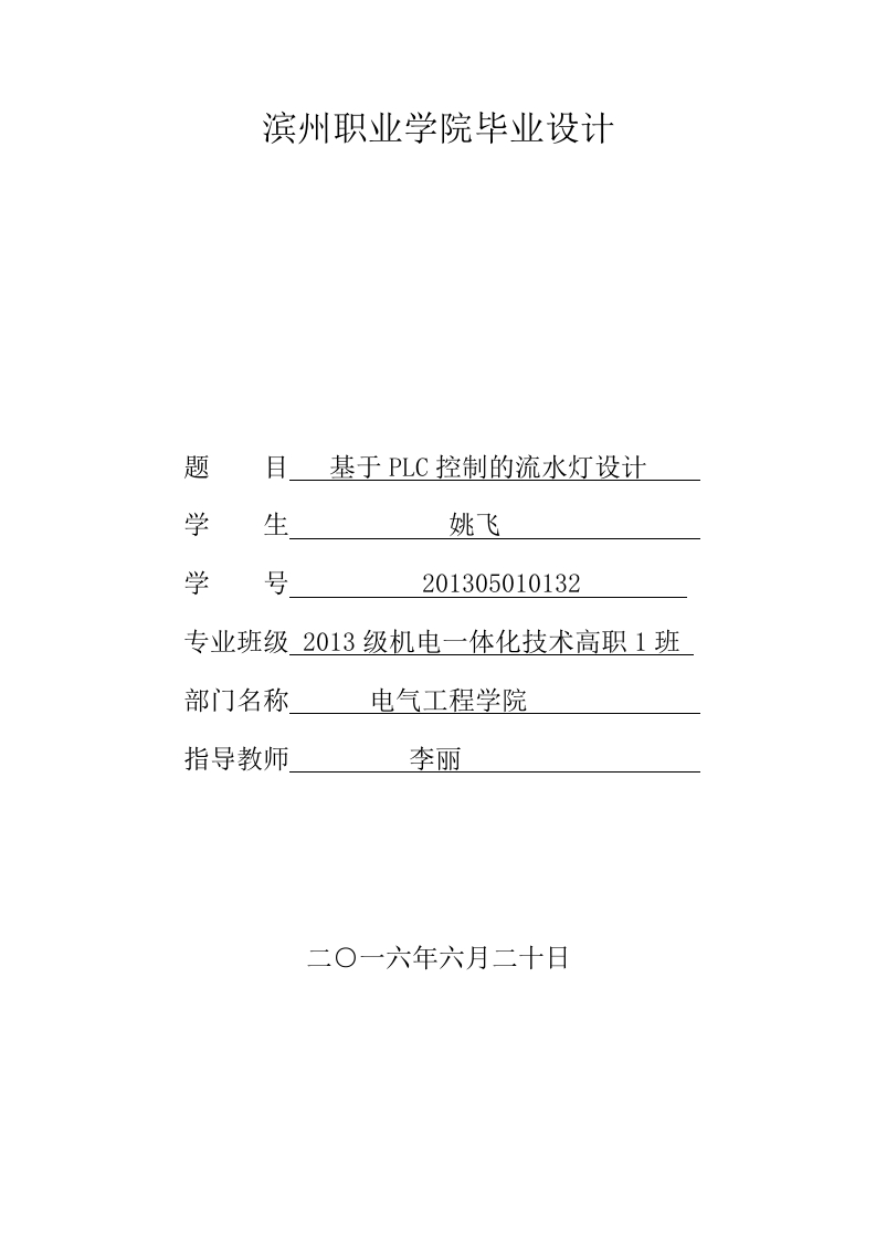 滨州职业学院毕业设计题基于PLC控制的流水灯设计学生姚飞学号201305010132专业班级2013级机电一体化技术高职1班部门名称电气工程学院指导教师李丽二0一六年六月二十日滨州职业学院毕业设计任务书机电一体化技术专业2013年级2016年6月20日批准专业负责人:赵建军发放经手人:李丽1.毕业设计题目:基于PLC控制的流水灯设计2.学生完成全部任务期限:2016年6月20日3.任务要求:1)进程要求①提出选题的初步设想。②搜集、整理与毕业设计或论文有关的、充分的、准确的信息资料,扩充查阅范围。③分析、筛选已有的信息资料,提出研究设想与计划。④向指导教师提出开题报告(见附页)。⑤构思论文框架,编写论文提纲,撰写论文初稿。⑥提请指导老师审阅,并根据老师的指导意见做进一步修订,装订成册。2)成果要求①题目长度一般不超过20个字。②毕业设计目录毕业设计要求层次分明,必须按其结构顺序编写目录,目录独立成页。3)中文摘要、关键词、英文摘要、关键词摘要一般不分段,不用图表,中文摘要以200字为宜,置于前页;英文摘要对应,紧接其后。关键词是反映内容主题的词或词组,一般3一8个。中文关键词放在中文摘要的下面:英文关键词放在英文摘要的下面。关键词之间用分号分开。4)毕业设计正文正文是毕业设计的主体和核心部分,包括绪论、本论、结论三个紧密相连的部分,具体要求如下:绪论(即概述、引言或前言等):绪论是毕业设计的开头,包括研究(作品制作)的目的和意义,问题的提出,选题的背景,文献综述,研究方法,毕业设计进程安排与设计研究意义等。用简短的文字进行概括,一般在300字左右。本论:本论是正文的主体,它包括文献资料的综述,观点的论证和阐述。撰写时要求观点明确,围绕观点展开陈述,切忌脱离中心,文不对题。设计作品类,包括作品研发(或制作)中遇到的问题,解决问题的方法与过程,主要的理论支持与研究引用的数据,字数一般在3000字。结论(或结果讨论):结论是毕业设计最终总体的结论,应明确、精练、完整、准确。4.实验(调研)部分内容要求:1)实验内容与论文题目一致,数据真实。2)调研内容详实,调研结论应具备普遍性。5.文献查阅及翻译要求:1)参考文献应与论文内容相一致。2)参考文献不少于8篇。