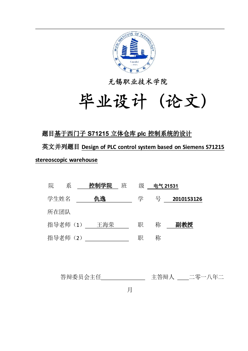 无锡职业技术学院毕业设计(论文)题目基于西门子S71215立体仓库plc控制系统的设计英文并列题目Design of PLC control system based on Siemens S71215stereoscopic warehouse院系控制学院班级电气21531学生姓名仇逸学号2010153126所在团队指导老师(1)王海荣职称副教授指导老师(2)职称答辩委员会主任主答辩人一二零一八年二月无锡职业技术学院毕业设计(论文)说明书基于西门子S71215立体仓库p1c控制系统的设计摘要:随着现代企业管理制度和计算机水平的迅猛发展,当前企业愈发需要人事工资管理系统为职工管理工作提供服务,因此该系统成为当今企业单位不可块少的管理组成部分。传统人事管理方式浪费大量的人力、对力、物力,因而设计满足企业要求的人事工资管理系统可以极大地提高人事工资管理的效率,也是企业的科学化、正规化管理,与世界接轨的重要条件。通过SSH(Struts2+Spr ing2+Hibernate3)搭建人事工资管理系统实现对员工资料进行管理、对工资项目及计算公式自由设定,支持报表格式的输出,实现数据统计与分析,对贞工各项指标进行统计。叁于SS州框架设计的人事工资管理体系,可以实现稳定的系统结构,动态维护系统数据,支持系统扩展,降低系统层次的耦合度。利用Struts技术结合MvC模式规范表示层结构。利用Spring对业务层中数据访问进行了控制,提高可扩展性。Hibernate框架对数据持久层业务与数据进行分离,使耦合度降低,提高系统效率。以Struts2+Spr ing2+Hibernate3为组合框架的人事工资管理系统具有较高的维护性、稳定性和可移植性。该系统实现企业人员信息的详细记录,人事管理专员可以通过人事工资管理系统雏护员工资料、部门架构、人员分组、贞工异动信息等:实现查询功能,支持多条件值搜索:系统提供的多种报表、统计图表,可以帮助人事主管通过不同的查询条件查看人员信息、生日汇总、合同异动等,实现系统智能化操作,从而让人事工资管理工作的检索更迅逸、查找更方便、可靠性高、存储量大、保密性好、灵活性高,可移植性强,管理成本更低。关键词:绩效工资,管理系统,数据库,B/S结构Design of PLC control system based on Siemens S71215stereoscopic warehouseAbstract:With the rapid development of modern enterprise management system and computer level,the current enterpriseincreased needs personnel and wage management system to provide services for staff management,so the system has becomean indispensable part of the management of enterprises.The traditional way of personnel management wastes a lot of M.Anpower,financial and material resources.Therefore,the design of personnel salary management system that meets therequirements of enterprises can greatly improve the efficiency of personnel salary management.It is also an importantcondition for the science and regular management of enterprises to be in line with the world.Through SSH (St.Ruts2+Spring 2+Hibernate 3).the personnel and wage management system is built to manage the staff data,set the wage itemsand calculation formula freely,support the output of report format,realize data statistics and analysis,and make statistics onvarious indicators of employees.Personnel salary management system can be based on SSH framework.Achieve stablesystem structure,dynamic maintenance of system data,support system expansion,and reduce system level coupling.Struts无锡职业技术学院毕业设计(论文)说明书technology and MVC schema are used to standardize the presentation layer structure.Spring is used to control data access inbusiness layer and improve scalability.Hibernate framework separates data persistence Layer business from data,reducescoupling and improves system efficiency.The personnel salary management system based on Struts 2+Spring 2+Hibernate 3has high maintainability,stability and portability.This system realizes the detailed record of enterprise personnel information.Personnel management specialists can maintain staff information,Department structure,personnel grouping,staff dislocationinformation through personnel salary management system,realization query function,support multi-condition value search,and provide a variety of reports and statistical charts,which can help personnel managers to view personnel information andstudents through different query conditions.Aily summary,contract alteration,etc.,to achieve intelligent operation of thesystem,so that personnel and wage management work more quickly,more convenient to find,high reliability,large storage,good confidentiality,flexibility,portability,lower management costs.keyword:Performance Pay,Management System,Database,B/S Structure