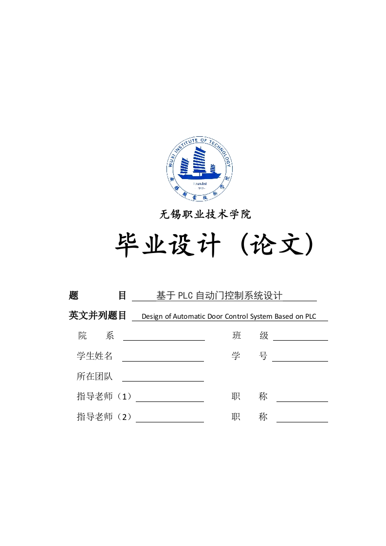 无锡职业技术学院毕业设计(论文)题目基于PLC自动门控制系统设计英文并列题目Design of Automatic Door Control System Based on PLC院系班级学生姓名学号所在团队指导老师(1)职称指导老师(2)职称答辩委员会主任主答辩人二零年月WUXI INSTITUTE OF TECHNOLOGY届毕业设计团队总报告团队名称:院系专业名称学生姓名指导老师20年月目录基于PLC的枕式包装机控制系统设计…第一章绪论…1.1研究背景51.2因内外研究现状…52.1枕式包装机的结构与工作流程…6第三章枕式包装机的控制系统硬件设计…3.1PLC电路设计…73.2温度控制模块电路设计,933电机选用与触摸屏设计…3.4伺服系统软件编程…4.1枕式包装机控制要求…4.2控制系统方式选择五、PLC的硬件结构15六。设计领域…七.结论20
