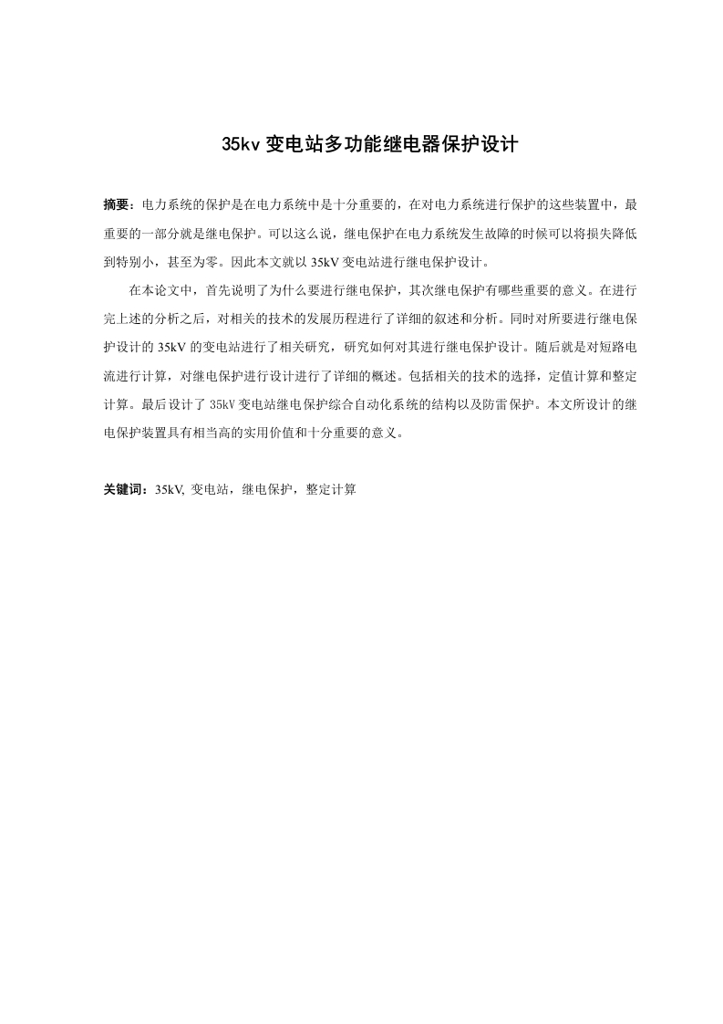 35kv变电站多功能继电器保护设计摘要:电力系统的保护是在电力系统中是十分重要的,在对电力系统进行保护的这些装置中,最重要的一部分就是继电保护。可以这么说,继电保护在电力系统发生故障的时候可以将损失降低到特别小,甚至为零。因此本文就以35kV变电站进行继电保护设计。在本论文中,首先说明了为什么要进行继电保护,其次继电保护有哪些重要的意义。在进行完上述的分析之后,对相关的技术的发展历程进行了详细的叙述和分析。同时对所要进行继电保护设计的35kV的变电站进行了相关研究,研究如何对其进行继电保护设计。随后就是对短路电流进行计算,对继电保护进行设计进行了详细的概述。包括相关的技术的选择,定值计算和整定计算。最后设计了35kV变电站继电保护综合自动化系统的结构以及防雷保护。本文所设计的继电保护装置具有相当高的实用价值和十分重要的意义。关键词:35kV,变电站,继电保护,整定计算Protection design of multifunctional relay in 35kv substationAbstract:The protection of the power system is very important in the power system,in the protectionof the power system of these devices,the most important part is relay protection.It can be said thatrelay protection can reduce the loss to a very small or even zero in case of failure of the power system.Therefore,this paper to 35kV substation relay protection design.In this paper,the paper first explains why relay protection should be carried out,and then explains thesignificance of relay protection.After the above analysis,the development process of relatedtechnologies is described and analyzed in detail.At the same time,the paper also studies the relayingdesign of the 35kV substation.Then the short circuit current is calculated and the relay protection isdesigned in detail.Including the selection of relevant techniques,fixed value calculation and settingcalculation.Finally,the structure of integrated automation system of relay protection and lightningprotection for 35kV substation are designed.The relay protection device designed in this paper has highpractical value and very important significance.Keywords:35kV,Transformer substation,Relay protection,Setting calculation目录1.2国内外发展现状.1第2章35kV变电站简介及继电保护概述.32.1变电站简介.32.2继电保护的设计内容、原理与要求4第3章短路电流计算…63.2短路计算的规定和假设63.2.2短路计算假设第4章35kV变电站继电保护装置选择104.1阶段式电流保护的选择.。101112第5章35kW变电站继电保护定值整定计算.·135.1变压器保护整定原则及对主变保护的要求13135.3纵联差动保护.135.3.1基本侧动作电流计算....145.3.2继电器动作电流和匝数计算..145.3.3非基准位置平衡和工作绕组的匝数.。155.3.4灵敏度校验…155.3过电流保护..155.4过负荷保护.…164.5冷却风扇启动.…16第6章继电保护自动化和防雷保护设计..·176.1继电保护装置自动化功能要求..·176.3防雷保护设计19第7章总结.20参考文献:21