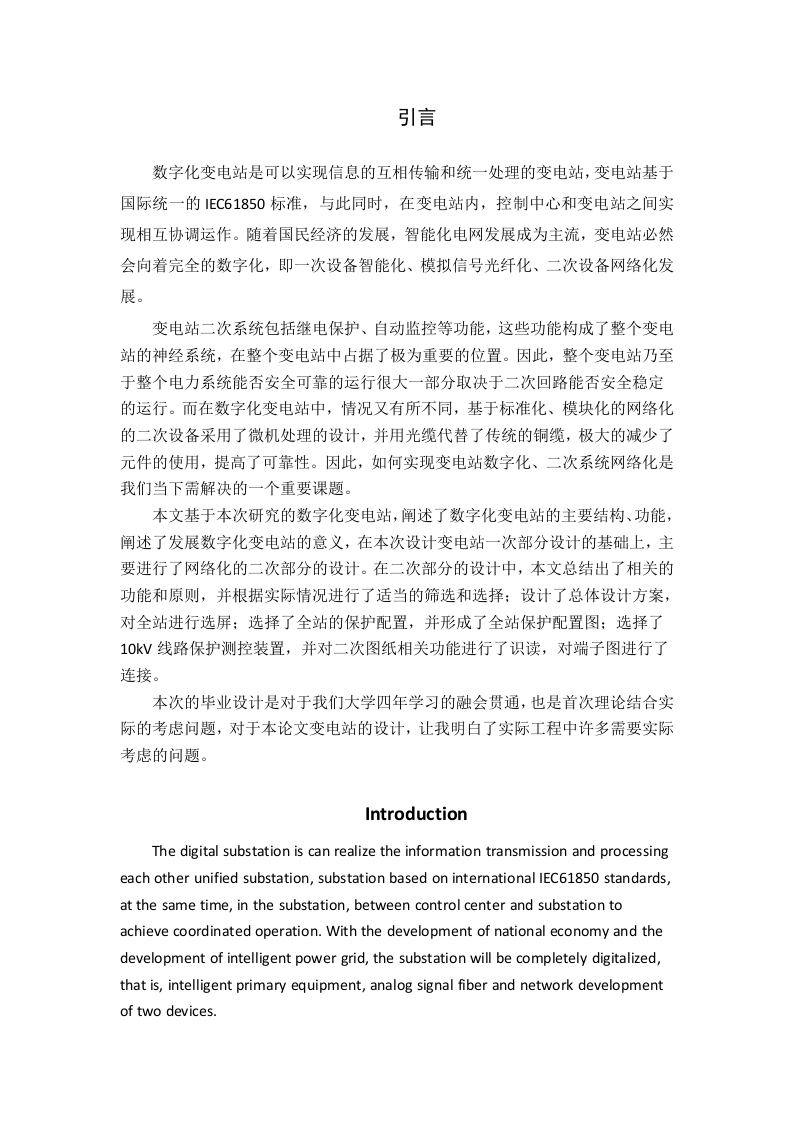 引言数字化变电站是可以实现信息的互相传输和统一处理的变电站,变电站基于国际统一的C61850标准,与此同时,在变电站内,控制中心和变电站之间实现相互协调运作。随着国民经济的发展,智能化电网发展成为主流,变电站必然会向着完全的数字化,即一次设备智能化、模拟信号光纤化、二次设备网络化发展。变电站二次系统包括继电保护、自动监控等功能,这些功能构成了整个变电站的神经系统,在整个变电站中占据了极为重要的位置。因此,整个变电站乃至于整个电力系统能否安全可靠的运行很大一部分取决于二次回路能否安全稳定的运行。而在数字化变电站中,情况又有所不同,基于标准化、模块化的网络化的二次设备采用了微机处理的设计,并用光缆代替了传统的铜缆,极大的减少了元件的使用,提高了可靠性。因此,如何实现变电站数字化、二次系统网络化是我们当下需解决的一个重要课题。本文基于本次研究的数字化变电站,阐述了数字化变电站的主要结构、功能,阐述了发展数字化变电站的意义,在本次设计变电站一次部分设计的基础上,主要进行了网络化的二次部分的设计。在二次部分的设计中,本文总结出了相关的功能和原则,并根据实际情况进行了适当的筛选和选择:设计了总体设计方案,对全站进行选屏:选择了全站的保护配置,并形成了全站保护配置图:选择了1OkV线路保护测控装置,并对二次图纸相关功能进行了识读,对端子图进行了连接。本次的毕业设计是对于我们大学四年学习的融会贯通,也是首次理论结合实际的考虑问题,对于本论文变电站的设计,让我明白了实际工程中许多需要实际考虑的问题。IntroductionThe digital substation is can realize the information transmission and processingeach other unified substation,substation based on international IEC61850 standards,at the same time,in the substation,between control center and substation toachieve coordinated operation.With the development of national economy and thedevelopment of intelligent power grid,the substation will be completely digitalized,that is,intelligent primary equipment,analog signal fiber and network developmentof two devices.Substation two times system includes relay protection,automatic monitoringand other functions,these functions constitute the entire substation of the nervoussystem,in the entire substation occupies a very important position.Therefore,thewhole substation,as well as the whole power system,can run safely and reliably,agreat part depends on whether the two circuit can run safely and stably.In digitalsubstation,the situation is different,the two equipment standardization and themodular network is designed based on the microcomputer processing,and toreplace the traditional copper cable,greatly reduces the use of components,improvereliability.Therefore,how to realize the substation digitization and the two systemnetwork is an important topic that we need to solve now.In this paper,based on the research of digital substation,expounds the mainstructure and function of digital substation,describes the development of digitalsubstation,in the design of a substation part of the design basis,mainly for the twopart of the design of network.In the design of the two part,this paper summarizesthe function and principles,and the screening and selection of appropriate accordingto the actual situation;the design of the overall design scheme of the stationselection screen;choose the protection configuration of the station,the station andthe formation of protection configuration diagram;choose the 10kV line protectiondevice on the two,and drawing functions of the reader,the connection of theterminal diagram.This graduation design is to integrate our university four years of study,but alsofor the first time considering the combination of theory and practice,this paperdesign for substation,so I understand the need to consider many practicalengineering problems of practical.第一章绪论1.1发展数字化变电站的意义随着国家高速发展,电网高度普及,变电站综合自动化技术发展已趋于稳定,可以实现变电站无人值守和信息的交互,但综合变电站自动化技术发展至今,其许多不足也渐渐暴露出来,主要包括一次设备的限制,大量复杂的双电缆导致误操作,通信协议不统一等。电作为国民经济生活中不可或缺的一部分,可以说,电网是否正常运行关系着国民经济的命脉。在这种情况下,如何保证电网安全稳定的运行及如何提高电网效率成了当下急需解决的问题。而数字化变电站,就是把传统变电站中的模拟信息转换为数字信息,并建立基于国际统一的EC61850标准,解决了自动化变电站的不足。1.2数字化变电站的现状及未来发展趋势1.2.1国内数字化变电站的发展过程1995年,德国提出以统一的1EC61850规约设计变电站。之后二十年内,随着自动化技术、通信技术、电子互感器技术的不断发展,数字化变电站也渐渐从理论走向实际。自2000年起,变电站自动化理论在国内被提出,IEC61850的转化被列为建设变电站的重点工作。同一时期,随着通信技术、自动化技术等提升,自动化变电站得到了广泛的应用。综合自动化变电站采用二层式分布控制结构,即采用站控层实现全站控制,间隔层实现就地单元控制,基本实现了无人值守的模式。但传统变电站仍存在着设备间不具有互操作性、信息难互通、二次设备电缆多影响可靠性、设备复杂难以扩建等问题。