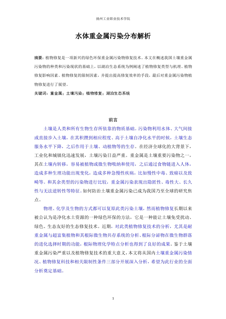 扬州工业职业技术学院水体重金属污染分布解析摘要:植物修复是一项新兴的绿色环保重金属污染物修复技术。本文在概述我国土壤重金属污染物的种类和污染现状的基础上,以湖泊生态系统为例阐述了植物修复类型与机理、植物修复影响因素、植物修复的限制因素,并提出提高修复效率的手段,最后对重金属污染物植物修复进行了展望。关键词:重金属;土壤污染;植物修复;湖泊生态系统前言土壤是人类和所有生物生存所依靠的物质基础。污染物利用水体、大气间接或直接步入土壤,在其积攒到相应程度、高于土壤自净化水平的时候,土壤生态服务水平下降,之后作用于土壤、动植物等的生存。在经济全球化的大背景下,工业化和城镇化迅速发展,土壤污染日益严重。重金属是土壤重要污染物之一,其在土壤内转移,容易被植物或微生物吸纳和使用,之后通过食物链进入人体,造成多种生理功能出现变化,造成多种急慢性疾病,比如慢性中毒、政癌以及致畸等。和其余类型的污染物进行比较,重金属污染表现出隐匿性、毒性大、长久性与无法逆转性等特征。如何防治土壤重金属污染已成为我国乃至全球的研究焦点。物理、化学及生物的方式都可以复原此类污染土壤,然而植物修复长期以来被公认为是净化水土资源的一种绿色环保的方法,它是一种能让土壤免受扰动、绿色、生态友好的生态修复技术。近期,对此类植物修复技术的分析,尤其是耐重金属与超富集植物和其根际微生物共存系统的分析、根际分泌物在微生物群落的进化选择时期的功能,根际物理化学特点分析也得到了良好的成果。鉴于土壤重金属污染严重以及植物修复技术的重大意义,本文将从国内土壤重金属污染情况、植物修复科技和相关限制性条件三部分开展深入分析,希望为此行业的全面分析奠定基础。扬州工业职业技术学院1我国土壤重金属污染物来源及污染现状1.1土壤重金属污染物种类及来源重金属表示密度超过4.0的多种种元素或密度超过5.0的多种元素,一般被划分成以下几类:(1)包含生物毒性的金属汞(Hg)、镉(Cd)、铅(Pb)、铬(Cr)、铜(Cu)、锌(Zn)、钴(Co)、镍(Ni)、锡(Sn)、钒(V)以及类金属砷(As)、硒(S)等:贵重金属如(Au)、银(Ag)、铂(Pt)、钯(Pd)、钌(Ru)等:(3)放射性金属铀(U)、钍(Th)、镭(Ra)、镅(Am)等。重金属污染物相关因素众多,国内此类污染物一般源自采矿、治炼、金属加工等发展排放的三废以及农业领域的农药残留。国内此类污染物来源可参考表1。表1我国主要土壤重金属污染物及来源Tab.I Main heavy metal pollutant and its resources主要污染物来源汞Hg采矿业,化工业,电子工业,仪表制造业,治金工业镉Cd治金业,电镀业和颜料、涂料工业铁路工业、耐火材料工业,电镀工业,皮革工业和染料、颜料铬Cr等工业铅Pb农业砷As采矿业和治金业镍Ni电镀业,采矿、治金、石油化工、纺织、印刷业等银Ag电镀业和照相业铜Cu采矿业及治金业锌Zn采矿业,治金业,造纸业,机械制造业等1.2我国重金属污染现状2014年4月17日,环保部与国土资源部共同制定的《全国土壤污染状况调查公报》表明,国内耕地土壤环境质量不容乐观。分析结论表示,国内土壤环境情况恶劣,少数区域土壤污染明显,耕地土壤质量较低,工矿业废弃地土壤问题更加明显。国内遭受重金属污染耕地面积不断增加,1980年污染耕地面积扬州工业职业技术学院266.7万公顷,1988年提高到666.7万公顷,1992年则是1000万公。重金属逐渐变成土壤内长久无法根除的“毒瘤”,根据相关分析可知,国内每年由于土壤金属污染而亏损的粮食产量是1000万吨,直接经济亏损是2000多亿元人民币。我国环境监测总站的数据表明,当前污染最明显的是镉污染、汞污染、血铅以及砷污染。近期出现的此类污染问题较多,2006年湖南湘江株洲镉污染:2007年太湖、巢湖、滇池爆发蓝藻危机:2009年、2010年多地曝出的血铅超标事件:2012年初广西龙江镉污染:2014广西大新县重金属污染等。根据分析,国内24个省(市)城郊、污水灌溉区、工矿等社会经济持续发展的320个重要污染区中,污染严重的农作物种植面积是60.6万公顷。重金属通过土壤影响食品安全性,进而影响人类的生命安全,怎样修复此类污染土壤就变成加快国内农业长久稳定发展的重中之重。2植物修复2.1植物修复产生与发展“植物修复”(Phytoremediation)表示把某种对污染元素具备独特吸附功能的植物种植在相关污染土壤中,且将植物收获进而开展全面处理(比如灰化回收)之后就可以把此重金属转移出土体,最终完成污染管理和生态复原目标。1583年意大利植物专家Cesalpino第一次了解到在该国托斯卡纳“黑色的岩石”上生长的独特植物,这就是关于超富集植物(Hyperaccumulator)的最初信息。1977年,Brooks指出超富集植物的定义(hyperaccumulator)。l983年,Chaney第一次指出使用此植物去除土壤内重金属污染物的观点。后续的分析表示上述植物是部分地区性物种,其地区划分和土壤内部分重金属含量表现出显著的相关性。2.2植物修复类型与机理2.2.1植物修复污染土壤的途径和调控机制基于其作用情况和机理,重金属污染土壤的植物修复技术通常被划分成三部分,接下来对其进行深入研究(表2)。(1)植物提取表示利用部分对重金属具备强大富集功能的独特植物从土壤内吸纳重金属,把其转移、储存到地上部且利用收获植物地上部而减少污染物的重要方式。