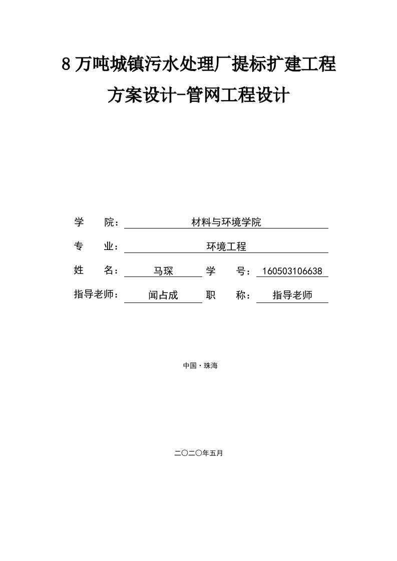 8万吨城镇污水处理厂提标扩建工程方案设计-管网工程设计学材料与环境学院专业:环境工程姓名:马琛学号:160503106638指导老师:闻占成职称:指导老师中国·珠海北京理工大学珠海学院2020届本科生毕业设计诚信承诺书本人郑重承诺:本人承诺呈交的毕业设计《8万吨城镇污水处理厂提标扩建工程方案设计-提标工程设计》是在指导教师的指导下,独立开展研究取得的成果,文中引用他人的观点和材料,均在文后按顺序列出其参考文献,设计使用的数据真实可靠。本人签名:马琛日期:年北京理工大学珠海学院2020届本科生毕业设计摘要本论文以广东省珠海市斗门区井岸镇污水处理厂为设计对象,本项目的设计范围为井岸污水处理厂提标、扩容改造工程的配套管网系统。该厂主要服务于珠海市斗门区井岸城区及部分新青片区。由于城市的扩张和社会的发展,该厂原设计的3.5万3/d的最大容量已经不再适应现实生活每日的污水产生量,而该厂原本遵循的一级B排放标准《城镇污水处理厂污染物排放标准》(GB18918-2002)也已不再适应环境规划需求,现急需提标扩建为8万m3/d,一级A排放标准《城镇污水处理厂污染物排放标准》(GB18918-2002)。然而,一座完整的污水处理厂不仅需要各类构筑物,还需要建设一套完善的污水管网系统,来满足各构筑物间工作需要,以及处理完成后的污水排放问题。因此,本论文设计将根据提标改造后的新井岸镇污水处理厂平面布置图,设计配套的管网系统。本套管网系统将串联起原一期构筑物和二期构筑物,二者处理后的污水将汇合入提标构筑物,经提标处理后排放至西侧圣狮涌,最后排入鸡啼门水道。关键词:污水处理厂提标扩建管网设计3