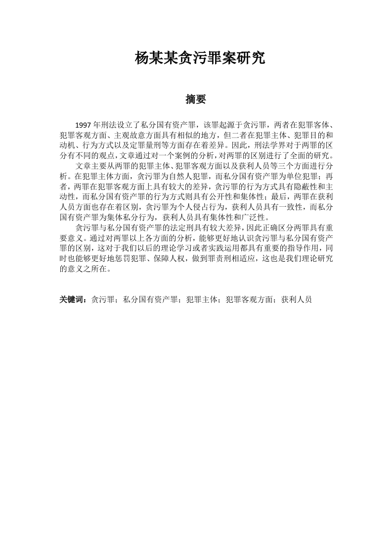 杨某某贪污罪案研究摘要1997年刑法设立了私分国有资产罪,该罪起源于贪污罪,两者在犯罪客体、犯罪客观方面、主观故意方面具有相似的地方,但二者在犯罪主体、犯罪目的和动机、行为方式以及定罪量刑等方面存在着差异。因此,刑法学界对于两罪的区分有不同的观点,文章通过对一个案例的分析,对两罪的区别进行了全面的研究。文章主要从两罪的犯罪主体、犯罪客观方面以及获利人员等三个方面进行分析。在犯罪主体方面,贪污罪为自然人犯罪,而私分国有资产罪为单位犯罪:再者,两罪在犯罪客观方面上具有较大的差异,贪污罪的行为方式具有隐蔽性和主动性,而私分国有资产罪的行为方式则具有公开性和集体性:最后,两罪在获利人员方面也存在着区别,贪污罪为个人侵占行为,获利人员具有一致性,而私分国有资产罪为集体私分行为,获利人员具有集体性和广泛性。贪污罪与私分国有资产罪的法定刑具有较大差异,因此正确区分两罪具有重要意义。通过对两罪以上各方面的分析,能够更好地认识贪污罪与私分国有资产罪的区别,这对于我们以后的理论学习或者实践运用都具有重要的指导作用,同时也能够更好地惩罚犯罪、保障人权,做到罪责刑相适应,这也是我们理论研究的意义之所在。关键词:贪污罪:私分国有资产罪:犯罪主体:犯罪客观方面:获利人员abstractThe crime of privately dividing state-owned assets is anewly established crime in the 1997 Criminal Law.It originatedfrom corruption.The two have similarities in the object ofcrime,the objective aspect of the crime,and the subjectiveand intentional aspect.There are differences in behavior,conviction and sentencing.Therefore,the criminal law scholarshave different views on the distinction between the two crimes.Through the analysis of a case,the article conducts acomprehensive study on the difference between the two crimes.The article mainly analyzes the crime subject,objectiveaspects of crime and profiteering of the two crimes.On thesub ject of crime,the crime of corruption is a natural personcrime,while the crime of privately dividing state-owned assetsis a unit crime.Furthermore,the two crimes have a largedifference in objective aspects of crime.The behavior ofcorruption is concealed and active,and the behavior of thecrime of privately dividing state-owned assets is public andcollective;finally,there are differences between the twocrimes in terms of profiteering.Corruption is an individualembezzlement,the profiteering is consistent,and the crime ofprivately dividing state-owned assets for the purpose ofcollective private distribution,the profiteering personnelare collective and extensive.The statutory penalty for the crime of embezzlement and thecrime of privately dividing state-owned assets is quitedifferent,so it is important to distinguish the two crimescorrectly.Through the analysis of the above two crimes,we canbetter understand the difference between the crime ofcorruption and the crime of privately dividing state-ownedassets.This has important guiding effects for our futuretheoretical study or practical application,and it can alsobetter punish crime,protection of human rights,and adaptationof crime,responsibility,and punishment are also thesignificance of our theoretical research.Keywords:the crime of corruption;the crime of privatelysharing state-owned assets;the subject of the crime;objectiveaspects of crime profited personnel