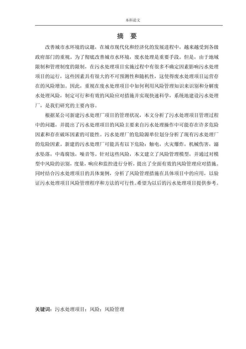 本科论文摘要改善城市水环境的议题,在城市现代化和经济化的发展进程中,越来越受到各级政府部门的重视。为了彻底改善城市水环境,废水处理是重要手段。但是,由于地域限制和管理制度的限制,在污水处理项目实施过程中有很多不确定因素影响污水处理项目的运行,这些因素具有很大的不可预测性和随机性,这使得废水处理项目运营存在的风险增加。因此,重视在废水处理项目中如何利用风险管理知识来识别和分解废水处理风险,制定可行和有效的风险应对措施并实现快速科学,系统地建设污水处理厂,是我们研究的主要内容。根据某公司新建污水处理厂项目的管理状况,本文分析了污水处理项目管理过程中的问题,并提出了污水处理项目的风险主要来自污水处理操作中可能存在许多危险因素和存在破坏因素的可能性。污水处理厂的危险源单位划分分析了现有污水处理厂的危险因素。新建的污水处理厂可能具有以下危险:触电,火灾爆炸,机械伤害,溺水坠落,中毒腐蚀,噪音等。针对这些风险,本文建立了风险管理模型,并通过对模型中风险的识别,度量,响应和监控进行分析,提出了全面有效的风险管理应对措施。同时结合污水处理项目的具体案例,分析了风险管理措施在具体项目中的应用,以验证污水处理项目风险管理程序和方法的可行性。希望为以后的污水处理项目提供参考。关键词:污水处理项目:风险:风险管理本科论文AbstractThe issue of improving the urban water environment has received increasing attentionfrom government departments at all levels in the process of urban modernization andeconomic development.In order to completely improve the urban water environment,wastewater treatment is an important means.However,due to geographical restrictions andmanagement system restrictions,there are many uncertain factors affecting the operation ofwastewater treatment projects during the implementation of wastewater treatment projects.These factors have great unpredictability and randomness,which makes the operation ofwastewater treatment projects exist.Increase in risk.Therefore,paying attention to how to userisk management knowledge to identify and decompose wastewater treatment risks inwastewater treatment projects,formulate feasible and effective risk response measures andachieve rapid scientific,systematic construction of wastewater treatment plants are the maincontents of our research.According to the management status of a company's new sewage treatment plant project,this paper analyzes the problems in the management of the sewage treatment project,and putsforward that the risk of the sewage treatment project mainly comes from the possibility ofmany dangerous factors and the possibility of damage in the sewage treatment operationHazardous source unit division of sewage treatment plant analyzed the risk factors of existingsewage treatment plant.The newly built sewage treatment plant may have the followingdangers:electric shock,fire and explosion,mechanical injury,drowning and falling,poisoning and corrosion,noise,etc.Aiming at these risks,this paper establishes a riskmanagement model,and analyzes the identification,measurement,response and monitoringof risks in the model,and proposes comprehensive and effective risk managementcountermeasures.At the same time,combined with the specific cases of sewage treatmentprojects,the application of risk management measures in specific projects is analyzed toverify the feasibility of the risk management procedures and methods of sewage treatmentprojects.Hope to provide reference for future sewage treatment projects.Keywords:sewage treatment project:risk:risk management本科论文目录第1章绪论1.1选题的背景和意义1.1.1选题的背景1.1.2选题的意义1.2研究内容1.3研究方法第2章安全风险评价理论基础和方法2.1安全风险评价理论基础32.1.1安全风险评价的内容.…2.1.2安全评价的分类2.1.3项目安全风险识别评价的原则和程序2.2项目安全风险评价方法…2.2.1安全检查表法(SCL)2.2.2预先危险性分析(PHA)…52.2.3故障类型和影响分析法(FMEA)第3章某公司新建污水处理厂项目安全风险识别3.1某公司新建污水处理厂项目概况.63.1.1某公司新建污水处理厂项目简介63.1.2某公司新建污水处理厂的有关公用设施3.2某公司新建污水处理厂原料固有危险性3.3某公司新建污水处理厂的主要危险有害因素识别.17第4章某公司新建污水处理厂安全风险评价.204.1评价单元划分.204.1.1评价单元划分原则4.1.2评价单元划分结果.…204.2安全风险评价.204.2.1选址及总平面布置单元安全风险评价.….204.2.2工艺流程及装置单元安全风险评价