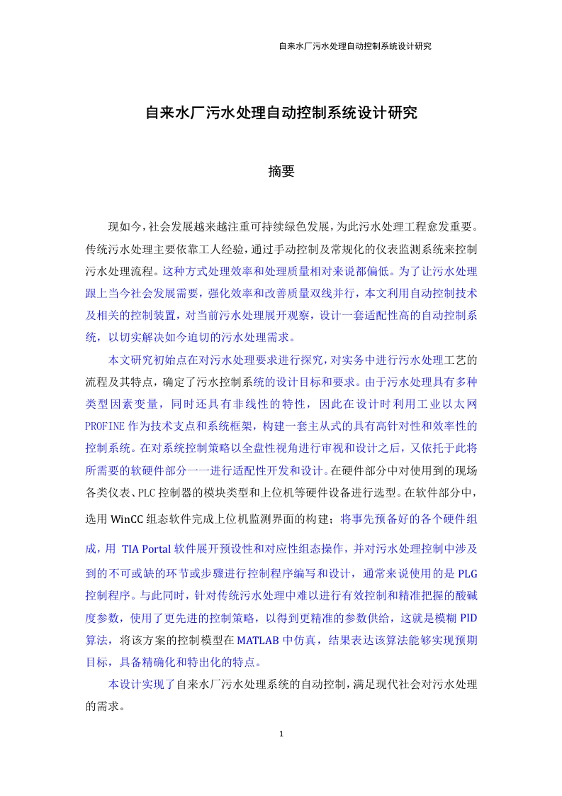 自来水厂污水处理自动控制系统设计研究自来水厂污水处理自动控制系统设计研究摘要现如今,社会发展越来越注重可持续绿色发展,为此污水处理工程愈发重要。传统污水处理主要依靠工人经验,通过手动控制及常规化的仪表监测系统来控制污水处理流程。这种方式处理效率和处理质量相对来说都偏低。为了让污水处理跟上当今社会发展需要,强化效率和改善质量双线并行,本文利用自动控制技术及相关的控制装置,对当前污水处理展开观察,设计一套适配性高的自动控制系统,以切实解决如今迫切的污水处理需求。本文研究初始点在对污水处理要求进行探究,对实务中进行污水处理工艺的流程及其特点,确定了污水控制系统的设计目标和要求。由于污水处理具有多种类型因素变量,同时还具有非线性的特性,因此在设计时利用工业以太网PROFINE作为技术支点和系统框架,构建一套主从式的具有高针对性和效率性的控制系统。在对系统控制策略以全盘性视角进行审视和设计之后,又依托于此将所需要的软硬件部分一一进行适配性开发和设计。在硬件部分中对使用到的现场各类仪表、PLC控制器的模块类型和上位机等硬件设备进行选型。在软件部分中,选用WiCC组态软件完成上位机监测界面的构建:将事先预备好的各个硬件组成,用TIA Portal软件展开预设性和对应性组态操作,并对污水处理控制中涉及到的不可或缺的环节或步骤进行控制程序编写和设计,通常来说使用的是PLG控制程序。与此同时,针对传统污水处理中难以进行有效控制和精准把握的酸碱度参数,使用了更先进的控制策略,以得到更精准的参数供给,这就是模糊PID算法,将该方案的控制模型在MATLAB中仿真,结果表达该算法能够实现预期目标,具备精确化和特出化的特点。本设计实现了自来水厂污水处理系统的自动控制,满足现代社会对污水处理的需求。自来水厂污水处理自动控制系统设计研究关键词:污水处理,PLC,MATLAB仿真,酸碱度自来水厂污水处理自动控制系统设计研究DESIGN AND RESEARCH ON AUTOMATIC CONTROLSYSTEM OF SEWAGE TREATMENT IN WATERWORKSABSTRACTNowadays,the social development is paying more and more attention tosustainable and green development,so the sewage treatment project is becomingmore and more important.Traditional sewage treatment mainly depends on theexperience of workers,through manual control and routine instrument monitoringsystem to control the sewage treatment process.In this way,the processing efficiencyand quality are relatively low.In order to make sewage treatment keep up with theneeds of today's social development,strengthen efficiency and improve qualityparallel,this paper uses automatic control technology and related control devices,toobserve the current sewage treatment,design a set of automatic control system withhigh adaptability,in order to effectively solve today's urgent sewage treatment needs.This paper studies the initial point in the sewage treatment requirements toexplore the practice of sewage treatment process and its characteristics,to determinethe design objectives and requirements of sewage control system.Because sewagetreatment has a variety of factors and variables,and also has nonlinear characteristics,so in the design of industrial Ethernet PROFINE as the technical fulcrum and systemframework,to build a master-slave control system with high targeted and efficiency.After inspecting and designing the control strategy from the perspective of the wholesystem,the hardware and software parts needed are developed and designed foradaption one by one.In the hardware part of the used field of all kinds of instruments,PLC controller module type and the upper computer and other hardware equipmentselection.In the software part,the construction of the monitoring interface of the