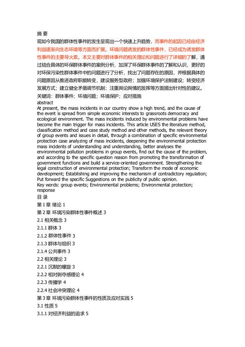 摘要现如今我国的群体性事件的发生呈现出一个快速上升趋势,而事件的起因已经由经济利益逐渐向生态环境等方面而扩展。环境问题诱发的群体性事件,已经成为诱发群体性事件的主要导火索。本文主要对群体事件的相关理论和问题进行了详细的了解,通过结合具体的环保群体事件的案例分析,加深了环保群体事件的了解和认识,更好的对环保污染性群体事件中的问题进行了分析,找出了问题存在的原因,并根据具体的问题原因从推进政府职能转变,建设服务型政府;加强环境保护法制建设;转变经济发展方式;建立健全矛盾调节机制;注重舆论舆情的发挥等方面提出针对性的建议。关键词:群体事件;环境问题;环境保护;应对措施abstractAt present,the mass incidents in our country show a high trend,and the cause ofthe event is spread from simple economic interests to grassroots democracy andecological environment.The mass incidents induced by environmental problems havebecome the main trigger for mass incidents.This article USES the literature method,dassification method and case study method and other methods,the relevant theoryof group events and issues in detail,through a combination of specific environmentalprotection case analyzing of mass incidents,deepening the environmental protectionmass incidents of understanding and understanding,better analyses theenvironmental pollution problems in group events,find out the cause of the problem,and according to the specific question reason from promoting the transformation ofgovernment fundtions and build a service-oriented government.Strengthening thelegal construction of environmental protection;Transform the mode of economicdevelopment;Establishing and improving the mechanism of contradictory regulation;Put forward the specific Suggestions on the publicity of public opinion.Key words:group events;Environmental problems;Environmental protection;response目录第1章绪论1第2章环境污染群体性事件概述32.1相关概念32.1.1群体32.1.2群体性事件32.1.3群体与组织32.1.4公共事件32.2相关理论32.2.1沉默的螺旋32.2.2相对剥夺感理论42.2.3传播学42.2.4社会冲突理论4第3章环境污染群体性事件的性质及应对实践53.1性质53.1.1对经济利益的追求53.1.2属于人民内部的矛盾53.2特征53.2.1进行集体性活动,追求的目标一致53.2.2行为过激53.2.3群体成员组织关系松散63.2.4预防及处理难度大63.3案例-对二甲苯环境污染事件63.3.1事件发生的原因63.3.2事件激化的原因73.3.3.事件的处理73.3.4事件造成的影响7第4章环境污染群体性事件的成因74.1片面追求经济利益74.2对环保问题的忽视84.3缺乏经济发展经验84.4政府服务职能的缺失84.5群众表达诉求途径的缺乏9第5章环境污染群体性事件预防及处理措施95.1推进政府职能转变,建设服务型政府95.1.1提升环保管理意识95.1.2完善行政管理体制95.1.3明确责任管理主体95.2加强环境保护法制建设105.2.1完善环境保护相关法律法规,做到有法可依105.2.2加强环境保护法制宣传,提高公民法制意识105.2.3依法追究污染环境渍任主体,提升司法公信力105.3转变经济发展方式115.3.1树立绿色发展理念115.3.2淘汰落后产能115.3.3培育新型环保产业115.4建立健全矛盾调节机制115.4.1完善信访制度,保障民意诉求115.4.2发挥社会组织作用,实现共同参与125.4.3完善社会预警机制125.5注重舆论舆情的发挥12结论13参考文献13第页第1章绪论随着我国经济社会的发展,社会发展过程存在的问题不断积聚,其中环境污染群体性事件最为突出。群体性事件波及范围广、破坏性大,而这些事件背后的成因问题性质复杂:既有社会层面的问题,也有经济层面的问题;既有社会发展中沉积的问题,也有新时代下产生的具有新时期特点的问题。这些成因交织、相互影响相互作用,使得这些群体性事件带来的社会问题激化,将可能扰乱正常社会秩序,不利于社会稳定,阻碍经济社会发展,影响公民生活和心理,损害河源政府形像。如何应对解决此类群体性事件,成为迫在眉睫的问题。群体事件是自发产生的,相对来说是没有组织的,甚至是不可预测的,它依赖于参与者的相互刺激。具有非制度参与的特点,同正常的社会关系不同,群体事件体现出不协调及不和谐的特点,集体行为更容易发生在团那些弱势群体的人群中,他们对各种资源的渴望与得不到的现实,会让他们产生挫折感,当这种感觉越来越严重时,就极有可能发生突发性群体事件1。当前,我国已经进入到全面建成小康社会的冲刺时期,加之当前国内外错综复杂的形势,各种潜在危机极易爆发出来,在这种时候,更加应该正确处理好改革、发展和稳定的关系。对于群体性突发事件的处理,处理得好,可以为地方经济社会发展营造一个好环境,为国家的全面深化改革也创造一个好的社会环境舆论环境、国际环境;与此同时,各级政府普遍对群体性突发事件的特征、原因等各类因素不了解,这样在处置起来就难以做蛭到有章可循、依法行政。陈晋胜认为,群体性事件是指由利益诉求相似的群体,在特定方面的利益长期分配不恰当经过比较产生的相对剥夺感的条件下,由突发事件诱导产生的聚众游行等对抗行为。这些对抗是利益失衡方发泄情绪的重要途径,也是对于完善的利益分配,改善政府管理有一定作用2。赵定东认为,群体性事件是出于某种目的聚集到一起群众,采用聚众上访、围堵或冲击党政机关等暴力或非暴力集体行为的方式以求维护自身利隘的事件3。李腊生认为,群体性事件主要有非法聚众上访