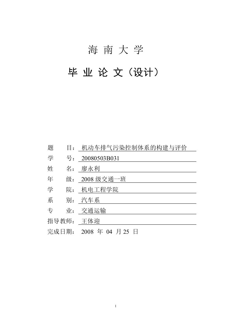 海南大学毕业论文(设计)题学目:机动车排气污染控制体系的构建与评价号:20080503B031姓名:廖永利年级:2008级交通一班学院:机电工程学院系别:汽车系专业:交通运输指导教师:王体迎完成日期:2008年04月25日摘要由于近年来我国机动车行业发展迅速,机动车保有量的高速增长是导致城市机动车污染加重的直接原因,全国机动车污染物排放总量持续攀升,因此,很有必要构建一套合理的机动车排气污染控制体系,揭示机动车排放特性以及由此形成的污染物的分布规律,有效地为中国机动车排气污染控制管理和决策服务。同时,对新构建的机动车排气污染控制体系的内容和方法作出客观的评价,引导我们正确的认识机动车排气污染对环境保护的重要性。2AbstractDue to the rapid development of China's motor vehicle industry in recent years,the rapid growth of vehicle population,led to the direct cause of urban motor vehiclepollution,increase the total amount of the national vehicle emissions continues to rise,so it is necessary to build a reasonable set of mobilevehicle exhaust pollution controlsystem,reveals the motor vehicle emission characteristics and the distribution of theresulting pollutants,effective management and decision-making services for theChinese motor vehicle exhaust pollution control.At the same time,an objectiveassessment of newly constructed motor vehicle exhaust pollution control system andmethod,lead us to a correct understanding of the importance of environmentalprotection of the motor vehicle exhaust pollution.Keywords:Motor vehicle:Exhaust:Pollution:Control system:Evaluation3