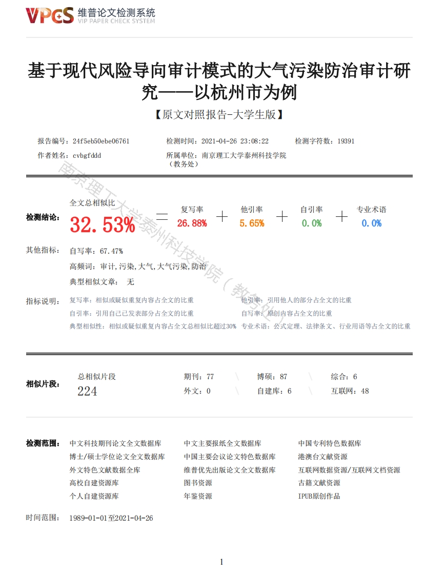 维普论文检测系统VIP PAPER CHECK SYSTEM基于现代风险导向审计模式的大气污染防治审计研究一一以杭州市为例【原文对照报告-大学生版】报告编号:24f5eb50ebe06761检测时间:2021-04-2623:08:22检测字符数:19391作者姓名:cvbgfddd所属单位:南京理工大学泰州科技学院(教务处)全文总相似比复写率他引率自引率专业术语检测结论:32.53%26.88%5.65%0.0%0.0%其他指标:自写率:67.47%典型相似文章:无院高频词:审计,污染,大气,大气污染,防治指标说明:复写率:相似或疑似重复内容占全文的比重他引率:引用他人的部分占全文的比重自引率:引用自己已发表部分占全文的比重自写率原创内容占全文的比重典型相似性:相似或疑似重复内容占全文总相似比超过30%专业术语:公式定理、法律条文、行业用语等占全文的比重总相似片段期刊:77博硕:87综合:6相似片段:224外文:0自建库:6互联网:48检测范围:中文科技期刊论文全文数据库中文主要报纸全文数据库中国专利特色数据库博士/硕士学位论文全文数据库中国主要会议论文特色数据库港澳台文献资源外文特色文献数据全库维普优先出版论文全文数据库互联网数据资源/互联网文档资源高校自建资源库图书资源古籍文献资源个人自建资源库年鉴资源IPUB原创作品时间范围:1989-01-01至2021-04-26维普论文检测系统VIP PAPER CHECK SYSTEM原文对照颜色标注说明:■自写片段■复写片段(相似或疑似重复)口引用片段(引用)■专业术语(公式定理、法律条文、行业用语等)1绪论1.1研究背景及意义1.1.1研究背景随着中国工业化和城镇化进展的不断加速,中国的经济和人们的生活水平得到了广泛的提高,但与此同时,大气质量却越来越差。人们的生存离不开大气,如果不对大气进行治理和防护,那么大气污染将会成为我国经济和人们生活发展的障碍,因此我们需要更加重视大气污染的防治。为了切实有效的改善大气质量,国家颁布了《中华人民共和国环境保护法》、《中华人民共和国大气污染防治法》和《中华人民共和国环境保护税法》,随后各地政府也都制定了一系列的防治措施,形成自上而下的防治政策框架。政府为此每年还投入了大量的资金,为了了解资金投入产出比、政府对大气污染治理的有效性,就需要审计机关对此进行审计。但是由于我国现阶段未能形城成熟的审计流程,审计机关的审计存在效率低下、审计证据不足现象,从而不能得出有效的审计结果,也不能进一步对大气污染防治工作提出相对有效建议,影响下一阶段大气污染防治工作开展。因此,大气污染防治审计已成为一个很重要的研究课题。本文基于上述背景,以杭州市大气污染防治为例,在现代风险导向审计理论的基础上,完成对杭州市的大气污染防治审计,并分析其大气污染防治的情况,就实施审计过程重的不足提出相应的建议。1.1.2研究意义(1)理论意义本文基于现代风险导向审计理念和SR理论,分析了杭州市大气污染防治情况,评价和分析杭州市大气污染防治的绩效,有助于完善大气污染防治审计的方法,并且有助于完善其他资源污染防治审计理论的研究。(2)现实意义本文对杭州市大气污染防治审计的分析,有助于该市更高效地对大气污染防治进行审计,也能获得充分的审计证据。我国大气污染防治审计的发展较晚,还未形成成熟可行的审计流程,对大气污染防治审计进行研究也有助于国家对大气污染的治理与发展指引。同时,对审计过程中出现的问题有效防范及治理,有利于优化审计流程,促进大气污染防治的工作。1.2文献综述1.2.1国外文献综述Sneana Ljubisavljevi,Luka Ljubisavljevi,Dejan Jovanovi(2017)本文首先参考相关的国外文献和实践,运用了分析、综合、类比等研究方法,提出了最合适的环境审计报告形式,并提出塞尔维亚共和国企业应对环境保护的建议。[26]Julia Hartmann,Stephan Vachon(2018)本文研究了行业背景的作用及其对环境管理和组织绩效之间关系的影响,并分析了30个行业代表的336家公司的纵向数据。[27]Awadhesh Prasad(2018)本书详细介绍了公共部门环境政策和项目的绩效审计。考察了全球环境绩效审计的趋2维普论文检测系统VIP PAPER CHECK SYSTEM势,以及对加拿大、印度和澳大利亚案例研究进行研究,总结出在进行绩效审计时面临的问题和挑战。[28]Anna Ruban,Lars Rydeén(2019)本文描述和分析了环境审计在乌克兰的引入、发展和实践,以及欧盟一一乌克兰一体化进程对环境审计的影响。[29]Anisimov,Popova(2019)分析考察了俄罗斯环境审计的框架,并确定了其在环境保护经济方法中的地位,呼吁达成国际协议并一致应用标准。[30]1.2.2国内文献综述范瑾(2017)首先分析了当前我国大气污染的环境绩效审计现状,总结出我国在加快推进大气污染的环境绩效审计方面存在的不足之处,提出了相应的建议。[1]顾莹(2018)首先简要介绍了大气污染防治审计的工作重点,紧接着就针对审计实施过程中的困境提出了相应的措施与解决方案以加大大气污染防治的审计监督力度。[2]李丽,孙文远(2018)本文以江苏省为例,借助PSR模型构建大气污染防治绩效审计评价指标体系,对其进行大气污染防治绩效审计评价。最后提出一些政策建议。[3]田崖018)本文就我国目前大气环境审计现状以及存在的问题进行探讨,并针对存在的问题提出改进建议。[4]于军华,刘成立218)文章从审计主体、审计范围、类型以及信息公开这四个不同角度比较我国的环境
