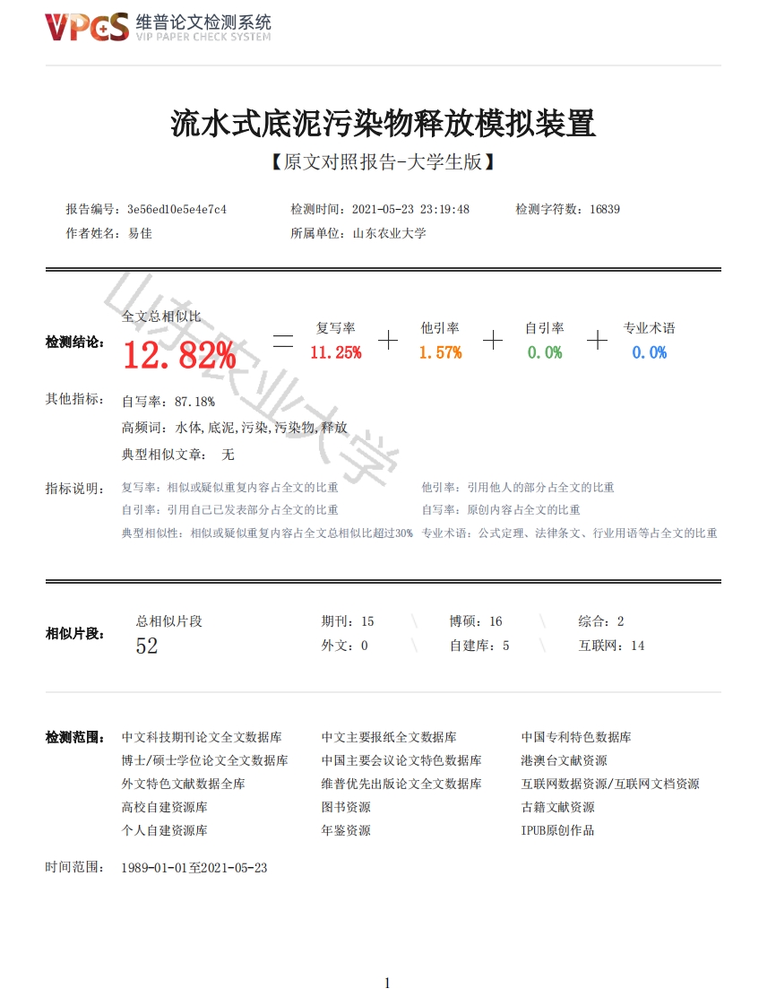 维普论文检测系统流水式底泥污染物释放模拟装置【原文对照报告-大学生版】报告编号:3e56edl0e5e4e7c4检测时间:2021-05-2323:19:48检测字符数:16839作者姓名:易佳所属单位:山东农业大学全文总相似比复写率他引率自引率专业术语检测结论:12.82%11.25%1.57%0.0%0.0%其他指标:自写率:87.18%高频词:水体,底泥,污染,污染物,释放典型相似文章:无指标说明:复写率:相似或疑似重复内容占全文的比重他引率:引用他人的部分占全文的比重自引率:引用自己已发表部分占全文的比重自写率:原创内容占全文的比重典型相似性:相似或疑似重复内容占全文总相似比超过30%专业术语:公式定理、法律条文、行业用语等占全文的比重总相似片段期刊:15博硕:16综合:2相似片段:52外文:0自建库:5互联网:14检测范围:中文科技期刊论文全文数据库中文主要报纸全文数据库中国专利特色数据库博士/硕士学位论文全文数据库中国主要会议论文特色数据库港澳台文献资源外文特色文献数据全库维普优先出版论文全文数据库互联网数据资源/互联网文档资源高校自建资源库图书资源古籍文献资源个人自建资源库年鉴资源IPUB原创作品时间范围:1989-01-01至2021-05-23维普论文检测系统VIP PAPER CHECK SYSTEM原文对照颜色标注说明:■自写片段■复写片段(相似或疑似重复)口引用片段(引用)■专业术语(公式定理、法律条文、行业用语等)山东农业大学装毕业论文订流水式底泥污染物释放模拟装置设计与试验线院部机械与电子工程学院专业班级农机2班届次2021届学生姓名易佳学号20177677指导教师张姬讲师二0二一年五月二十四日目录摘要IAbstractII引言11流水式底泥污染物释放模拟装置的总体结构设计21.1技术要求21.2产品技术研究31.3设计思路31.3.1优化装置结构41.3.2改良循环系统41.3.3样机整体运行41.4总体结构和工作原理51.4.1总体结构51.4.2工作原理62关键部件设计72.1河流模拟相似分析72.2装置设计参数要求72.2.1弯道的几何特性72.2.2水流参数82.3装置主要结构设计分析82.3.1环形水槽结构设计分析82维普论文检测系统VIP PAPER CHECK SYSTEM2.3.2轮扇结构设计分析92.3.3整体支架结构设计分析102.4本章小结113底泥污染物释放模拟装置的试验123.1试验材料和方法123.1.1试验装置123.1.2供试底泥和水样133.1.3试验方法133.1.4检测的主要指标和方法143.2试验参数及水力条件的选择143.2.1水深以及底泥厚度的选择143.2.2水力条件的确定143.3底泥污染物释放水槽模拟试验153.3.1底泥释放模型153.3.2模型的验证153.4结果分析与讨论153.4.1现象描述153.4.2流速对底泥悬浮物质的作用分析163.4.3结论183.5本章小结184总结与展望194.1主要结论194.2展望19大学参考文献21致谢23ContentsSummary IAbstractIIIntroduction 11 The overall structural design of the water-flowing mud release simulator 21.1 Technical requirement 21.2 Product Technology Research 31.3 Design Idea 31.3.1 Optimize unit structure 41.3.2 Improved Cycle System 41.3.3 Prototype Overall Run 41.4 Overall structure and how it works 51.4.1 Overall Structure 51.4.2 Works 62 Key component design 72.1 River Simulation Similar Analysis 72.2 Device design parameters requirement 72.2.1 Geometric properties of bends 72.2.2 Water flow parameter 82.3 Plant main structural design analysis 82.3.1 Ring sink structural design analysis 82.3.2 Wheel Fan Structure Design Analysis 93