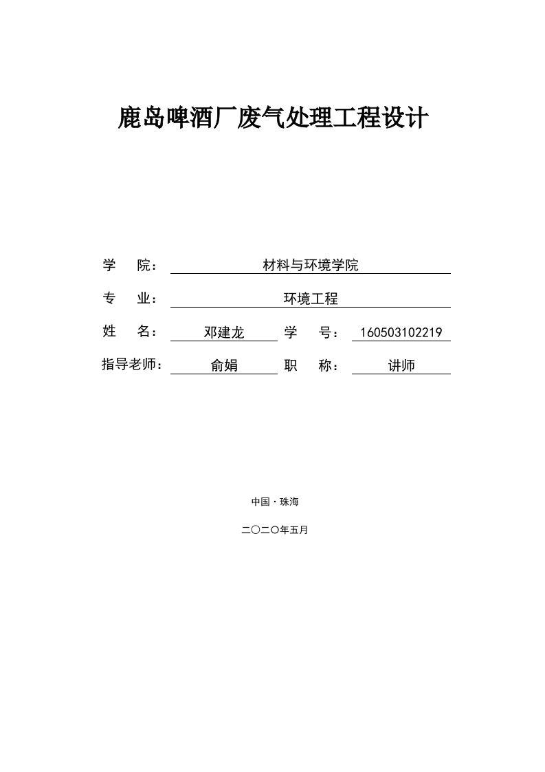 鹿岛啤酒厂废气处理工程设计学院:材料与环境学院专业:环境工程姓名:邓建龙学号:160503102219指导老师:俞娟职称:讲师中国·珠海北京理工大学珠海学院2020届本科生毕业设计鹿岛啤酒厂废气处理工程设计摘要随着我国工业的不断发展,啤酒工业也在不断扩大,啤酒工业所用燃煤锅炉所产出的废气的排放量也相应增加,污染程度加重。本项目设计的粉尘废气处理对象主要是广东省揭阳市鹿岛啤酒有限公司的啤酒生产中所有的粉尘废气,本设计的公司目前是国内一家啤酒年产30万千升的大型啤酒开发生产和进口企业。在其开发生产和进口啤酒的过程中,每年都会排放和产生34840万m的燃煤锅炉粉尘废气以及和燃煤的粉尘废气,燃煤的锅炉粉尘废气中。本设计过程中拟设计采用一种由布袋组成的除尘器和一种由石灰石组成的石膏除尘法以及以脱硫除尘器为主要核心的工艺对其污染物进行除尘处理。本文对广东省鹿岛除尘器公司概况以及公司在生产过程中的废气处理作了详细的说明,并且详细介绍了鹿岛布袋除尘器和鹿岛石灰石除尘器用石膏法脱硫的废气处理工艺流程。以及如何设计和计算处理过程的设计和构筑物,并且对工艺流程中的设计和处理构筑物作了详细的工艺设计计算和控制以及相关废气处理设备的选型。经过此工艺流程的设计和处理,废气的排放,能有效的达到广东省制定的地方废气排放标准《锅炉大气污染物排放限值》,(b44/765-2019)符合燃煤锅炉和《啤酒工业污染物排放标准》(gb19821-2005),实现达标排放,能有效的控制和减少工业废气对于大气环境的影响。本文关键词:燃煤啤酒工业废气:布袋除尘器:石灰石石膏法脱硫1北京理工大学珠海学院2020届本科生毕业设计Waste gas treatment engineering design of Ludao brewerySummaryWith the continuous development of China's industry,the beer industry insociety is also expanding.The emissions of coal-fired boilers used in the beer industryhave also increased accordingly,and the degree of pollution has increased.The treatment object of this design is all the waste gas in the production of JieyangLudao Beer Co.,Ltd.This company is a beer production enterprise with an annualoutput of 300,000 kiloliters.In the process of producing beer,it produces 348.4million m3 of boiler exhaust gas and dust exhaust gas every year.In the exhaust gasof coal-fired boilers,the flue gas generates a large amount of fine dust andsulfur-based gas due to the chemical composition of coal The sulfur reacts with themoisture in the air to produce acidic water vapor,which eventually forms acid rain,causing huge pollution to the natural environment.This design intends to use bagfilter and limestone gypsum desulfurization as the core process to deal with it.This article gives a detailed description of the general situation of KashimaCompany and the production waste gas,and introduces the treatment process of bagfilter and limestone gypsum desulfurization.As well as designing and calculating thestructure of the processing process,and made detailed design calculation andselection of related equipment for the processing structure in the process.After thetreatment of this process,the exhaust gas emissions can reach the Guangdongprovincial standard "Boiler Air Pollutant Emission Limits"(DB44 /765-2019)coal-firedboilers and "Beer Industry Pollutant Emission Standards"(GB19821-2005),Toachieve emission standards,can effectively reduce the impact of exhaust gas on theatmospheric environmentKeywords:beer waste gas;bag filter;limestone gypsum desulfurization2