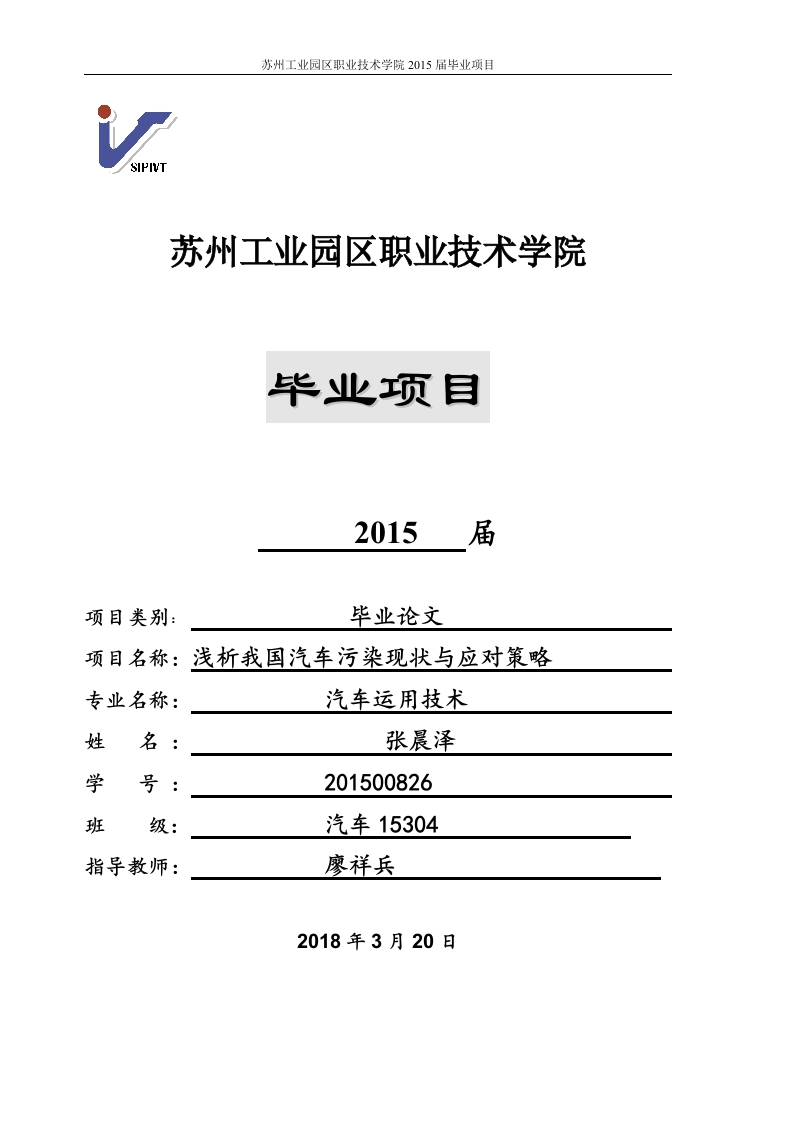 苏州工业园区职业技术学院2015届毕业项目SIPIVT苏州工业园区职业技术学院2015届项目类别:毕业论文项目名称:浅析我国汽车污染现状与应对策略专业名称:汽车运用技术姓名:张晨泽学号:201500826班级:汽车15304指导教师:廖祥兵2018年3月20日苏州工业园区职业技术学院2015届毕业项目目录Abstract......IV二、我国汽车污染现状.·11、汽车污染现状分析....2、汽车污染防治的政策..·2三、我国汽车污染防治存在的问题1、防治手段主要依赖行政命令..3、新能源汽车生产和消费不足4、公众参与意识和能力不足四、国外汽车污染防治经验1、美国.453、国外汽车污染治理经验的借鉴6五、针对我国汽车污染问题的应对策略1、完善法律法规.....2、提高汽车排放和燃油标准73、推进新能源汽车使用.·.4、引导公众参与..89苏州工业园区职业技术学院2015届毕业项目
