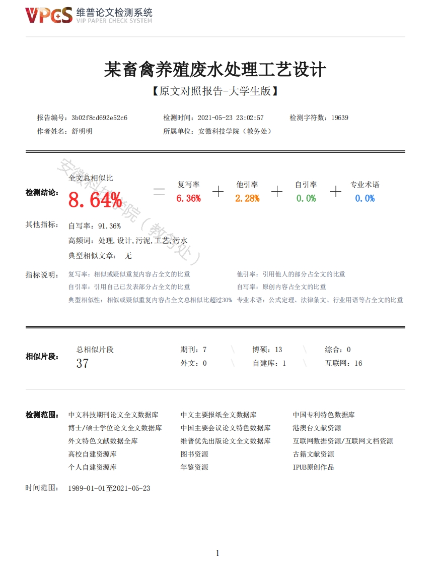 维普论文检测系统VIP PAPER CHECK SYSTEM某畜禽养殖废水处理工艺设计【原文对照报告-大学生版】报告编号:3b02f8cd692e52c6检测时间:2021-05-2323:02:57检测字符数:19639作者姓名:舒明明所属单位:安徽科技学院(教务处)全文总相似比复写率他引率自引率专业术语检测结论:8.64%6.36%2.28%0.0%0.0%其他指标:自写率:91.36%高频词:处理,设计,污泥,工艺,污水典型相似文章:无指标说明:复写率:相似或疑似重复内容占全文的比重他引率:引用他人的部分占全文的比重自引率:引用自己已发表部分占全文的比重自写率:原创内容占全文的比重典型相似性:相似或疑似重复内容占全文总相似比超过30%专业术语:公式定理、法律条文、行业用语等占全文的比重总相似片段期刊:7博硕:13综合:0相似片段:37外文:0自建库:1互联网:16检测范围:中文科技期刊论文全文数据库中文主要报纸全文数据库中国专利特色数据库博士/硕士学位论文全文数据库中国主要会议论文特色数据库港澳台文献资源外文特色文献数据全库维普优先出版论文全文数据库互联网数据资源/互联网文档资源高校自建资源库图书资源古籍文献资源个人自建资源库年鉴资源IPUB原创作品时间范围:1989-01-01至2021-05-23维普论文检测系统VIP PAPER CHECK SYSTEM原文对照颜色标注说明:■自写片段■复写片段(相似或疑似重复)口引用片段(引用)■专业术语(公式定理、法律条文、行业用语等)安徽科技学本科生毕业论文(设计)19502021年5月23日目录摘要IAbstractII1引言-1-2概况-2-2.1畜禽养殖废水的特点-2-2.2畜禽养殖废水处理现状-2-2.3项目意义-3-3设计概况-3-3.1设计目的-3-3.2设计范围-3-3.3设计依据-3-3.4设计原则-3-4进水水量、水质和出水标准-4-4.1进水水量-4-4.2进水水质-4-4.3出水标准-4-2维普论文检测系统VIP PAPER CHECK SYSTEM5工艺选择-4-5.1工艺的选择原则-4-5.2工艺的比选-5-5.2.1初沉池-5-5.2.2厌氧生物处理-6-5.2.3好氧生物处理-7-5.3工艺流程图及说明-10-5.3.1工艺流程图-10-5.3.2工艺说明-10-6主要构筑物的设计计算-11-6.1格栅-11-6.1.1设计参数-11-6.1.2设计计算-11-6.2调节池-136.3初沉池-14-6.3.1设计参数-14-6.3.2设计计算-14-6.4UASB反应器-16-6.5生物接触氧化池-19-6.5.1设计参数-19-6.5.2设计计算-19-6.6二沉池-21-6.6.1设计参数-21-6.6.2设计计算-21-6.7消毒池-23-6.7.1设计参数-23-6.7.2设计计算-23-6.8污泥浓缩池-23-6.8.1设计参数-23-6.8.2设计计算-23-6.9污泥脱水间-25-6.9.1设计参数-25-6.9.2设计计算-25-7总图布置-26-7.1平面布置-26-7.1.1平面布置的原则-26-7.1.2辅助建筑物的布置-26-7.2高程布置-26-7.2.1高程布置的原则-26-7.2.2水头损失-26-8总结-27-参考文献-28-致谢-30-摘要摘要:本设计的任务是对某畜禽养殖废水进行处理工艺的设计。所提供的进水水质为:Q=5000m3/d,3