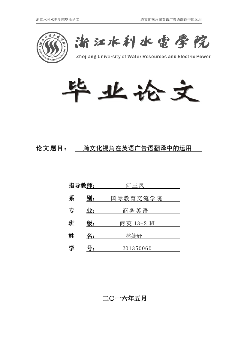 浙江水利水电学院毕业论文跨文化视角在英语广告语翻译中的运用斯江水利水電学院Zhejiang University of Water Resources and Electric Power毕业论文论文题目:跨文化视角在英语广告语翻译中的运用指导教师:何三凤系国际教育交流学院专商务英语班级:商英13-2班姓名:林婕妤学号:201350060二0一六年五月浙江水利水电学院毕业论文跨文化视角在英语广告语翻译中的运用摘要随着社会经济的高速发展以及国家之间联系的日益紧密,译者为了使不同文化之间更好的交流,必须反复斟酌其语言的表达才能更好的进行交流以及最大限度的达到广告的宣传作用,理解不同文化不同背景的人所表达出来的不同语言含义并进行正确的翻译是一个译者必备的素养。本文以跨文化的视角为出发点,阐述了文化及跨文化概念及形成的原因,如:地域和自然环境影响、社会和历史背景影响以及不同的生活习俗与文化背景影响等,深入探究了英语翻译中跨文化视角转换的意义,并基于文化特质视角、语篇策略视角、语域特征视角和语篇类型视角对跨文化视角在英语广告语翻译中的重要作用进行了分析,以期为提高翻译质量与效率,加深不同文化之间的交流提供有价值的参考。关键词:跨文化视角:英语翻译;广告翻译I浙江水利水电学院毕业论文跨文化视角在英语广告语翻译中的运用AbstractWith the rapid development between social economy and countriesbecome increasingly closer,the translator in order to make bettercommunication between different cultures,must be repeated asappropriate their language of expression in order to better communicateand to achieve maximum advertising campaign action,understand thedifferent cultures of people of different backgrounds to express themeaning of different languages and translators the correct translation is anecessary accomplishment.Taking the perspective of cross-cultural as astarting point to explain the culture and cross-cultural concept and thereasons for the formation,such as:geographical and the naturalenvironment,social and historical context impacts and different customsand backgrounds influence cultural life,delves into English translationIntercultural perspective -meaning and perspective based on culturalcharacteristics,policy discourse perspective,perspectives and registerfeatures Text type Angle important role in cross-cultural perspective inEnglish language translation of the ad were analyzed with a view toimproving the quality of translation and efficiency,deepen exchangesbetween different cultures provide a valuable reference.Key words:cross-cultural perspective;English translation;AdvertisingTranslation