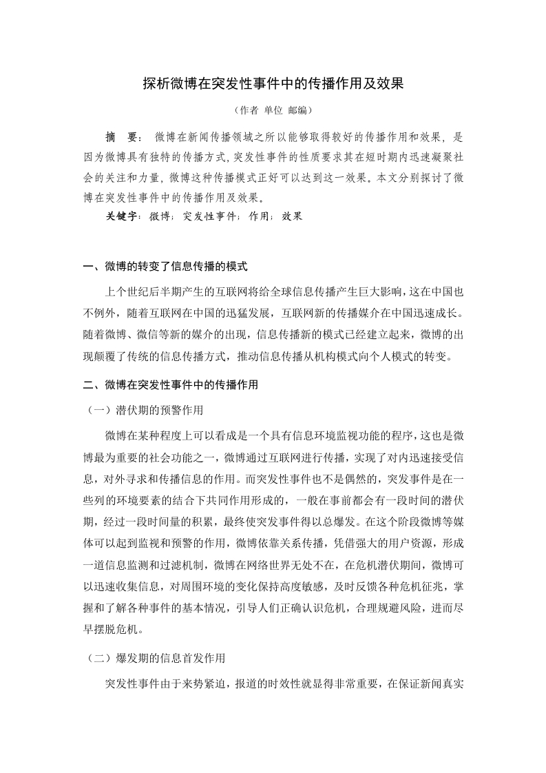 探析微博在突发性事件中的传播作用及效果(作者单位邮编)摘要:微博在新闻传播领域之所以能够取得较好的传播作用和效果,是因为微博具有独特的传播方式,突发性事件的性质要求其在短时期内迅速凝聚社会的关注和力量,微博这种传播模式正好可以达到这一效果。本文分别探讨了微博在突发性事件中的传播作用及效果。关键字:微博;突发性事件;作用;效果一、微博的转变了信息传播的模式上个世纪后半期产生的互联网将给全球信息传播产生巨大影响,这在中国也不例外,随着互联网在中国的迅猛发展,互联网新的传播媒介在中国迅速成长。随着微博、微信等新的媒介的出现,信息传播新的模式已经建立起来,微博的出现颠覆了传统的信息传播方式,推动信息传播从机构模式向个人模式的转变。二、微博在突发性事件中的传播作用(一)潜伏期的预警作用微博在某种程度上可以看成是一个具有信息环境监视功能的程序,这也是微博最为重要的社会功能之一,微博通过互联网进行传播,实现了对内迅速接受信息,对外寻求和传播信息的作用。而突发性事件也不是偶然的,突发事件是在一些列的环境要素的结合下共同作用形成的,一般在事前都会有一段时间的潜伏期,经过一段时间量的积累,最终使突发事件得以总爆发。在这个阶段微博等媒体可以起到监视和预警的作用,微博依靠关系传播,凭借强大的用户资源,形成一道信息监测和过滤机制,微博在网络世界无处不在,在危机潜伏期间,微博可以迅速收集信息,对周围环境的变化保持高度敏感,及时反馈各种危机征兆,掌握和了解各种事件的基本情况,引导人们正确认识危机,合理规避风险,进而尽早摆脱危机。(二)爆发期的信息首发作用突发性事件由于来势紧迫,报道的时效性就显得非常重要,在保证新闻真实的基础上做到最迅速的报道是媒体一直以来的追求,突发性事件爆发初期,由于大家对事件还不了解,信息不畅通容易引起内心人们的内心恐慌,在这个阶段新闻传播的速度成为最迫切的要求。微博与其它媒介相比,即时性是其最大的特点,也是其具有的重大优势,尤其在突发事件传播上,微博以亿万基数的网民为基础,在第一时间内向周围扩散信息,微博改变了传统媒体对事件的传播方式。(三)扩散期的助推问题解决作用突发事件涉及到社会生活的各个领域,在危机扩散期,社会各个方面的时间需要进一步了解,对事情的进展需要进一步把握,故而需要媒体对突发性事件进行跟踪报道。在事件的扩散期,媒体需要挖掘事件的深度,挖掘事件背后深层次的原因,微博的在这一阶段的主要优势是其可以进行全方位、多层次、多角度的信息传播,具有传统媒体不具有的优势,微博全景式的报道可以满足各方面的信息需求,动员社会底层力量,进而达到促进事件解决的目的,首先,微博可以突发性事件打破的人民的心理平衡进行抚慰,突发事件的突发性造成短时间内信息流通的空白,微博正好可以以其快速动员能力打破这一空白,同时,由于突发性事件给人们精神带来的冲击,甚至会给人们的心理带来创伤,微博迅速凝聚社会力量,进而起到推动事件解决的目的:其次,微博可以迅速凝聚社会各界力量,弥补突发性事件造成的危害,在危机扩散阶段,突发性事件的影响会迅速扩散,需要在短时间内调到各种力量,而媒体尤其是微博就成为最佳的凝聚力量的平台,微博融合了多种传播渠道,汇集的信息较为全面,参与的人数众多,能在短时间内形成讨论的焦点和热点。三、微博在突发性事件中的传播效果(一)个人成为信息的制造者和传播者微博真正实现了信息传播的个人化。过去信息传播一般是信息制造者找到信息传播机构,信息传播机构再把信息传播出去。这个过程不仅在时间上非常漫长,而且信息制造者需要向信息传播机构支付巨额的费用。而微博注册的门槛较低,不需要任何费用,信息发布只需发布者个人把关,而无需其它任何监管机构或个人的审核,故而形成“人人都是麦克风”的效果。微博信息不仅传播方便,而且评论也方便,近年来微博在玉树地震以及江西“宜黄事件”中表现了自己独特的传播效率和传播作用。(二)信息传播的裂变式效果微博信息传播没有把关人,这和传统的信息传播有很大不同,微博信息可以事先多种传播模式,传播者可以任意选择一对一、一对多、多对多的传播模式,每个上微博的人既可以成为信息传播的起点,也可以成为信息传播的终点,这种传播速度和传播模式,是以为其它任何媒体都无法比拟的,具有重要的及时性优势,超出了以往任何媒介的传播速度和广度,信息能在一个短时期能得到迅速的传播,有时一个在一天之内可以实现百万次的传播,万人以上的评论,实现了信息的裂变式传播,代表互联网技术下信息传播的特点。(三)信息互动及时性效果微博由于其门槛低,信息发布也没有监管者,故而微博在本质上可以看成是一个互动平台,每个个体都可以经营自己的微博,经营较好的微博在一定时期后会有一批忠实的粉丝,这些分析可以博主可以通过多种形式进行互动交流。另外,微博的另一个优势是场外的观众可以通过媒体公布的具有公信力的官方微博和传统媒体进行互动,微博和传动媒体的结合在一系列突发事件中变现出了良好效果,传统媒体可以通过微博及时收集到最新信息,了解一线人群的最新的动态,而且,传