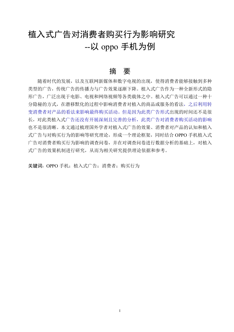 植入式广告对消费者购买行为影响研究-以oppo手机为例摘要随着时代的发展,以及互联网新媒体和数字电视的出现,使得消费者能够接触到多种类型的广告,传统广告的传播力与广告效果逐渐下降。植入式广告作为一种全新形式的隐形广告,广泛出现于电影、电视和网络视频等各类载体之中。植入式广告可以通过一种十分隐秘的方式,在潜移默化的过程中影响消费者对植入的商品或服务的看法,之后利用转变消费者对产品的看法来影响最终购买活动。但是因为此类广告形式出现的时间还不是很长,对此类植入式广告还没有开展深刻且完善的分析,此类广告对消费者购买活动的影响也不是很清晰。本文通过梳理国外学者对植入式广告的效果、消费者对产品的认知和植入式广告与对购买行为的影响等研究理论,形成一个理论框架,同时结合OPPO手机植入式广告对消费者购买行为影响的调查问卷,并在对调查问卷进行数据分析的基础上,对植入式广告的效果机制进行研究,从而为相关研究提供理论依据和参考。关键词:OPPO手机:植入式广告:消费者;购买行为Research on the impact of implantable advertising on consumer buying behavior--Take OPPO mobile phone as an exampleAbstractWith the development of the times and the emergence of new media and digital TV,consumers can get into many kinds of advertisements,and the transmission power andadvertising effect of traditional advertisements are decreasing.As a new form of invisibleadvertising,implantable advertising is widely used in various kinds of carriers such as film,television and network video.Product placement can affect consumers'attitude towardsimplanted products or services in a very secretive way,and then affect consumers'purchasebehavior by changing consumers'attitude towards products.However,due to the fact that thetime of product placement is not very long,there is not a comprehensive and in-depth researchon product placement,and the impact of product placement on consumer purchase behavior isnot very clear.By reviewing the foreign scholars on the Product placement effect,consumerawareness of the product and Product placement and the purchase behavior influence researchtheory,formed a theoretical framework,the questionnaire at the same time combined with theeffect of OPPO mobile phone Product placement on consumer behavior,and analyze the basicdata of questionnaire,research the effect mechanism of Product placement,so as to provide atheoretical basis and reference for related research.Keywords:OPPO mobile phone;Implantable Advertisement;Consumer;Purchase Behavior目录Abstract.....1绪论1.1研究背景…12研究目的与研究意义.…13研究方法与研究内容2文献综述…22.1广告营销的理论综述22.2植入式广告的概念323国外学者的植入式广告理论综述32.4国内植入式广告相关理论综述43OPPO手机植入式广告研究43.1研究内容与假设.…3.1.1有限注意力和广告时长…43.1.2ADA理论和广告创意3.13阈下知觉的刺激方式和广告表现效果3.2调查问卷的设计.633调查方法…3.4植入式广告与OPPO购买行为统计…63.4.】被试样本概况.63.4.2信效度分析73.4.3植入式广告的投放效果….83.4.4消费者对OPPO植入式广告时长和创意的看法与态度.…....................93.3.5OPP0植入式广告对消费者购买行为的影响.4解决OPPO手机植入式广告存在问题的对策.144.1提升广告创意…4.2合理安排植入式广告时长154.3增加植入式广告的表现手法5结语.16参考文献:17致谢.18附录-调查问卷