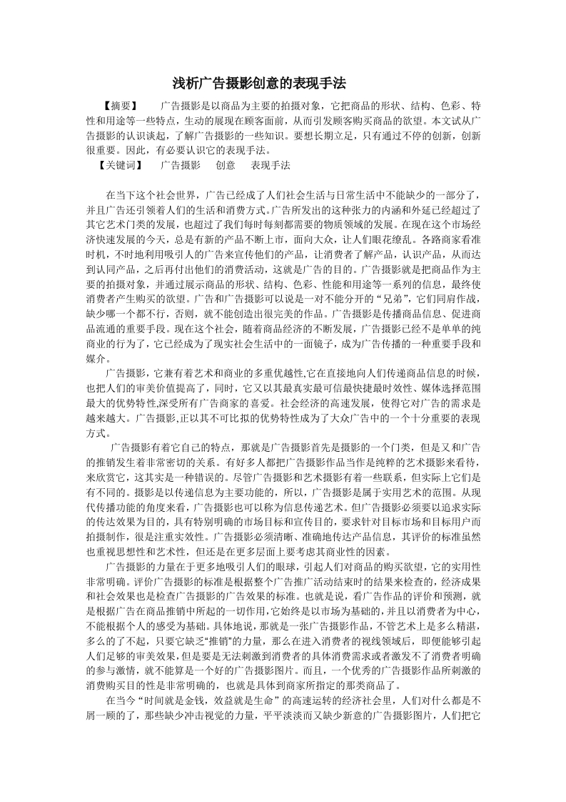浅析广告摄影创意的表现手法【摘要】广告摄影是以商品为主要的拍摄对象,它把商品的形状、结构、色彩、特性和用途等一些特点,生动的展现在顾客面前,从而引发顾客购买商品的欲望。本文试从广告摄影的认识谈起,了解广告摄影的一些知识。要想长期立足,只有通过不停的创新,创新很重要。因此,有必要认识它的表现手法。【关键词】广告摄影创意表现手法在当下这个社会世界,广告己经成了人们社会生活与日常生活中不能缺少的一部分了,并且广告还引领着人们的生活和消费方式。广告所发出的这种张力的内涵和外延己经超过了其它艺术门类的发展,也超过了我们每时每刻都需要的物质领域的发展。在现在这个市场经济快速发展的今天,总是有新的产品不断上市,面向大众,让人们眼花缭乱。各路商家看准时机,不时地利用吸引人的广告来宣传他们的产品,让消费者了解产品,认识产品,从而达到认同产品,之后再付出他们的消费活动,这就是广告的目的。广告摄影就是把商品作为主要的拍摄对象,并通过展示商品的形状、结构、色彩、性能和用途等一系列的信息,最终使消费者产生购买的欲望。广告和广告摄影可以说是一对不能分开的“兄弟”,它们同肩作战,缺少哪一个都不行,否则,就不能创造出很完美的作品。广告摄影是传播商品信息、促进商品流通的重要手段。现在这个社会,随着商品经济的不断发展,广告摄影己经不是单单的纯商业的行为了,它己经成为了现实社会生活中的一面镜子,成为广告传播的一种重要手段和媒介。广告摄影,它兼有着艺术和商业的多重优越性,它在直接地向人们传递商品信息的时候,也把人们的审美价值提高了,同时,它又以其最真实最可信最快捷最时效性、媒体选择范围最大的优势特性,深受所有广告商家的喜爱。社会经济的高速发展,使得它对广告的需求是越来越大。广告摄影,正以其不可比拟的优势特性成为了大众广告中的一个十分重要的表现方式。广告摄影有着它自己的特点,那就是广告摄影首先是摄影的一个门类,但是又和广告的推销发生着非常密切的关系。有好多人都把广告摄影作品当作是纯粹的艺术摄影来看待,来欣赏它,这其实是一种错误的。尽管广告摄影和艺术摄影有着一些联系,但实际上它们是有不同的。摄影是以传递信息为主要功能的,所以,广告摄影是属于实用艺术的范围。从现代传播功能的角度来看,广告摄影也可以称为信总传递艺术。但广告摄影必须要以追求实际的传达效果为目的,具有特别明确的市场目标和宣传目的,要求针对目标市场和目标用户而拍摄制作,很是注重实效性。广告摄影必须清晰、准确地传达产品信息,其评价的标准虽然也重视思想性和艺术性,但还是在更多层面上要考虑其商业性的因素。广告摄影的力量在于更多地吸引人们的眼球,引起人们对商品的购买欲望,它的实用性非常明确。评价广告摄影的标准是根据整个广告推广活动结束时的结果来检查的,经济成果和社会效果也是检查广告摄影的广告效果的标准。也就是说,看广告作品的评价和预测,就是根据广告在商品推销中所起的一切作用,它始终是以市场为基础的,并且以消费者为中心,不能根据个人的感受为基础。具体地说,那就是一张广告摄影作品,不管艺术上是多么精湛,多么的了不起,只要它缺乏“推销”的力量,那么在进入消费者的视线领域后,即便能够引起人们足够的审美效果,但是要是无法刺激到消费者的具体消费需求或者激发不了消费者明确的参与激情,就不能算是一个好的广告摄影图片。而且,一个优秀的广告摄影作品所刺激的消费购买目的性是非常明确的,也就是具体到商家所指定的那类商品了。在当今“时间就是金钱,效益就是生命”的高速运转的经济社会里,人们对什么都是不屑一顾的了,那些缺少冲击视觉的力量,平平淡淡而又缺少新意的广告摄影图片,人们把它们看作是“视觉垃圾”,觉得有碍观瞻,在这当中,当然也有少量广告作品的形式和内容能给人以耳目一新,有种意想不到、春意盎然的感觉,这样的广告作品给人们留下了深刻的印象,让深深人们记住了广告的内容。广告效果为什么会有这样极大的反差呢?探究其深一层的原因,我想,这个差别的重要因素应该是广告摄影的创意带来的结果。创意,在英文中叫Creation,这是广告活动的专用词汇,按照中文的意思解释就是构思。广告摄影创意是指将广告对象视觉化的阶段,对实现广告策划中广告摄影主题图像化的“金点子”,它是经过构思、创新、视觉化、艺术化、形象化的创造过程。如果一个广告摄影仅仅只有一个明确的主体,没有一个超好的创意,它就只能是再现商品的表面了,更谈不上表现什么产品的本质。因此,广告摄影有没有创意,创意表现是不是正确,是决定广告作品的优劣。怎样提高广告摄影的创意呢,那就需要了解一下广告摄影创意的表现手法。广告摄影创意是一门创造性的艺术,与广告创意一样都要有创造性的思维能力和创新的技术、技巧。首先就得要改变传统思维定势,敢做别人不敢做的,敢于突破、开拓。其次要熟悉拍摄的对象,如,产品、企业、服务等,由此展开创造性思维,使拍摄的对象和消费者的心理、社会的生活相融和,发现拍摄对象新颗的载体。然后要有独特的拍摄角度、背景、情感及技术。具体手法如下:1、直接展示