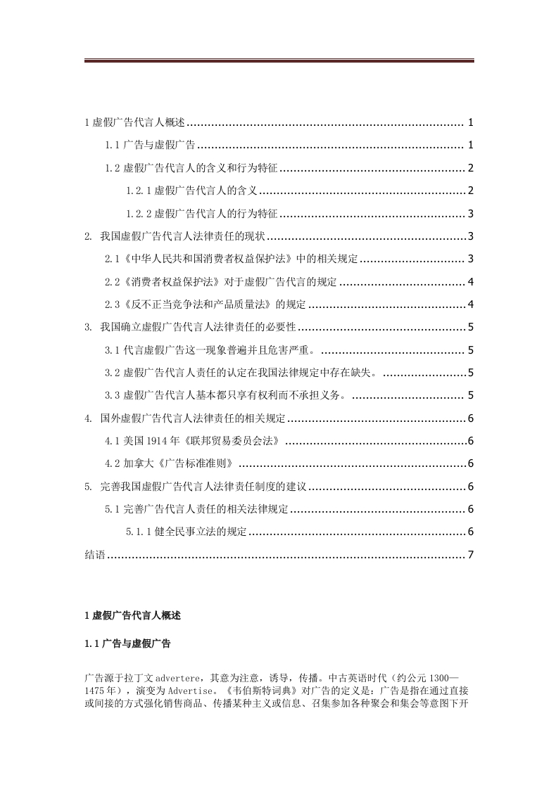 1虚假广告代言人概述…11.1广告与虚假广告.…11.2虚假广告代言人的含义和行为特征.1.2.1虚假广告代言人的含义1.2.2虚假广告代言人的行为特征.2.我国虚假广告代言人法律责任的现状..…2.1《中华人民共和国消费者权益保护法》中的相关规定..32.2《消费者权益保护法》对于虚假广告代言的规定2.3《反不正当竞争法和产品质量法》的规定..43.我国确立虚假广告代言人法律责任的必要性..53.1代言虚假广告这一现象普遍并且危害严重。…53.2虚假广告代言人责任的认定在我国法律规定中存在缺失。.53.3虚假广告代言人基本都只享有权利而不承担义务。…54。国外虚假广告代言人法律责任的相关规定.64.1美国1914年《联邦贸易委员会法》64.2加拿大《广告标准准则》5.完善我国虚假广告代言人法律责任制度的建议,5.1完善广告代言人责任的相关法律规定5.1.1健全民事立法的规定1虚假广告代言人概述1.1广告与虚假广告广告源于拉丁文advertere,其意为注意,诱导,传播。中古英语时代(约公元l300一1475年),演变为Advertise。《韦伯斯特词典》对广告的定义是:广告是指在通过直接或间接的方式强化销售商品、传播某种主义或信总、召集参加各种聚会和集会等意图下开展的所有告之性活动的形式。根据广告的内容我们可以将广告分为:商业广告,文化广告,社会广告,政府广告。这几种广告中,我国广告法第二条规定:“本法所称广告,是指商品经营者或者服务提供者承担费用,通过一定媒介和形式直接或者间接地介绍自己所推销的商品或者所提供的服务的商业广告。”如果是正面且真实的广告,其传播有利于推销商品,便捷人们的生活,推进社会的发展。但是,随着广告业的蓬勃发展的同时,大量虚假广告的出现,对生产者与经营者之间公平竞争起到了破坏的作用,严重的影响了人们正常的生活秩序那么,什么是虚假广告?故意制造假相、隐瞒事实真相并可能使他人误解上当的行为的广告都属于虚假广告的范畴,彭万林教授主编的《民法学》对欺诈下的界定是:“欺诈是当事人一方故意捏造虚假情况,或歪曲、掩盖真实情况,使表意人陷于错误认识,并因此作出不合真意的意思表示。”其中广告主利用这种不法行为欺诈消费者,使其蒙受损失。在我国,现行的法律法规中对于虚假广告有多处的阐述。《反不正当竞争法》第九条对制作虚假广告的行为明确予以禁止:“经营者不得利用广告或者其他方法,对商品的质量、制作成分、性能、用途、生产者、有效期限、产地等作引人误解的虚假宣传。广告的经营者不得在明知或者应知的情况下,代理、设计、制作、发布虚假广告。”新消费者权益保护法第二十条第一款:“经营者向消费者提供有关商品或者服务的质量、性能、用途、有效期限等信息,应当真实、全面,不得作虚假或者引人误解的宣传。”除此之外还有《食品安全法》《药品管理法》等等。但是,这些现行法规仅仅对于虚假广告的后果以及处理做了一些硬性规定,并没有对虚假广告这一概念做明确的解释与界定。在法律尚未明确界定虚假广告定义的情况下,我们不妨将虚假广告概括为:广告主、广告经营者和广告发布者为牟取非法利益而在广告中采用欺诈性的手段,对商品或服务的主要内容作不真实的或引人误解的表示,导致或足以导致消费者对其产生高期望值从而做出错误判断的广告。综上所述,笔者认为:虚假广告,是指商品宣传的内容与所提供的商品或者服务的实际质量不符故意隐瞒消费者,使宣传对象或受宣传影响的人对商品的真实情况产生错误的联想,从而影响其购买决策的商品宣传的广告行为。1.2虚假广告代言人(已修改)在广告中我们总能看到这样的身影,他们在广告的传播过程中扮演重要的讯总来源角色,那就是广告代言人。并且根据其所具有之说服力对消费者产生影响.Friedman(1979)将广告代言人类型分为名人,专家,典型消费者三类,其中「名人」说服力的来源主要是依赖吸引力:「专家」说服力来源主要是依赖专业性:「典型消费者」说服力的来源主要是依赖相似与可靠度。而这些人,便是为虚假广告提供“事实依据和见证效果”的表演者。例如:李丁代言的XX钙片,很多明星都为某钙片做过代言,但他自己腿脚都己经不利索了,还在广告片中宣传该产品的疗效,说老年人吃这种产品多么多么必要,吃过之后身体多好多好。还有央视“3·15”晚会爆出郭德纲代言的某减肥茶广告涉嫌虚假广告,代言的产品经专家鉴定,与藏茶没有关系,该产品使用的商标正在受理尚未批准,该产品是其老产品易名后更换包装重新上市的,属未经批准的违规行为。晚会中还播出了一段该产品电视广告的原音:“郭老师,您这一次为某某做代言,请问您敢为自己的行为负责吗?”“当然敢了,这是关系到人身安全的问题,不能掉以轻心。”这些都是虚假广告代言人的有效案例,他们在广告中宣称该种产品的疗效如何,并且将自身用后的效果夸大,甚至自己都没用过该种产品,只是为了对其虚假的成分进行宣传从而编造一些对产品宣传有利的言论,对广大消费者进行欺骗和误导。所以,虚假广告代言人应该是在商业广告中,利用自己的外貌、语音、表演及社会地位和美誉等自身资源,故意制造假相、隐瞒事实真相,借助各种形式的传播媒介为企业或其产品、服务传递信息、提供佐证,直接或间接地向消