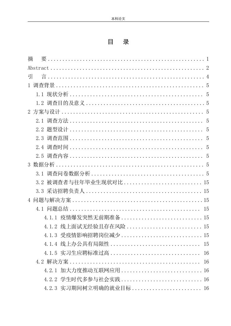 本科论文目录摘要.Abstract··引451.1现状分析...51.2调查目的及意义52方案与设计52.1调查方法52.2题型设计..52.3调查范围..52.4调查时间52.5调查内容..553.2被调查者与往年毕业生现状对比151515154.1.1疫情爆发突然无前期准备..154.1.2线上面试无经验且存在风险154.1.3受疫情影响招聘岗位减少.154.1.4线上办公具有局限性....154.1.5实习生应聘标准过高..16164.2.1加大力度推动互联网应用...164.2.2学生时代多参与社会实践...1616本科论文结论1820附录1调查问卷22致24本科论文摘要2019年12月我国突发疫情一一新型冠状肺炎,这次疫情突发给我国各行各业都造成了非常严重的影响。为了减轻疫情蔓延的程度,我国在一月中旬陆续开始封城、封村、停产、停工、停学等措施。人民经济受到很大影响,同时教育方面也处于暂停状态。2020届毕业生的实习工作也出现了离职、被迫停工在家的状态。2020年3月疫情逐渐好转,一些企业开始采用线上招聘、线上办公的形式。线上办公、线上招聘这将是2020年上半年众多企业复工的主要方式。2020届刚走出校门的实习生们还未摸清校门以外的工作路子,却又面临着线上工作,线上复工复产,这对于他们来讲是机遇同时也是挑战。线上办公与线下办公虽然是做同一份工作内容,但是工作状态、沟通协调却有很大区别。线上面试、远程办公、线上招聘会、线上答辩等许多线下工作转为线上,这是2020届毕业生所面临的趋势。新闻与传播专业毕业生的工作内容大多数符合线上办公,但是受疫情影响很多同学的工作计划被打乱。不同时期面临不同的工作困难,随机应变是每一名毕业生应该具备的重要技能之一。做此调查及分析,意在总结出疫情突发时各就业单位的工作方式及要求,能够让学弟学妹尽早了解就业情况,面试方式。同时为各学院提供学生与岗位之间的可能产生的矛盾和问题,学院可以根据今年疫情带来的突发状况,结合以往面试、工作的情况,为学生准备面试、实践等演习训练,打破学生们的“内心防线”。就业情况:本科:调查报告