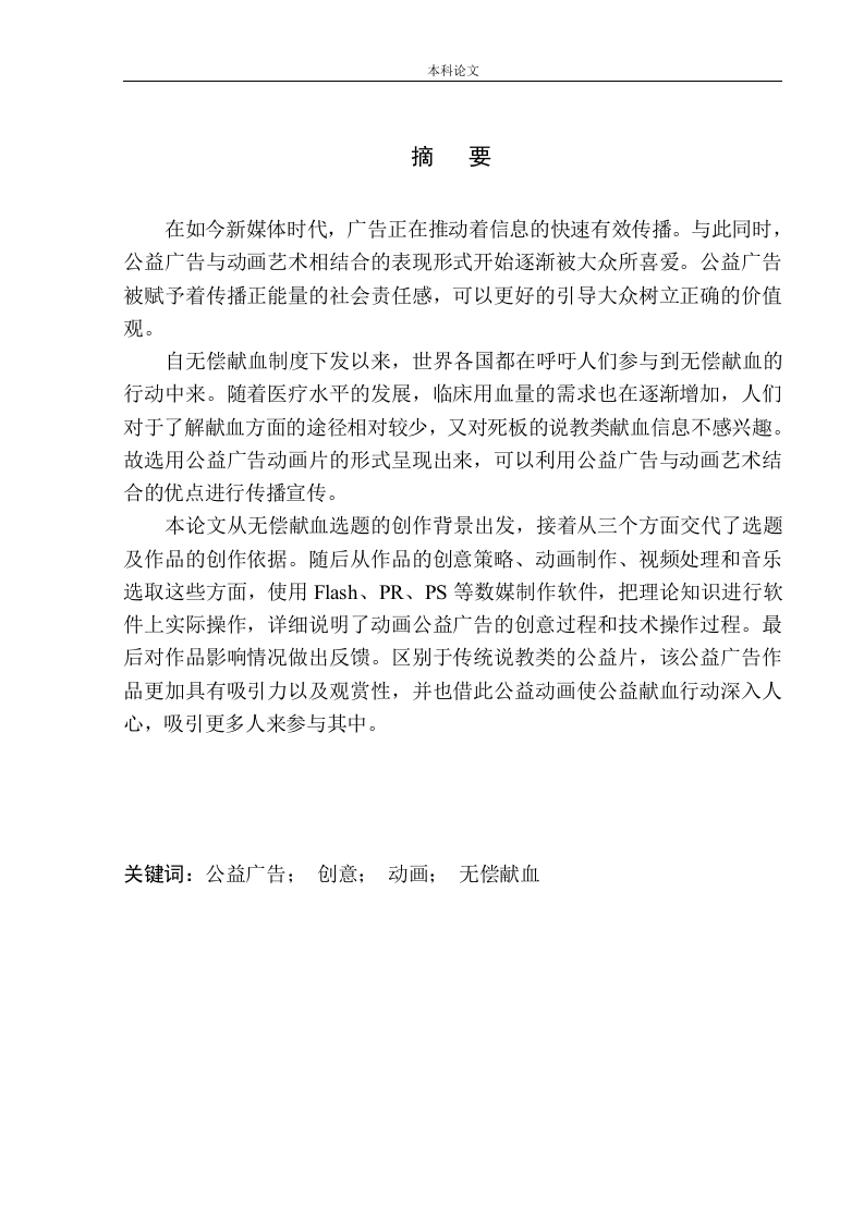 本科论文摘要在如今新媒体时代,广告正在推动着信息的快速有效传播。与此同时,公益广告与动画艺术相结合的表现形式开始逐渐被大众所喜爱。公益广告被赋予着传播正能量的社会责任感,可以更好的引导大众树立正确的价值观。自无偿献血制度下发以来,世界各国都在呼吁人们参与到无偿献血的行动中来。随着医疗水平的发展,临床用血量的需求也在逐渐增加,人们对于了解献血方面的途径相对较少,又对死板的说教类献血信息不感兴趣。故选用公益广告动画片的形式呈现出来,可以利用公益广告与动画艺术结合的优点进行传播宣传。本论文从无偿献血选题的创作背景出发,接着从三个方面交代了选题及作品的创作依据。随后从作品的创意策略、动画制作、视频处理和音乐选取这些方面,使用Flash、PR、PS等数媒制作软件,把理论知识进行软件上实际操作,详细说明了动画公益广告的创意过程和技术操作过程。最后对作品影响情况做出反馈。区别于传统说教类的公益片,该公益广告作品更加具有吸引力以及观赏性,并也借此公益动画使公益献血行动深入人心,吸引更多人来参与其中。关键词:公益广告:创意:动画:无偿献血本科论文AbstractIn today's new media era,advertising is promoting the rapid and effectivedissemination of information.At the same time,the expression of thecombination of public service advertisement and animation art began to be lovedby the public gradually.Public service advertising is endowed with a sense ofsocial responsibility to spread positive energy,which can better guide the publicto establish correct values.Since the free blood donation system was issued,all countries around theworld are calling for people to participate in the free blood donation action.Withthe development of medical level,the demand of clinical blood volume isincreasing gradually,people are relatively few in understanding the way ofblood donation,and are not interested in the rigid information of preachingblood donation.So choose to use the form of public service advertisinganimation presented,can use the advantages of the combination of publicservice advertising and animation art to spread publicity.This thesis starts from the background of the selection of free blooddonation,and then explains the selection of the topic and the basis of thecreation of the work from three aspects.From the creative strategy of the work,animation production,video processing and music selection of these aspects,using Flash,PR,PS and other digital media production software,the theoreticalknowledge of the software on the actual operation,detailed description of thecreative process of animation public service advertising and technical operationprocess.Finally,feedback on the impact of the work.The public service film,which is different from the traditional preaching,is more attractive andornamental,and it is also used to make the public service blood donation actionpopular and attractive a lot of people.Keywords:public service advertisement;creativity;animation;blood donation本科论文引言随着新媒体时代的来临,人们的信息获取和认知方式发生了空前的改变。新媒体在当今社会中,与人们的生活有着越来越紧密的联系。广告也是在我们的生活中随处可见。现如今,新媒体本着其传播速度快、信息传播范围广等特点,已经成为大众接收信息的新平台。广告作为新媒体中的一项重要的传播媒介,也在推动着信息的传播范围与效率。公益广告也借此有了更好的发展前景以及价值。随着我国医疗水平的不断发展,各个国家对临床用血量的需求也在逐渐增加。但是有许多因素阻碍着人们去了解无偿献血。一方面,人们了解信息渠道较少,在当地的献血车或者献血站才能接收到关于献血的信息;另一方面,人们的观念不同,有的人甚至认为献血对自身有害,对献血的行为造成了误解。人们献血的意识较低,也将导致着血液没有办法去满足医疗临床的需求。利用新媒体传播优势,制作公益广告宣传片来进行对无偿献血的宣传,以人们愿意接受的形式,尽量去消除公众对无偿献血行动的误解和质疑,唤醒人们内心深处的良知与善意,从而促使更多人加入无偿献血志愿者队伍之中。