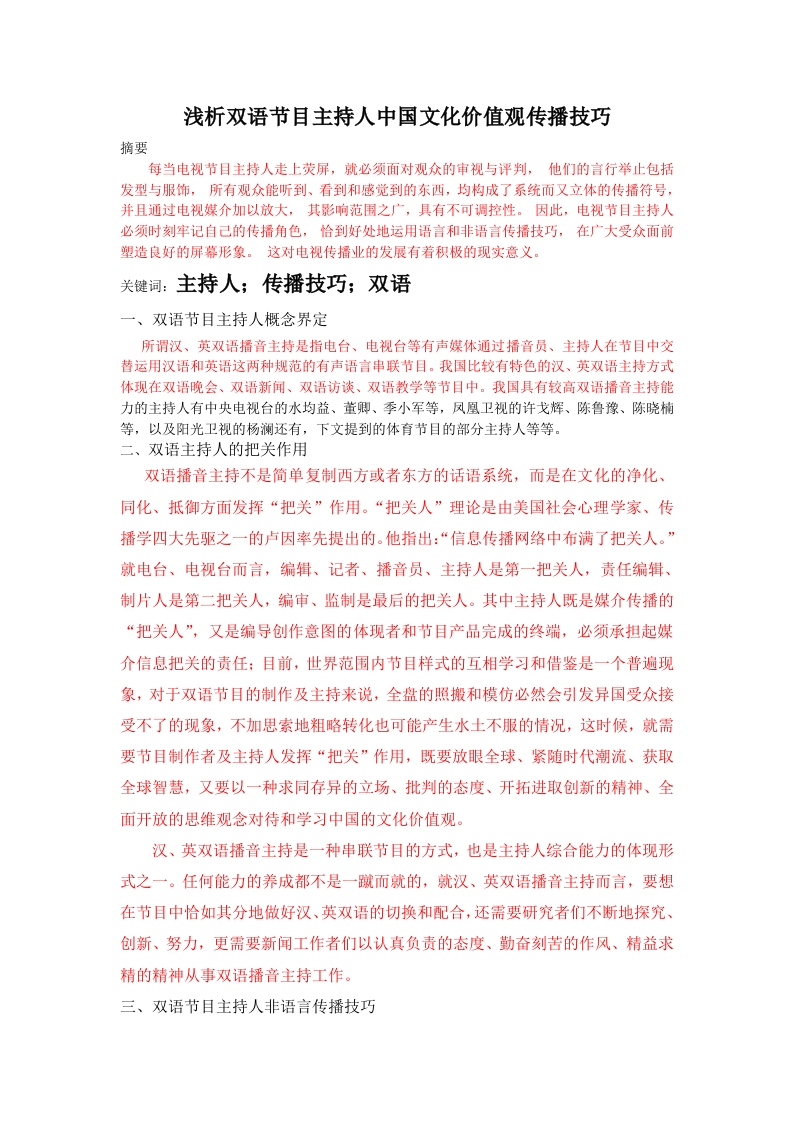 浅析双语节目主持人中国文化价值观传播技巧摘要每当电视节目主持人走上荧屏,就必须面对观众的审视与评判,他们的言行举止包括发型与服饰,所有观众能听到、看到和感觉到的东西,均构成了系统而又立体的传播符号,并且通过电视媒介加以放大,其影响范围之广,具有不可调控性。因此,电视节目主持人必须时刻牢记自己的传播角色,恰到好处地运用语言和非语言传播技巧,在广大受众面前塑造良好的屏幕形象。这对电视传播业的发展有着积极的现实意义。关键词:主持人;传播技巧;双语一、双语节目主持人概念界定所谓汉、英双语播音主持是指电台、电视台等有声媒体通过播音员、主持人在节目中交替运用汉语和英语这两种规范的有声语言串联节目。我国比较有特色的汉、英双语主持方式体现在双语晚会、双语新闻、双语访谈、双语教学等节目中。我国具有较高双语播音主持能力的主持人有中央电视台的水均益、董卿、季小军等,凤凰卫视的许戈辉、陈鲁豫、陈晓楠等,以及阳光卫视的杨澜还有,下文提到的体育节目的部分主持人等等。二、双语主持人的把关作用双语播音主持不是简单复制西方或者东方的话语系统,而是在文化的净化、同化、抵御方面发挥“把关”作用。“把关人”理论是由美国社会心理学家、传播学四大先驱之一的卢因率先提出的。他指出:“信息传播网络中布满了把关人。”就电台、电视台而言,编辑、记者、播音员、主持人是第一把关人,责任编辑、制片人是第二把关人,编审、监制是最后的把关人。其中主持人既是媒介传播的“把关人”,又是编导创作意图的体现者和节目产品完成的终端,必须承担起媒介信息把关的责任:目前,世界范围内节目样式的互相学习和借鉴是一个普遍现象,对于双语节目的制作及主持来说,全盘的照搬和模仿必然会引发异国受众接受不了的现象,不加思索地粗略转化也可能产生水土不服的情况,这时候,就需要节目制作者及主持人发挥“把关”作用,既要放眼全球、紧随时代潮流、获取全球智慧,又要以一种求同存异的立场、批判的态度、开拓进取创新的精神、全面开放的思维观念对待和学习中国的文化价值观。汉、英双语播音主持是一种串联节目的方式,也是主持人综合能力的体现形式之一。任何能力的养成都不是一蹴而就的,就汉、英双语播音主持而言,要想在节目中恰如其分地做好汉、英双语的切换和配合,还需要研究者们不断地探究、创新、努力,更需要新闻工作者们以认真负责的态度、勤奋刻苦的作风、精益求精的精神从事双语播音主持工作。三、双语节目主持人非语言传播技巧1.身体语言一一一举止神态学举止神态学通常被称为身体动作或身体语言,最典型地包括面部表情(如眉毛、前额、眼睛、嘴等)、姿态和手势。因此,一个手势、一个令人吃惊的瞪眼,矜持的笑或是开怀的笑以及猛地一昂头等等,都是举止神态学的内容。最近有报道显示,婴儿和初学走路的孩子如果学了较多的手势,则会在将米更快地提高他们的阅读速度,在1Q测验中也会得分较高。因此,这种学习过程中的手势作用引起越来越多人的关注,可以说,有意识地使用多种交流渠道会让交流变得更加通畅。2.衣着和打扮人们通常会参照衣着和打扮来判断人的年龄、社会经济地位、教育水平、所属群体、运动天赋、个性和与他人的关系等。也就是说,人们的装饰能表示重要的非语言信息,穿着在给人形成第一印象时起到了极其重要的作用。喜欢穿什么样的衣服或是戴什么样的首饰,什么样的发型等,无不体现出电视主持人的外在风格和审美观念。对自己衣着和身体装饰的选择是否适合所主持的节目?在何种程度上的选择能够符合所要沟通对象的期望?别人会对自己产生什么样的第一印象等,都需要主持人认真对待。由于人们对他人的反应大都是基于他人外表的一种直观反应,因而在关系发展的早期,衣着和外表会影响到第一印象,并影响到他人对你是接受还是拒绝。此外,人们还更倾向于回应或模仿衣着得体的人,而不喜欢追随那些从衣着上就可以看出缺乏素养的人。四、基于解说的角度看文化价值观传播技巧与传播效果一一以从电视体育评论的变迁为主线(一)早期:20世纪60年代初至80年代末,“广播体”传播,代表人物:张之、宋世雄注重受众群体研究分析和意见反馈是老一代体育评论员的优点,同时他们积累了许多行之有效的经验。研究每场转播的比赛看点,最大多数观众的欣赏口味、观众对比赛项目的了解水平。这是由张之老师开创的,宋世雄、王泰兴等发扬光大的早期中国体育转播解说风格。他们是主要运用有声语言向受众发布、传达、介绍体育节目的传播者。它的首要任务是传声达义,让受众了解信总、增长知识。遵循播音传播规律,掌握播音基础理论,语言规范、准确、清晰、流畅。对情景再现、内在语、对象感、重音、语气、节奏等基本的内、外部语言表达技巧运用得当。另外,不能忽略对体育运动的关注、了解和兴趣的培养。毋庸置疑的是体育节目播音员第一位的是有声语言的表达水准,而非其它。1.传播技巧::广播体,较弱的符号能力符号能力是特定的传者或受者使用一定符号的熟练程度、水平或特色等。传者的符号能力越强,越能对受者产生作用和效果。早期的体育解说员从其解说对受众产生的