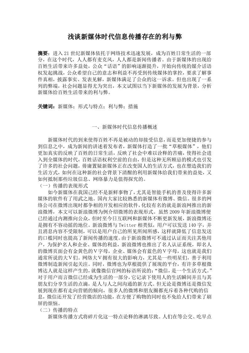 浅谈新媒体时代信息传播存在的利与弊摘要:进入21世纪新媒体依托于网络技术迅速发展,成为百姓日常生活的一部分,在这个时代,人人都有麦克风,人人都是新闻传播者。由于新媒体的出现给百姓生活带来许多益处,公众“话语”的影响逐渐提升,开始向传统的媒介话语权发起挑战,公众希望自己的意志和利益不再受到传统媒体的掌控,要求了解事件真相,披露事实、发表见解,新媒体满足了公众的这一诉求。但也出现了一系列的弊端,社会问题显得尤为突出,本文试图以当下新媒体的发展为背景,分析新媒体给百姓生活带来的利与弊。一、新媒体时代信息传播概述新媒体时代的到来使得百姓不再是被动的却接受信息,而是更加便捷的参与到信息之中,成为新闻的讲述着发布者,新媒体打造了一批“草根媒体”,他们更加真实的反映了百姓的日常生活,反映了社会中难以诠释的苦痛,使得社会进入到全媒体的时代,百姓话语权利空前的自由,但是这种无所顾忌的模式也引发了许多的社会问题,毋庸置疑新媒体正在改变国人的生活方式,也在塑造我们的生活方式,如何在这种新的社会背景下清醒的利用新媒体给我们带来的益处,又如何抵制那些垃圾信息、网络暴力是值得探究的。(一)传播的表现形式如今新媒体在我国己经不是新鲜事物了,尤其是智能手机的普及使得许多新媒体的软件有了用武之地。国内大家比较熟悉的新媒体有微博、微信。很多的网络公司在微博出现时都争相的开发相应的软件,化较有名的就是新浪网推出的新浪微博,本文可以新浪微博为例介绍微博的表现形式。虽然2009年新浪微博便已经通过内测推向公众,但时至今日互联网和新媒体不断更新发展,新浪微博还是拥有不容动摇的地位。新浪微博与Twitter相类似,用户可以发送140字,并且消息内容不受限制,可以是用户自己的所见所闻所感,这样就降低了信息发送的口槛同时也提高了新闻传播的速度。由于新浪微博可不通过认证而关注其他用户,为保护名人和企业、媒体的利益,新浪微博也推出了名人认证系统,即名人的微博页面会有金黄色的V字母,企业、媒体会有蓝色的V字母,这也就是我们通常所说的大V们。网络大V拥有很大的影响力,尤其是一些明星们,善于利用微博制造新闻引起关注。同时,微博也为草根提供了展现的平台,有许多草根微博达人就是这样产生的,就像微信官网的标语所说的:“微信,是一个生活方式。”对于用户而言微信已经成为生活的一部分,它记录下使用人的生活瞬间并且与其朋友们分享生活的点滴,是人与人之间沟通的新方式。但无论是微博还是微信发展到现在都有走向营销的倾向,很多人的微博和朋友圈都充斥着各种代购的信息,微信还开发了经营微店的功能,在方便了购物的同时也不免给人们带来了刷屏的烦恼。(二)传播的特点新媒体传播方式将碎片化这一特点论释的淋漓尽致。人们在等公交、吃早点等等的零碎时间中发个微博或是在微信中传张自拍照,送些碎片化的信息传播内容占据了碎片化的时间,原本像是打发时间的行为却是有着极大的影响力的。除了时空的碎片化之外,信息的传播内容也同样是碎片式的,一条微博最多也只能写140字,对于信息的传递只能是简明扼要的,说重点和吸引眼球的地方,因为人们没有耐也去读完报纸评论似的兀长的文章。随着社会和科技的发展人们越来越适应碎片化的阅读形式,对于感兴趣的信息再通过深入的阅读了解来龙去脉。新媒体的传播没有固定的主体和受众,两方的角色随时可以互换,不同知识结构和认知能力的人来说,传播的信息也会出现很大的差别,这就导致信息的接受者和发布者身份的碎片化。二、新媒体时代信息传播的优势(一)传播者一一广开言路媒体话语霸权是在信息传播过程中媒体运用自身优势使受众接受其传播内容的现象。媒体本应当客观真实的反映问题,但却加入了个人的主观腺断,混淆了受众的判断并利用媒体的天然传播优势不容置疑的使受众接受,形成霸权。但微博、微信舆论场自净功能消弱了传统媒体霸权。新媒体的出现带来了一种全新的局面再也不是传统媒体“一言堂”的天下了,公众通过新媒体也可以发出自己的声音。据《第35次中国互联网络发展状况统计报苗》显示“有43.8%以的网民表示喜欢在互联网上发表评论,其中非常喜欢的占6.7%,比较喜欢的占37.1%。”在新媒体出现后很多传统意见领袖成功转型,在新媒体世界中重新占领地位,事实上,在网络传播的过程中,意见领袖仍然可以发拜巨大的作用。新媒体传播瞬息万变,对于发生的各种议题人们都可以随时随地、公开自由的发表评论,参与讨论。人们了解到多重维度,不同立场的观点以及由此产生对社会事件的情绪,就会产生复杂的想法,当有些人不能普于把控情绪表达观点或是不能恰当的诉说看法体会的时候,就需要有人帮助他们,此时就是意见领袖发挥作用的时候了。关注意见领袖的想法和观点会满足公众参与舆论的需求。好的意见领袖会凝聚网友形成向也力,对舆论导向的影响也是不可小励的。公众话语权就像孩子一样有着勃勃的生机和活力,对于这样的萌芽不能抑制更不能任其发展,适当的引导会使公众话语权更好的发展,无论对社会还是对于每个参与到新媒体时代变革的人来说都会是有利而无害的。所以意见领袖更有着非同一般的使命,