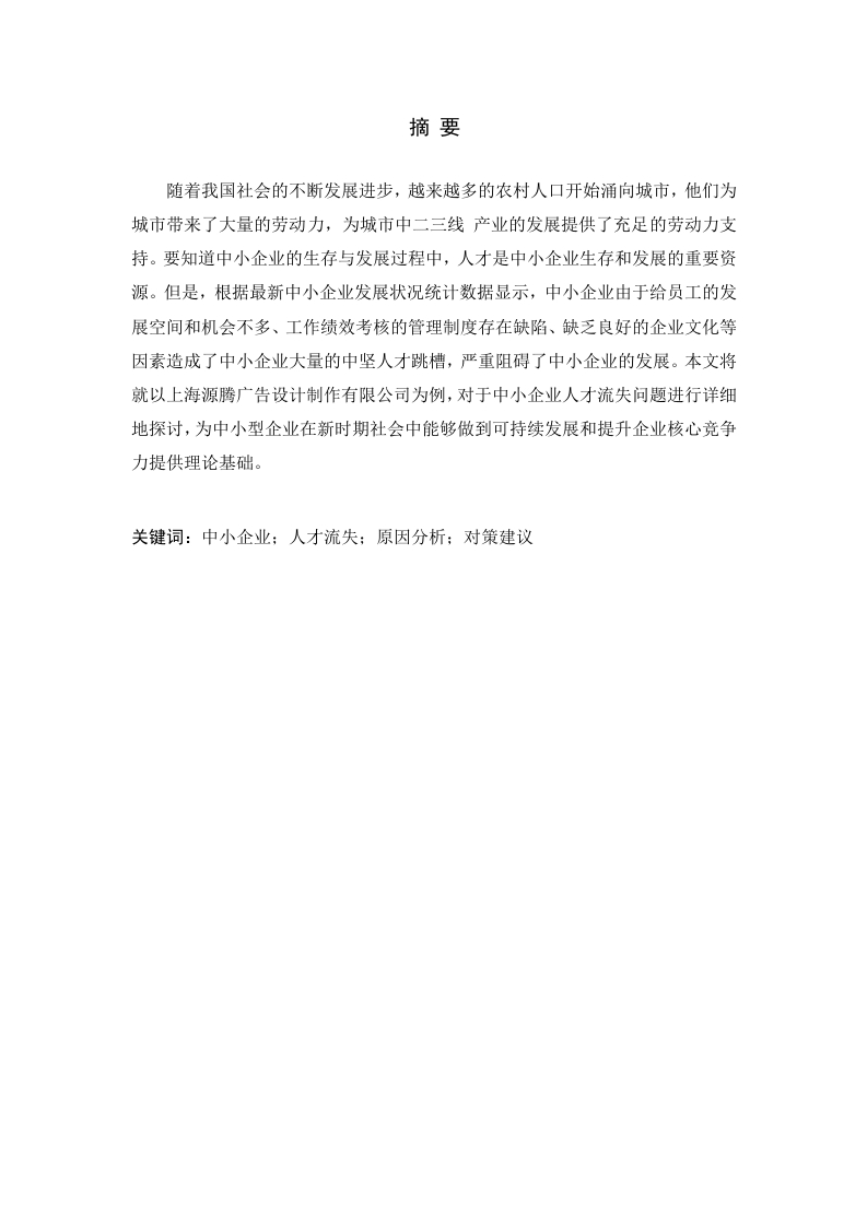 摘要随着我国社会的不断发展进步,越来越多的农村人口开始涌向城市,他们为城市带来了大量的劳动力,为城市中二三线产业的发展提供了充足的劳动力支持。要知道中小企业的生存与发展过程中,人才是中小企业生存和发展的重要资源。但是,根据最新中小企业发展状况统计数据显示,中小企业由于给员工的发展空间和机会不多、工作绩效考核的管理制度存在缺陷、缺乏良好的企业文化等因素造成了中小企业大量的中坚人才跳槽,严重阻碍了中小企业的发展。本文将就以上海源腾广告设计制作有限公司为例,对于中小企业人才流失问题进行详细地探讨,为中小型企业在新时期社会中能够做到可持续发展和提升企业核心竞争力提供理论基础。关键词:中小企业;人才流失:原因分析:对策建议AbstractWith the continuous development and progress of China's society,more andmore rural population begin to flock to cities.They bring a large number of laborforce to cities and provide sufficient labor support for the development of second andthird-tier industries in cities.It should be noted that talent is an important resource forthe survival and development of small and medium-sized enterprises.However,according to the latest statistics on the development of small and medium-sizedenterprises (smes),the lack of development space and opportunities for theiremployees,the defects in the management system of work performance assessmentand the lack of a good corporate culture have caused a large number of core talentsjob-hopping in smes,which has seriously hindered the development of smes.Thispaper will take Shanghai yuanteng advertising design and production co.,Itd.as anexample to discuss in detail the problem of brain drain in small and medium-sizedenterprises,so as to provide a theoretical basis for small and medium-sized enterprisesto achieve sustainable development and enhance their core competitiveness in the newera society.Key words:small and medium-sized enterprises;Brain drain;Cause analysis;Countermeasures and Suggestions目录二、上海源腾广告设计制作有限公司人才流失的原因分析.·33(三)缺乏有效的人才培养和职业生涯规划...4三、上海源腾广告设计制作有限公司人才流失的对策建议.·4(二)坚持以人为本的理念(三)建立人才流失预警机制..·5