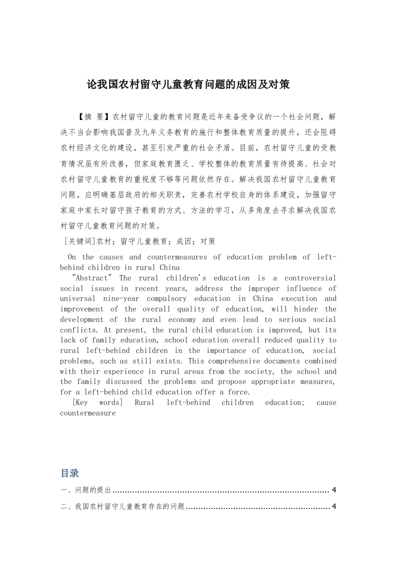 论我国农村留守儿童教育问题的成因及对策【摘要】农村留守儿童的教育问题是近年来备受争议的一个社会问题,解决不当会影响我国普及九年义务教育的施行和整体教育质量的提升,还会阻碍农村经济文化的建设,甚至引发严重的社会矛盾。目前,农村留守儿童的受教育情况虽有所改善,但家庭教育匮乏、学校整体的教育质量有待提高、社会对农村留守儿童教育的重视度不够等问题依然存在。解决我国农村留守儿童教育问题,应明确基层政府的相关职责,完善农村学校自身的体系建设,加强留守家庭中家长对留守孩子教育的方式、方法的学习,从多角度去寻求解决我国农村留守儿童教育问题的对策。[关镀词]农村:留守儿童教育:成因:对策On the causes and countermeasures of education problem of left-behind children in rural China"Abstract"The rural children's education is a controversialsocial issues in recent years,address the improper influence ofuniversal nine-year compulsory education in China execution andimprovement of the overall quality of education,will hinder thedevelopment of the rural economy and even lead to serious socialconflicts.At present,the rural child education is improved,but itslack of family education,school education overall reduced quality torural left-behind children in the importance of education,socialproblems,such as still exists.This comprehensive documents combinedwith their experience in rural areas from the society,the school andthe family discussed the problems and propose appropriate measures,for a left-behind child education offer a force.[Key words]Rural left-behind children education;causecountermeasure目录一、问题的提出.二、我国农村留守儿童教育存在的问题.…1.尊老爱幼的美德退化…52.课外学习缺乏管教和辅导.…53.家庭和美的温情缺失.5(二)学校教有整体质量下降…51.设备不齐全,硬件不过关.…3.教育经费不足,有项无款…(三)社会对农村留守的教育重视度不够.…71.基层政府注重发展农村经济,教育财政投入不足.2农村留守儿童的教育问题无人问津.…83.社会监督机制的建立在农村还不健全.三、农村留守儿童存在的教育问题的成因…82.我国政治文化长期历史发展的弊端.…93.缺乏关爱农村留守儿童教育的社会组织…94.社会煤体的监督和大众奥论延伸不到农村.…101.隔代教育,心有余而力不足2.代理教育,难以尽职尽责.…3.自我成长,封闭了内心世界.11(三)学校原因.111教学方式落后,课堂效率低…112.农村地域偏僻、经济条件差难以吸引优秀人才..123.自身管理不力,经费来源少.12四、缓解我国农村留守儿童教育问题的对策分析..121.加强关爱留守儿童的公共责任意识.122.促进农村经济发展..133.加大对农村基础教有的投资力度.…14(二)强化学校教育.…141.加强学校家庭合作力度.…142.完善农村学校的硬件设施.…143.加强学校自身体系的建设.…(三)组织父母学习家庭教育知识…1.利用通讯工具增进感情.…152.选择合适的监护人153.培养孩子的自我管理能力16.16参考文献:.16一、问题的提出我国许多学者对留守儿童问题的热议最早出现在1994年,上官子木发表的留守儿童问题应引起重视一文首次正式提出了留守儿童问题并呼吁国家和社会