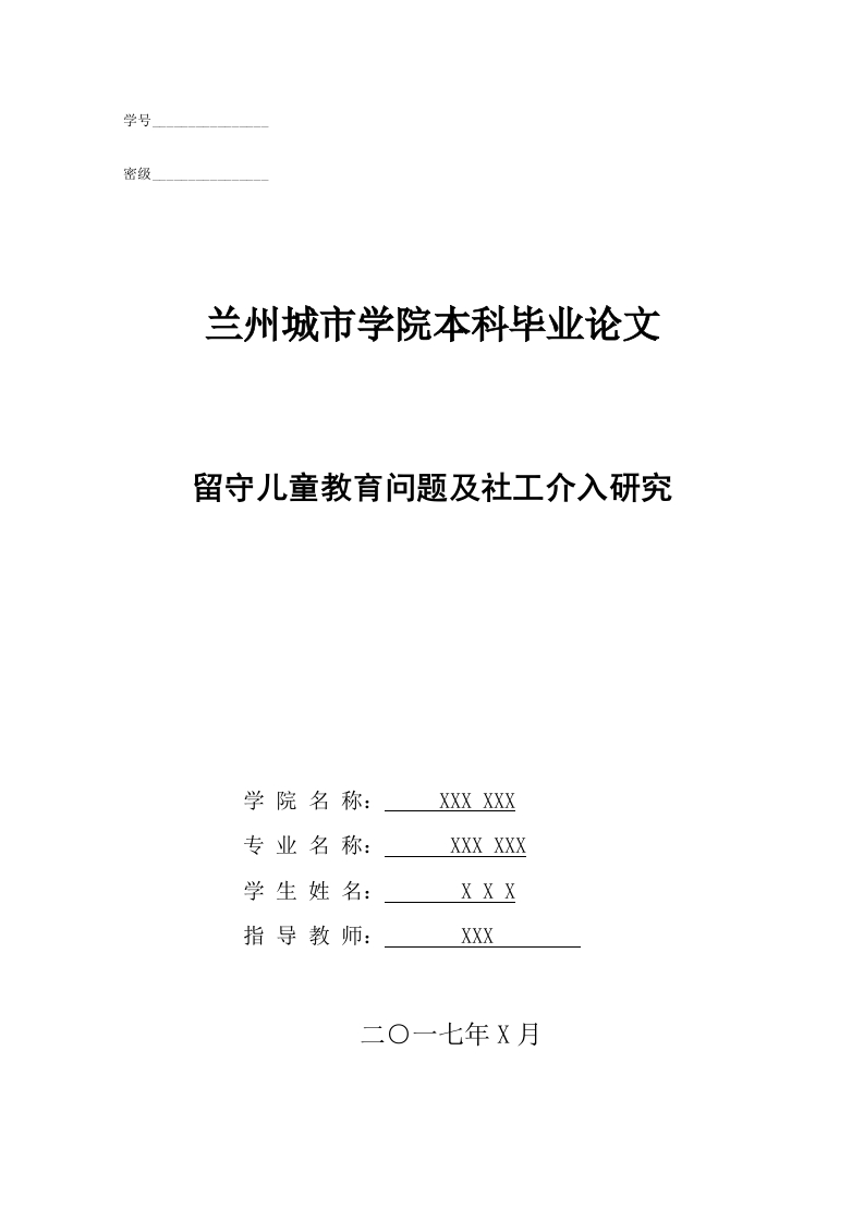 学号密级兰州城市学院本科毕业论文留守儿童教育问题及社工介入研究学院名称:XXX XXX专业名称:XXX XXX学生姓名:XX X指导教师:XXX二O一七年X月BACHELOR'S DEGREE THESISOF LANZHOU CITY UNIVERSITYStudy on the Educational Problems ofLeft behind Children and Social Workers'InterventionCollege XXXXXXSubject:XXXXXXName XXXDirected by XXX ProfessorJune 2017郑重声明本人呈交的学位论文,是在导师的指导下,独立进行研究工作所取得的成果,所有数据、图片资料真实可靠。尽我所知,除文中己经注明引用的内容外,本学位论文的研究成果不包含他人享有著作权的内容。对本论文所涉及的研究工作做出贡献的其他个人和集体,均已在文中以明确的方式标明。本学位论文的知识产权归属于培养单位。本人签名:日期: