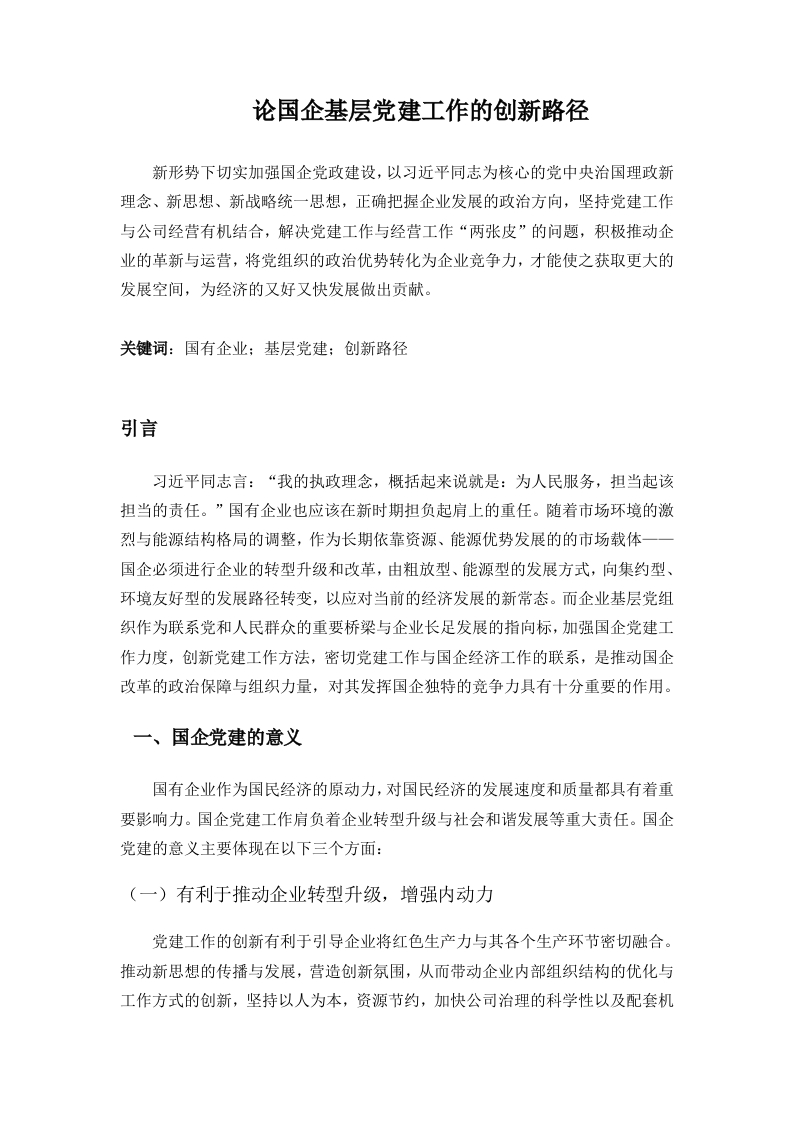 论国企基层党建工作的创新路径新形势下切实加强国企党政建设,以习近平同志为核心的党中央治国理政新理念、新思想、新战略统一思想,正确把握企业发展的政治方向,坚持党建工作与公司经营有机结合,解决党建工作与经营工作“两张皮”的问题,积极推动企业的革新与运营,将党组织的政治优势转化为企业竞争力,才能使之获取更大的发展空间,为经济的又好又快发展做出贡献。关键词:国有企业:基层党建:创新路径引言习近平同志言:“我的执政理念,概括起来说就是:为人民服务,担当起该担当的责任。”国有企业也应该在新时期担负起肩上的重任。随着市场环境的激烈与能源结构格局的调整,作为长期依靠资源、能源优势发展的的市场载体一一国企必须进行企业的转型升级和改革,由粗放型、能源型的发展方式,向集约型、环境友好型的发展路径转变,以应对当前的经济发展的新常态。而企业基层党组织作为联系党和人民群众的重要桥梁与企业长足发展的指向标,加强国企党建工作力度,创新党建工作方法,密切党建工作与国企经济工作的联系,是推动国企改革的政治保障与组织力量,对其发挥国企独特的竞争力具有十分重要的作用。一、国企党建的意义国有企业作为国民经济的原动力,对国民经济的发展速度和质量都具有着重要影响力。国企党建工作肩负着企业转型升级与社会和谐发展等重大责任。国企党建的意义主要体现在以下三个方面:(一)有利于推动企业转型升级,增强内动力党建工作的创新有利于引导企业将红色生产力与其各个生产环节密切融合。推动新思想的传播与发展,营造创新氛围,从而带动企业内部组织结构的优化与工作方式的创新,坚持以人为本,资源节约,加快公司治理的科学性以及配套机制的完善性,以改革谋动力,向服务要效益,重视企业利润增长的质量,顺应“第三次工业革命”对新能源、新动力的发挥只能要求,获得未来经济发展产业链的主动权。(二)有利于强化企业文化,树立良好形象人民群众对国企的评价与看法是其生存与发展的重要影响力。加强党组织在国企的控制力有利于其借助网络信息平台等加强对企业上下的思想教育工作,坚持价值思维与效益导向,注重内部人才的培养使之担负其起企业文化的建设与传播责任,增强企业文化软实力。与此同时,借以新闻媒体宣传等,有效引导群众对国企的深入了解和正向舆论,使惠及民众与企业建设紧密结合,相互促进,从而形成良性循环,促进企业走入人民群众,赢得支持,开拓市场发展前景。(三)有利于企业把握正确的政治方向,健康发展党建工作是企业各项工作的政治核心,充分发挥着引领、监督、推动的作用,与企业共同成长。基层党组织领导着企业的思想政治教育工作,并参与企业重大发展战略的制定与实施,如生产战略、营销战略和人才战略等,确保企业安全生产运作,广大职工务实工作,服务于人民群众,坚决避免利己主义,树立大局观念,深入贯彻落实科学发展观,推动建设社会主义和谐社会。与此同时,认真负责完成行政工作并有效合理解决相关行政问题,有力地引导企业始终把握正确的政治方向,健康成长。二、新常态下国企党建工作新要求经济新常态时代的到来为国企党建提出了诸多要求,坚持党的领导不动摇,加强职工思想政治教育,调整企业组织架构,转变经济发展方式,完善相关体制机制等,方方面面都影响着国有企业是否能够有效的应对当前的经济形势。(一)要求强化队伍建设,加强领导坚强党员的思想教育是发挥国企党组织引领作用的必然要求。通过各种培训与宣传,坚定的的理想,积极树立新常态经济理念,改进党员行为作风,并制定切实可行的措施与规范引导党员转变工作思路、工作行为,提高处理个人利益与集体利益矛盾的能力,坚持以人为本,做到责任不缺位,发挥榜样作用,只有这样才能将党的组织优势进一步融入到企业的核心竞争力中,化为企业发展的活力与精神动力,在经济新常态下抓住机遇更好的实现企业的发展。(二)要求创新工作方法,科学管理随着“互联网+”时代的到来,积极利用网络技术,加大资源分享力度,密切职工的联系,搭建新型学习平台,增强党员参与的积极性与主动性,促进思维的包容性与开放性,获得知识面的拓展与更方面能力素质的提高,建立“学习型企业”,培养员工获取并筛选信息的能力和自主学习的兴趣,以便及时来了解经济动态以作出及时且合理有效的应对,是加强企业科学管理的最重要举措。同时,加强与其他经济主体的合作共享,组成竞合优势,“知识同盟”,进行人力资源、信息资源的交换学习,取长补短,以跨界思维学习其成功经验,实现双赢。(三)要求明确党建工作地位,注重实践利润最大化作为一个企业的重要战略目标,其和党建工作的冲突随着市场经济的不断深入发展愈加明显,这意味着国企党建工作将日益艰巨与中重要。国企党建工作的重要任务之一就是对人的教育,这种软实力的培养难以用金钱或数据具体表现出来,但是其在国企组织形式中的主导地位不容动摇,国企改革日渐深化,党建工作则正需要注重实践,把握大局。在新常态下,国企党建工作需审时度势,在以往的实践基础上进一步加深与企业现行组织结构、知识产权管理以及经营运作模式密切结合,争取融入到企业发展的每个环节,坚持人民群众路线,加强
