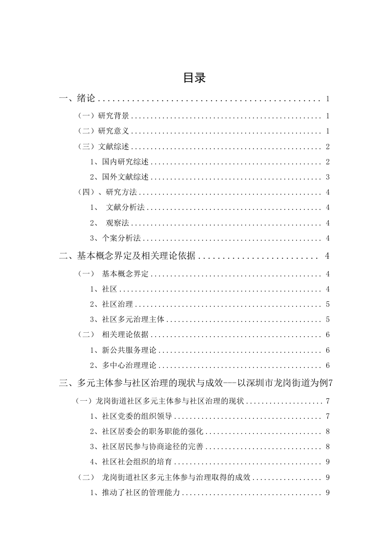 目录1(三)文献综述21、国内研究综述22、国外文献综述3(四)、研究方法.·41、文献分析法..4。。。。。。。。。。44二、基本概念界定及相关理论依据441、社区453、社区多元治理主体....5(二)相关理论依据..66三、多元主体参与社区治理的现状与成效-一以深圳市龙岗街道为例7(一)龙岗街道社区多元主体参与社区治理的现状1、社区党委的组织领导..7884、社区社会组织的培育…9(二)龙岗街道社区多元主体参与治理取得的成效·92、社区服务水平提高.·9101010(一)、社区居民缺乏公共精神....111213(一)、龙岗街道居民缺乏公共精神的原因分析·1313六、多元主体参与治理困境的对策.···(一)、提高社区居民参与社区治理的热情.·14(二)、构建多元主体协商平台..16多元主体参与社区治理问题研究—以龙岗街道为例郑斯聪摘要:随着经济社会的发展,社区治理作为城市管理的重要一部分越来越引起国家的重视,社区治理也在社会治理的地位上升。党的十九大指出,加强社区治理体系的建设,加强社区的管理工作,实现政府与其他社会主体相互调节、与社区居民互动。随着经济的不断发展以及基层管理体制的逐步革新,以政府“一家独大”的治理观念已经跟不上时代的步伐,现如今社区的治理需要政府与社区各主体间相互配合,构建多元主体参与社区治理的新模式,社区才能更加和谐稳定发展。但由于新模式的多元化,许多原来的街道、居民委员会在新的环境下会出现诸多不适。对多元主体参与社区治理模式进行分析、研究,促进多元主体在参与