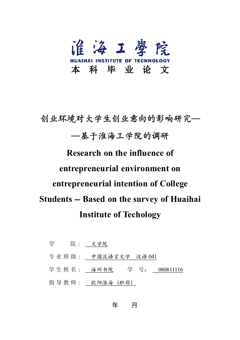 HUAIHAI INSTITUTE OF TECHNOLOGY本科毕业论文创业环境对大学生创业意向的影响研究一一基于准海工学院的调研Research on the influence ofentrepreneurial environment onentrepreneurial intention of CollegeStudents--Based on the survey of HuaihaiInstitute of Techology学院:文学院专业班级:中国汉语言文学汉语041学生姓名:海州书院学号:080811116指导教师:欧阳淮海(职称)年月毕业论文中文摘要创业环境对大学生创业意向的影响研究基于淮海工学院的调研摘要:大学生作为一个特殊群体,具备专业的文化知识和年轻人特有的创新精神,是国家未来最主要的科技创业群体。从长远来看,大学生创业必然对保持经济增长和社会发展作出重要贡献。在此背景下,研究如何优化创业环境,提高大学生创业意愿,鼓励更多的大学生走上自主创业之路是目前迫切需要解决的问题。本文在研究中国情境下,创业环境对于大学生创业意愿的影响,分析创业环境对于创业意愿的作用机制。并通过实证分析获取的数据,探讨大学生创业环境的优化措施。期望在理论和实践中,为创业环境和创业意愿研究提供借鉴意义。关键词:大学生;创业:创业意向:影响因素毕业论文外文摘要Research on the influence of entrepreneurial environment onentrepreneurial intention of College Students--Based on the surveyof Huaihai Institute of TechologyAbstract:College students as a special group,have special professional knowledge and young people's spirit of innovation,is the future of the country's main technology venture group.In the long run,students must make an important contribution to maintain economic growth and social development.Under this background,to study how to optimize the business environment,improve the entrepreneurial intention of college students,encourage more students go on the road of independent entrepreneurs is an urgent need to solve the problem.Based on the study of Chinese situation,affecting the business environment for the entrepreneurial intention of college students,analysis of business environment for the mechanism of entrepreneurial intention.And data obtained through empirical analysis of University The optimization measures of the entrepreneurial environment in the theory and practice,hoping to provide reference for the entrepreneurial environment and entrepreneurial intentionsKeywords:College students;entrepreneurship;entrepreneurial intention