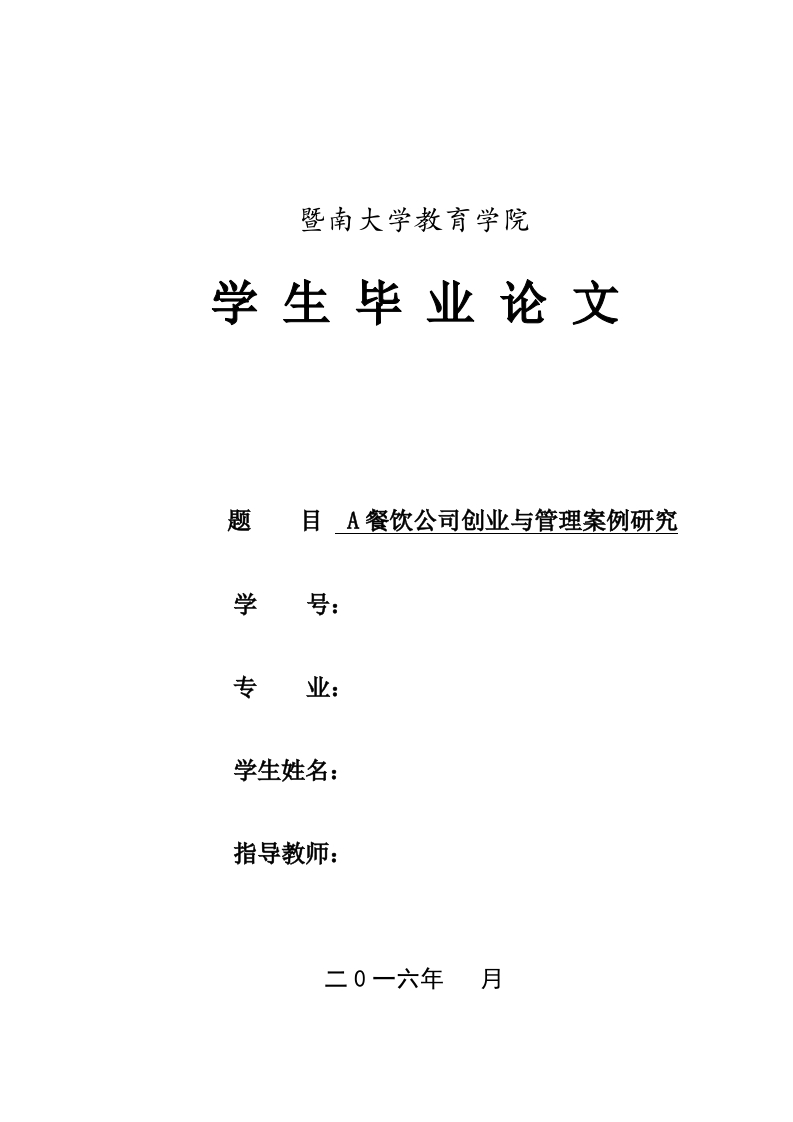 暨南大学教育学院学生毕业论文题目A餐饮公司创业与管理案例研究学号:专学生姓名:指导教师:二0一六年月诚信声明我声明,所呈交的毕业论文是本人在老师指导下进行的研究工作及取得的研究成果。据我查证,除了文中特别加以标注和致谢的地方外,论文中不包含其他人已经发表或撰写过的研究成果,也不包含为获得其他教育机构的学位或证书而使用过的材料。我承诺,论文中的所有内容均真实、可信。毕业论文作者签名:签名日期:2016年月日论文摘要创业是全球经济发展的重要动力。我国改革开放以来所取得的伟大经济发展成就中,民营企业的创业活动贡献巨大。新创民营企业因适应环境条件而获得创小业成功与成长,同时也可能因诸多原因而遭遇挫折甚至失败。因此,本文研究的目的,就是对一民营企业的创业与成长历程中典型事件展开研究分析,找出其成败的具体原因,总结经验教训,为民营企业创业和发展提供具有一定参考价值的理论依据和管理方法。本文以A公司创业与成长案例为研究对象,以事实为依据,采用实地调研、深度访谈、案例分析的方式,运用系统思维和理论联系实际的方法,对案例问题根源展开探究并得出相应结论和管理变革建议。根据研究需要,本文选用创业学、管理学、组织行为学、人力资源管理等相关理论作为支撑,来分析和解决案例所述问题。关键词:创业:管理:变革