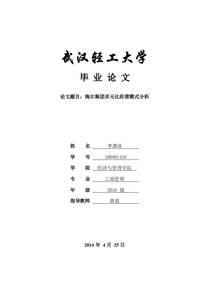 毕业论文论文题目:海尔集团多元化经营模式分析名李潭沐学号100801416学院经济与管理学院专业工商管理年级2010级指导教师黄恩2014年4月25日武汉轻工大学本科毕业论文原创性声明本人郑重声明:所呈交的毕业设计(论文),是本人在指导教师的指导下独立研究、撰写的成果。设计(论文)中引用他人的文献、数据、图件、资料,均已在设计(论文)中加以说明,除此之外,本设计(论文)不含任何其他个人或集体已经发表或撰写的成果作品。对本文研究做出重要贡献的个人和集体,均已在文中作了明确说明并表示了谢意。本声明的法律结果由本人承担。毕业设计(论文)作者签名:年月日武汉轻工大学关于毕业论文使用授权的说明本毕业设计(论文)作者完全了解学校有关保留、使用毕业设计(论文)的规定,即:学校有权保留、送交设计(论文)的复印件,允许设计(论文)被查阅和借阅,学校可以公布设计(论文)的全部或部分内容,可以采用影印、扫描等复制手段保存本设计(论文)。指导教师签名:毕业设计(论文)作者签名:年月日年月日目录摘要1Abstract.....................................................................21绪论32多元化理论概述。42.1多元化经营模式的现实意义…42.2多元化经营模式的动因…42.2.2非提高企业价值的动因...52.2.3管理者的消极动机.63我国企业多元化模式发展的现状分析.。73.1我国企业多元化发展进程.73.2多元化模式成功实施的条件..73.3我国企业多元化经营面临的主要问题.·4海尔集团多元化经营发展现状。94.1海尔公司简介.94.2海尔集团多元化经营发展历程..94.3海尔集团多元化模式的特点..95海尔集团多元化经营模式中存在的问题…115.1多元化经营带来的财务风险.....115.2企业内部和外部环境风险115.3多元化给企业带来的资源风险....125.4过分注重有形资产的扩张与动作..........55进入行业选择的盲目性.135.6多元化经营中人力资源配置不当..146海尔多元化经营模式问题的改进措施..156.1加强财务管理防范和控制风险156.2建立核心竞争力规避环境风险156.4控制企业有形资产的规模.176.6优化配置企业人力资源.187总结…1921参考文献…22