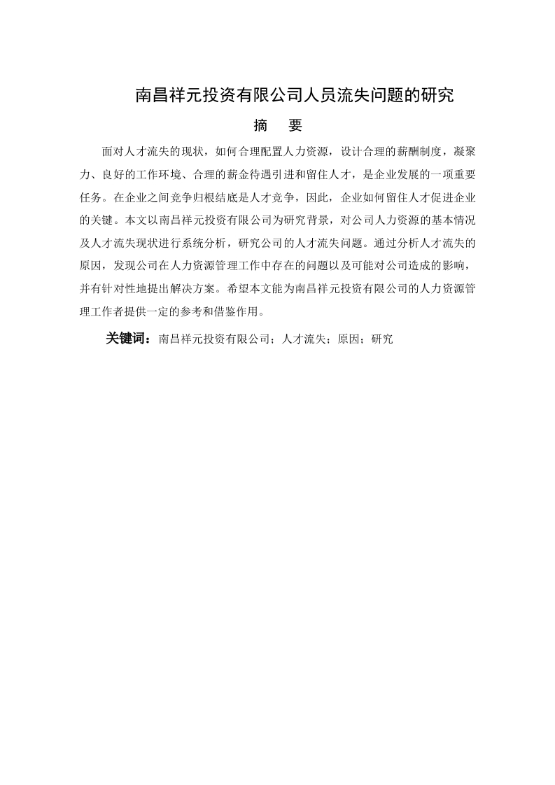 南昌祥元投资有限公司人员流失问题的研究摘要面对人才流失的现状,如何合理配置人力资源,设计合理的薪酬制度,凝聚力、良好的工作环境、合理的薪金待遇引进和留住人才,是企业发展的一项重要任务。在企业之间竞争归根结底是人才竞争,因此,企业如何留住人才促进企业的关键。本文以南昌祥元投资有限公司为研究背景,对公司人力资源的基本情况及人才流失现状进行系统分析,研究公司的人才流失问题。通过分析人才流失的原因,发现公司在人力资源管理工作中存在的问题以及可能对公司造成的影响,并有针对性地提出解决方案。希望本文能为南昌祥元投资有限公司的人力资源管理工作者提供一定的参考和借鉴作用。关键词:南昌祥元投资有限公司:人才流失:原因:研究目录1.3人才流动与人才流失的区别...·222.1南昌祥元投资有限公司概况......22.1.1南昌祥元投资有限公司简介...22.1.3公司组织框架.…332.2.2南昌祥元投资有限公司人才流失的特点..52.2.3人才流失对南昌祥元投资有限公司公司的影响.·第3章南昌祥元投资有限公司人才流失存在问题及原因分析…83.1南昌祥元投资有限公司人才流失存在问题.…93.1.2薪酬福利体系有待改善....93.1.4人才使用和竞争机制有待完善..93.1.5企业人力资源管理不太合理...10103.2.1发展机会.113.2.2领导方式方面.…11113.2.4企业与员工之间相互尊重方面.…113.2.5人才培训的力度不够大…111212124.2.1完善用人机制,努力做到制度留人…124.2.2加强人才培训及继任计划..134.3加强企业的风险管理...134.3.1事前管理134.3.2危机处理....144.3.3事后管理...154.4塑造良好的企业文化...151516