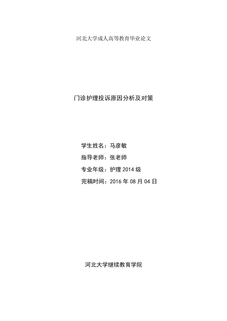 河北大学成人高等教育毕业论文门诊护理投诉原因分析及对策学生姓名:马彦敏指导老师:张老师专业年级:护理2014级完稿时间:2016年08月04日河北大学继续教育学院诚信承诺书我谨在此承诺:本人所写的毕业论文《门诊护理投诉原因分析及对策》由本人独立完成,保证不存在任何剽窃、抄袭他人学术成果的现象。凡涉及其他作者的观点和材料,均作了注释,如出现抄袭及侵犯他人知识产权的行为,由本人承担由此产生的一切后果。承诺人:马彦敏2016年08月04日门诊护理投诉原因分析及对策摘要目的分析门诊常见护理投诉原因并提出护理对策。方法采用回顾性研究分析,统计我院近3年门诊护理投诉,并对其进行调查核实,详细分析原因。结果近3年门诊护理投诉共78例,其中有效护理投诉42例(53.85%):不同职称、工龄护理人员被投诉率比较,差异有显著性意义(均P<0.01)。结论服务意识淡薄、护患沟通不良是门诊护理投诉的主要原因,通过转变服务意识,再造流程,增加便民服务等措施能及时化解护患矛盾,提高患者的满意度。关键词:门诊护理投诉原因分析对策