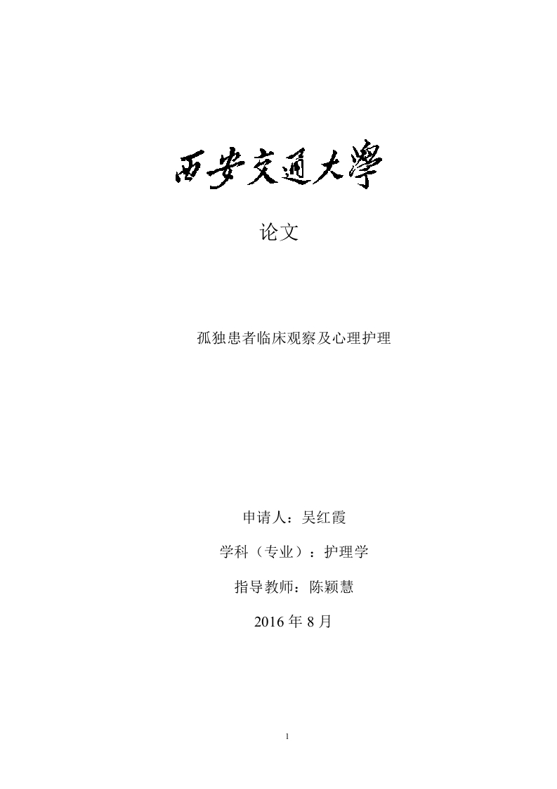 论文孤独患者临床观察及心理护理申请人:吴红霞学科(专业):护理学指导教师:陈颖慧2016年8月网络教育学院毕业设计(论文)任务书专业班级护理学层次专升本姓名吴红霞学号114092823040023一、毕业设计(论文)题目孤独患者临床观察及心理护理二、毕业设计(论文)工作自2016年06月14日起至2016年8月20日止三、毕业设计(论文)基本要求:指导教师:3