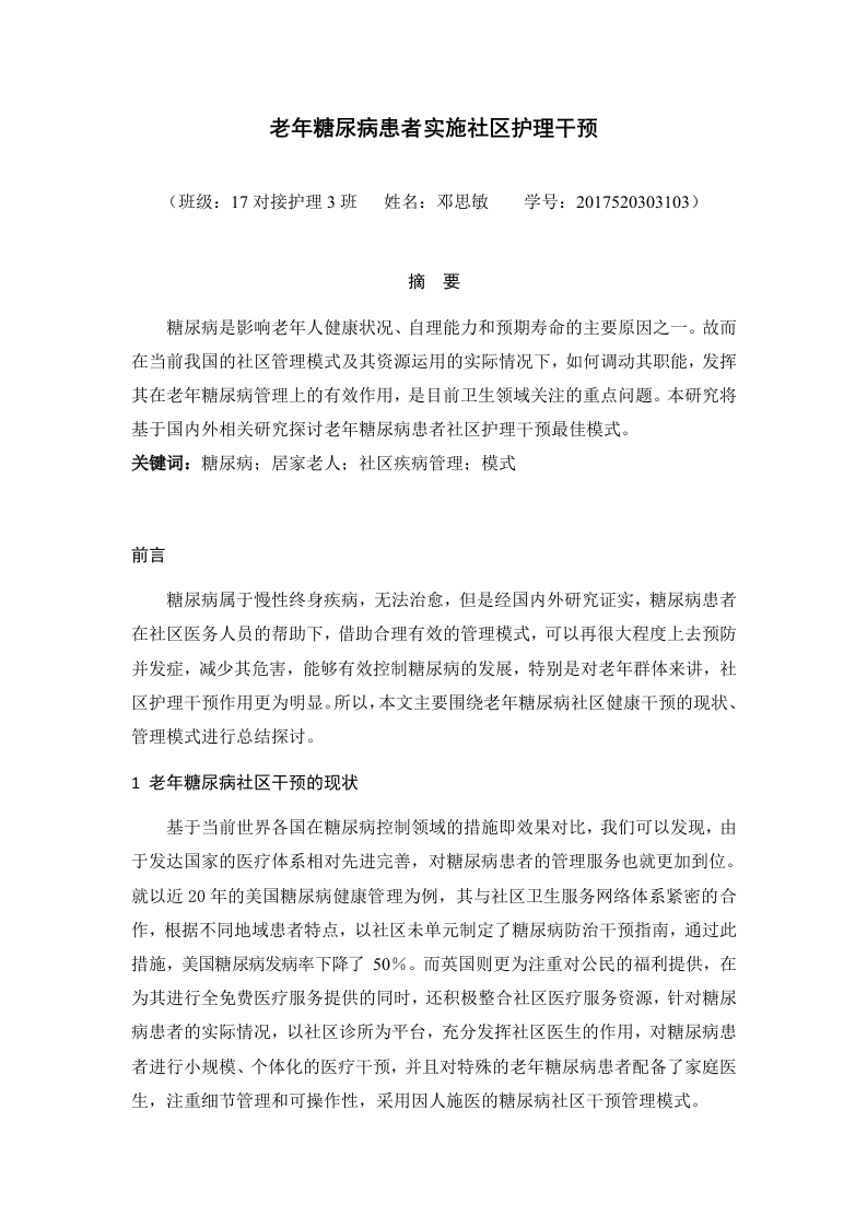 老年糖尿病患者实施社区护理干预(班级:17对接护理3班姓名:邓思敏学号:2017520303103)摘要糖尿病是影响老年人健康状况、自理能力和预期寿命的主要原因之一。故而在当前我国的社区管理模式及其资源运用的实际情况下,如何调动其职能,发挥其在老年糖尿病管理上的有效作用,是目前卫生领域关注的重点问题。本研究将基于国内外相关研究探讨老年糖尿病患者社区护理干预最佳模式。关键词:糖尿病:居家老人;社区疾病管理;模式前言糖尿病属于慢性终身疾病,无法治愈,但是经国内外研究证实,糖尿病患者在社区医务人员的帮助下,借助合理有效的管理模式,可以再很大程度上去预防并发症,减少其危害,能够有效控制糖尿病的发展,特别是对老年群体来讲,社区护理干预作用更为明显。所以,本文主要围绕老年糖尿病社区健康干预的现状、管理模式进行总结探讨。1老年糖尿病社区干预的现状基于当前世界各国在糖尿病控制领域的措施即效果对比,我们可以发现,由于发达国家的医疗体系相对先进完善,对糖尿病患者的管理服务也就更加到位。就以近20年的美国糖尿病健康管理为例,其与社区卫生服务网络体系紧密的合作,根据不同地域患者特点,以社区未单元制定了糖尿病防治干预指南,通过此措施,美国糖尿病发病率下降了50%。而英国则更为注重对公民的福利提供,在为其进行全免费医疗服务提供的同时,还积极整合社区医疗服务资源,针对糖尿病患者的实际情况,以社区诊所为平台,充分发挥社区医生的作用,对糖尿病患者进行小规模、个体化的医疗干预,并且对特殊的老年糖尿病患者配备了家庭医生,注重细节管理和可操作性,采用因人施医的糖尿病社区干预管理模式。随着我国社会经济发展,老龄化进程加速,糖尿病的增长趋势越发明显,对公民的健康带来了严重的威胁。目前我国对糖尿病的管理已经开始向多元化、综合性的方向发展,传统的单一治疗模式逐渐被摒弃,对人们的健康教育与综合健康管理也日渐完善,同时以社区医疗结构为依托,实现对糖尿病的细致管理。就如上海徐汇区、北京东城区均在社区糖尿病的防治方面做出了令人惊喜的成绩。但是不容忽视的是在具体的实施操作中确实还存在一些管理上的问题,需要在老年糖尿病管理的广度、精准性、有效性以及延续性方面做以进一步的探讨。2老年糖尿病社区干预的主要模式2.1综合干预模式综合干预模式是指对糖尿病患者实施用药物和非药物相结合的综合干预的研究。曾文娟(2016)研究显示,对社区糖尿病前期人群实施综合项目干预后,可增强糖尿病高危人群的自身的健康管理意识,能够减少其不良生活方式,预防并发症的发生,减少并发症带来的危害。袁莎莎(2017)通过对144名患者的跟踪调查,发现糖尿病综合防治,对患病率的控制明显。2.2自我管理干预模式自我管理干预模式主要是指患者能够通过自主意识,去依靠自身的心理及身体能力解决一些问题。当前自我管理模式的运用主要在在美国、加拿大、澳大利亚及欧洲等许多发达国家,其对该模式的研究与实践也比较充分。刘小丽(2018)认为自我管理模式确实能借助病人自身积极性去改善病情,但是实施起来效果不明显,其效果仍存在争议,需作进一步的探讨和实践。2.3全程管理干预模式该模式最早由美国提出,Faeh D,William(2015)两位美国学者对社区患者进行全程护理管理后显示,干预后患者情况有较大改善。我国于90年代末开始对糖尿病患者实施全程护理教育管理,陈培培(2016)对糖尿病患者进行全程护理管理干预后显示,糖尿病患者的知识知晓率、生活质量均比干预前提高。2.4医院-社区-家庭双轨互动干预模式沈莉(2016)等认为,医院一社区一家庭双轨互动管理模式在对患者的日常健康行为的改善上有很大积极影响。但史超(2017)等学者认为,这种模式对社区的医疗体系管理的要求就很高,并且实施可操作性不强,环节太多且要求环环现结紧密,不太容易管理。2.5引导式护理(Guided Care)干预模式Bout(2011)等在一项两年的随机对照试验中,研究了850例高危老年慢性病病人的情况,发现表明该模式可能降低病人对护理资源的使用。Sut(2016)对177名患者的家庭照顾者进行了研究,对照发现这种模式护理效果更好。当前,我国在老年糖尿病引导式护理干预模式方面仍存处于探索使其,张宏(2016)对210例老年糖尿病患者实施了这种护理模式,研究实证,实施引导式管理后,血糖指标下降,老人们的身体健康状况改善。曾文娟(2016)对113名糖尿病出院病人的家庭照顾者做以跟踪调查,尝试对引导式护理模式下病人家属(照顾者)的影响,实证结果显示,在引导式护理模式下,糖尿病患者的心理及生活负担有明显的改善。3小结综上所述,老年糖尿病干预模式各有个的优缺点,但是基于我国医疗及社区发展实际情况,笔者认为,引导式护理干预模式更为合适。与此同时,笔者认为还有一些慢性病,比如高血压等,也可以采取当前现有的社区管厘模式,去借鉴引导式护理模式的优点,基于有益经验更好的完善我国的社区护理体系,比如充分调动各方积极性,加强社区医院、患者以及患者家庭成员之间的联系,实现共同参与,多元管理,以更好的实现社区老年慢性病的管理。参考文献[1]袁莎莎,王芳,李陈晨,等.基于ICCC框架的社区卫生服务机构慢性病管理研究[J.中国卫生政策研究,2017,8(6):39-45[2]刘小丽,王