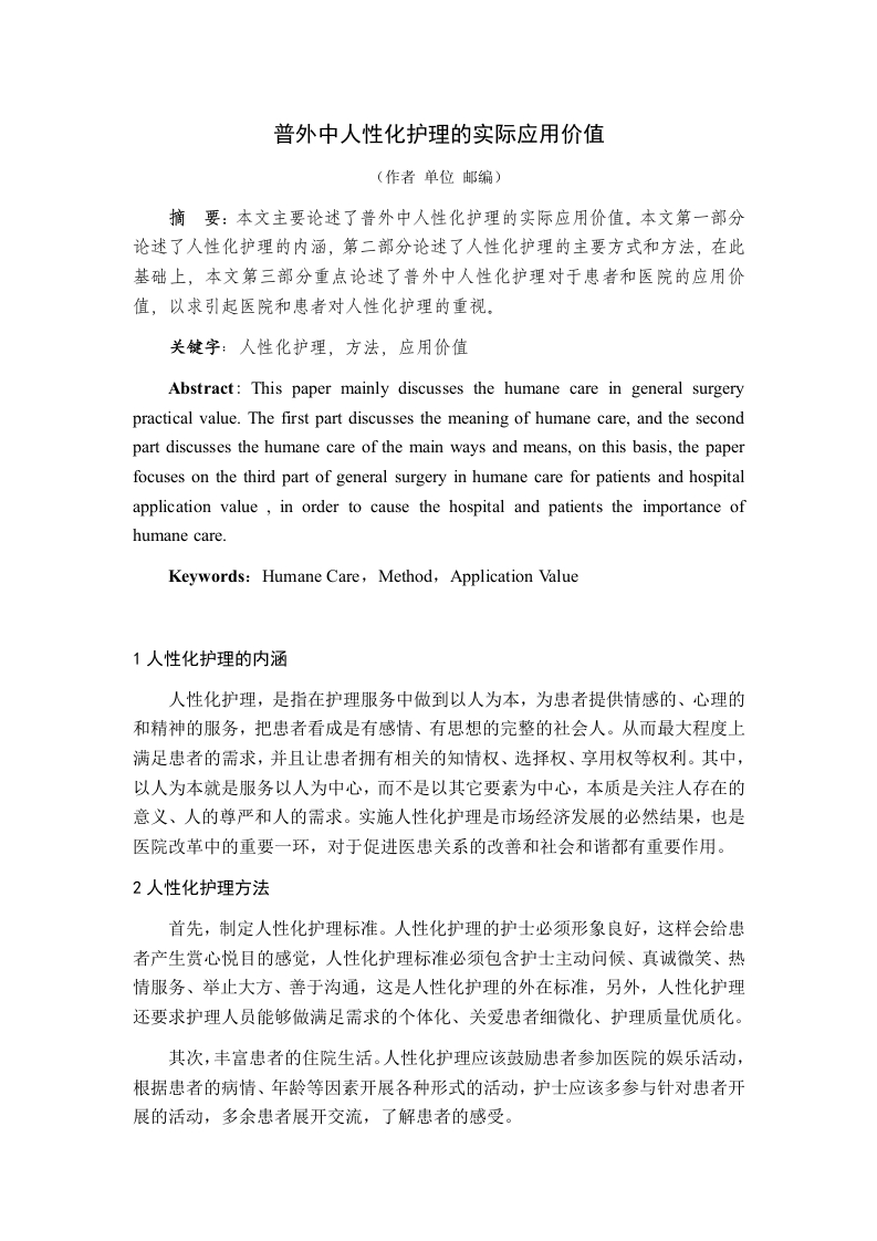 普外中人性化护理的实际应用价值(作者单位邮编)摘要:本文主要论述了普外中人性化护理的实际应用价值。本文第一部分论述了人性化护理的内涵,第二部分论述了人性化护理的主要方式和方法,在此基础上,本文第三部分重点论述了普外中人性化护理对于患者和医院的应用价值,以求引起医院和患者对人性化护理的重视。关健字:人性化护理,方法,应用价值Abstract:This paper mainly discusses the humane care in general surgerypractical value.The first part discusses the meaning of humane care,and the secondpart discusses the humane care of the main ways and means,on this basis,the paperfocuses on the third part of general surgery in humane care for patients and hospitalapplication value in order to cause the hospital and patients the importance ofhumane care.Keywords:Humane Care,Method,Application Value1人性化护理的内涵人性化护理,是指在护理服务中做到以人为本,为患者提供情感的、心理的和精神的服务,把患者看成是有感情、有思想的完整的社会人。从而最大程度上满足患者的需求,并且让患者拥有相关的知情权、选择权、享用权等权利。其中,以人为本就是服务以人为中心,而不是以其它要素为中心,本质是关注人存在的意义、人的尊严和人的需求。实施人性化护理是市场经济发展的必然结果,也是医院改革中的重要一环,对于促进医患关系的改善和社会和谐都有重要作用。2人性化护理方法首先,制定人性化护理标准。人性化护理的护士必须形象良好,这样会给患者产生赏心悦目的感觉,人性化护理标准必须包含护士主动问候、真诚微笑、热情服务、举止大方、善于沟通,这是人性化护理的外在标准,另外,人性化护理还要求护理人员能够做满足需求的个体化、关爱患者细微化、护理质量优质化。其次,丰富患者的住院生活。人性化护理应该鼓励患者参加医院的娱乐活动,根据患者的病情、年龄等因素开展各种形式的活动,护士应该多参与针对患者开展的活动,多余患者展开交流,了解患者的感受。再次,营造人性化的住院环境。温馨而优雅的环境可以让患者起到良好的心理治疗作用,是人性化护理必不可少的一部分,营造一种人性化的,尽可能体现家庭气氛的环境,可以环境患者的压力,提高治愈的效率。另外,房间的布局应该尽可能的合理、光线充足,色调和谐。3.普外中人性化护理的实际应用价值3.1人性化护理可以满足患者的有效需求国外有学者研究认为,人有五个层次的基本需求,即生理需求、安全需求、爱与归属需求、尊重的需求和自我实现的需求,通常在前一个层次的需求被满足之后,接着就会出现下一个更高层次的需求。人在生病的时候感情和心理上都变得非常脆弱,因此,护理人员对患者进行人性化护理,以保护患者的知情权和基本的隐私权,对患者的护理以关心和爱护为基本条件,尊重被护理患者。人性化服务的核心是对患者的生命价值、人格尊严和个人隐私的尊重。3.2人性化护理培养护理人员的素质人性化护理是医院人文关怀的重要组成部分,不仅关心患者的身体疾病问题,还关心患者的精神问题,注重患者的精神和感情需求。这些要求是对护理人员的一种要求,也是他们提升自我服务质量的一个机会,护理人员在长期的人性化护理过程中形成的人文精神是医院服务质量的一部分。人性化护理是整个医院的精神气质为之一变,从仅关注患者的患病治疗到两手抓,既抓治疗服务又抓精神和感情服务,必将提供社会更好的医疗服务,促进医疗行业水平的提高。3.3人性化护理提高医院的竞争力近年来随着市场经济的发展和医疗改革的深入,医疗行业的竞争也变得激烈起来,外资医院的大举进入和民营医院的崛起,尽管一些外资医院和民营医院治疗费用非常昂贵,但是还是有很多患者愿意去看病。因此,人性化服务必然是未来中国众多医院的选择。患者对人性化护理的重视,不仅是看重护理人员为他做了哪些事情,而且关注护理人员做这些事情时是否能够做到主动、热情、耐心等,是否表现出对患者的关心和尊重,以及患者的生理、心理、自尊等是否能够得到良好的满足,如果能做到这些,就是人性化的服务,就是优质服务。这就其实医疗和护理工作者,人性化服务的核心就是要站在患者的角度去思考,重视患者的体验,患者需要什么,医院就应该考虑改进什么,进而提高患者的满意度,提升服务质量,进而增加医院的整体竞争力。3.4人性化服务有利提高护理工作的社会价值护理服务的工作对象是患者,在服务过程中除了医疗手段之外,和患者的进行交流是护理工作必不可少的环节。人性化服务就是护理人员和患者之间人性化的相互作用、相互影响。实施人性化服务,需要给患者营造愉悦的对话环境,以更高的素质和服务满足患者身体的、心理的和精神的需求,感受到护理过程中人性化的温暖,同时也是护理人员的心态得到提升,使护理质量得到升华,在工作中享受快乐。这有利于提升护理工作的积极、正面的影响,护理素质的好坏还影直接影响到医院的形象,进而关系到医院的生存和发展,其社会价值也是重大的,不容忽视。参考文献:[1]王恒.人性化护理在手术室的应用[U.中国误诊学杂志.2011(21)[②]杨华利,王海桃.人性化护理在护患关系中的应用凹.当代护士(综合版)2008(01)[3]李智明.人性化护理在手术室围手术期护理中的应用[).护理实践与研究.2010(13)[4]刘瑞梅
