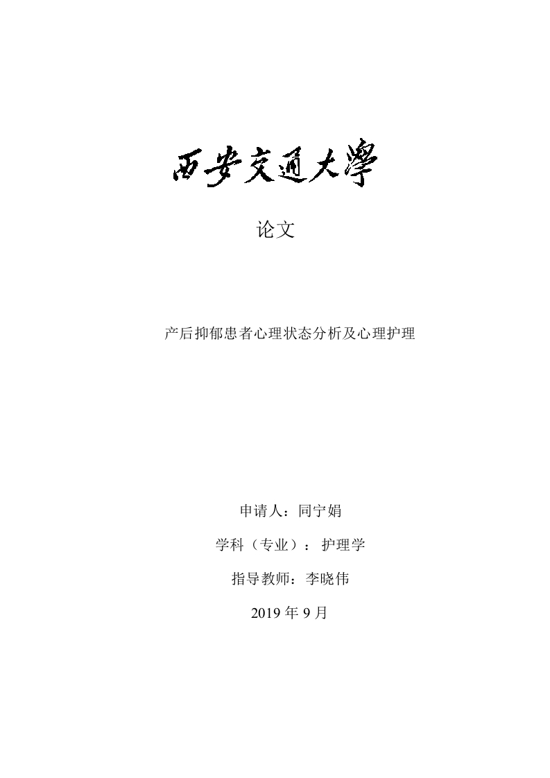 论文产后抑郁患者心理状态分析及心理护理申请人:同宁娟学科(专业):护理学指导教师:李晓伟2019年9月网络教育学院毕业设计(论文)任务书专业班级护理学1709层次专升本姓名同宁娟学号117091603040826一、毕业设计(论文)题目产后抑郁患者心理状态分析及心理护理二、毕业设计(论文)工作自2019年5月22日起至2019年9月26日止三、毕业设计(论文)基本要求:指导教师:李晓伟网络教育学院毕业设计(论文)考核评议书指导教师评语:建议成绩:指导教师签名:年月日答辩小组意见:负责人签名年月日答辩小组成员毕业设计(论文)答辩委员会意见:负责人签名:年月日