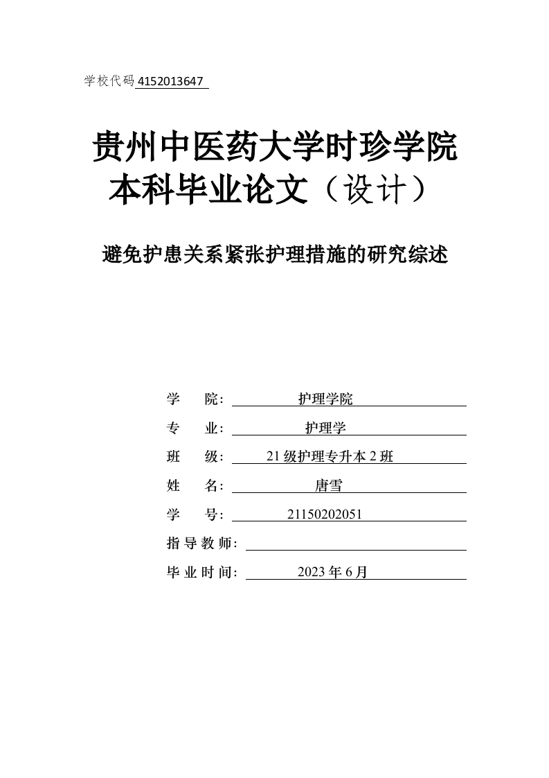 学校代码4152013647贵州中医药大学时珍学院本科毕业论文(设计)避免护患关系紧张护理措施的研究综述学院:护理学院专护理学班级:21级护理专升本2班姓名:唐雪学号:21150202051指导教师:毕业时间:2023年6月贵州中医药大学时珍学院本科毕业论文(设计)相关声明原创性声明本文声明,所呈交的毕业论文(设计)是本人在导师指导下进行的研究工作及取得的研究成果。尽我所知,除了论文(设计)中特别加以标注和致谢的地方外,论文(设计)中不包含其他人已经发表论文中撰写过的研究成果,也不包含为获得贵州中医药大学时珍学院或其他单位的学位或证书而使用过的材料。与我共同工作的同志对本研究所作的贡献均已在论文(设计)中作了明确说明。作者:日期:年月日关于毕业论文(设计)使用授权说明本文了解贵州中医药大学有关保留、使用毕业论文(设计)的规定,即:学校有权保留毕业论文(设计),允许毕业论文(设计)被查阅和借阅;学校可以公布毕业论文(设计)的全部或部分内容,可以采用复印、缩印或其他手段保存毕业论文(设计);学校可根据国家或贵州省有关部门规定送交毕业论文(设计)。作者签名:导师签名:日期:年月日目录1Abstract.................2前3正文41.1什么是护患关系....41.2我国护患关系的现状...1.3国外护患关系的现状...4552.3护理人员人力资源配置不合理,人文关怀不足.·62.4患者对护理人员期望值过高,维权意识过重,信任度低.·72.5医护矛盾的转嫁...83.缓解我国护患关系紧张的措施。83.1国家层面...3.2医院及护理人员3.3患者方面....8910致12