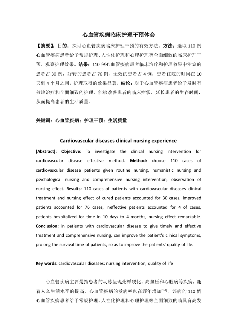 心血管疾病临床护理干预体会【摘要】:目的:探讨心血管疾病临床护理干预的有效方法。方法:选取110例心血管疾病患者给予常规护理、人性化护理和心理护理等全面细致的临床护理干预,观察护理效果。结果:110例心血管疾病患者临床治疗和护理效果中治愈的患者占30例,好转的患者占76例,无效的患者占4例,患者住院的时间在10天到4个月之间,护理取得的效果显著。结论:对于心血管疾病患者给予及时有效地治疗和全面细致的护理,能够改善患者的临床症状,延长患者的生存时间,从而提高患者的生活质量。关键词:心血管疾病;护理干预;生活质量Cardiovascular diseases clinical nursing experience[Abstract]:Objective:To investigate the clinical nursing intervention forcardiovascular disease effective method.Method:choose 110 cases ofcardiovascular disease patients given routine nursing,humanistic nursing andpsychological nursing and comprehensive nursing intervention,observation ofnursing effect.Results:110 cases of patients with cardiovascular diseases clinicaltreatment and nursing effect of cured patients accounted for 30 cases,improvedpatients accounted for 76 cases,ineffective patients accounted for 4 of cases,patients hospitalized for time in 10 days to 4 months,nursing effect remarkable.Conclusion:in patients with cardiovascular disease to give timely and effectivetreatment and comprehensive nursing,can improve the patient's clinical symptoms,prolong the survival time of patients,so as to improve the patients'quality of life.Key words:cardiovascular diseases;nursing intervention;quality of life心血管疾病主要是指患者的动脉呈现粥样硬化、高血压和心脏病等疾病,随着人么生活水平的提高,心血管疾病的发病率也在逐年增加。该病的110例心血管疾病患者给予常规护理、人性化护理和心理护理等全面细致的临具有高发病率、多并发症、高复发率、高致残率和高死亡率等特点,主要的发病人群是老年人群。因此要加强对心血管疾病患者的护理干预措施,能够改善患者的临床症状、延长患者的生存时间,降低患者的致残率和死亡率。现在对选取的110例心血管疾病患者给予常规护理、人性化护理和心理护理等全面细致的临床护理干预,观察护理效果,报道如下。1、资料和方法1.1一般资料选取110例心血管疾病患者给予常规护理、人性化护理和心理护理等全面细致的临床护理干预,观察护理效果。其中男性患者占60例,女性患者占40例,患者的年龄在45岁到91岁之间。其中风心病患者占4例,高血压患者占40例,肺心病患者占3例,冠心病并高血压患者占24例,心律失常患者占29例。1.2方法1.2.1给予患者常规的护理,预防出现压疮症状,给予相应皮肤护理,注意保持室内的空气流通,对室内的湿度和温度进行合理的设定:每天给予患者口腔护理,避免出现交叉性的感染:指导患者进行合理的饮食,切勿暴饮暴食,多食用高脂和高钠类食物,注意维持水电解质的平衡:根据医生的嘱附对患者的进行用药指导,对药物的疗效和不良的反应进行密切的观察:加强对夜间病房的巡视,如果患者的病情出现异常变化时要及时汇报给医生进行处理,引导患者取坐卧位或者坐位,必要的时候可以让患者把两下肢下垂,减少肺部淤血和回心血量。1.2.2给予患者心理护理,护理人员要指导患者进行定期检查,让患者了解相关疾病的病理变化、发病机制、病程的发展、对身体造成的危害程度和相应的预防措施等,消除患者恐惧、消极的心理,能够积极主动配合治疗:对于工作和家庭造成心理压力患者要耐心的进行引导,让患者的心理压力尽快的消除:对于紧张和焦虑的患者要进行耐心的劝导,让患者树立战胜疾病的信心,取得患者的信任后在进行相应的护理治疗:护理人员要掌握熟练地操作技巧,用行动来让患者的心理压力得到减轻,让患者了解病情的发展,了解心血管疾病的相关内容,增加患者对医护人员的信任感和安全感。1.2.3给予患者人性化的护理,主要体现在早晨护理人员能够主动给患者送去问候和关怀,多向患者询问病情,询问患者的饮食和睡眠质量,并给予正确引导。针对长期卧床的患者要给予定时协助拍背和翻身,对患者的病程发展进行密切的观察,能够及时发现存在的问题给予相应的处理。1.2.4选用软件SPSS16.0对观察的数据进行统计学处理,使用t对计量数据进行检验,使用x2对计数资料进行检验。P<0.05则表示存在的差异性具有统计学意义。2、结果110例心血管疾病患者临床治疗和护理效果中治愈的患者占30例,好转的患者占76例,无效的患者占4例,患者住院的时间在10天到4个月之间,护理取得的效果显著。讨论:心血管疾病的护理干预要求护理人员能够对患者病情的变化进行判断,相应的及时给与合理的护理干预措施,在最大程度上避免或者减少病情发生恶化,因此要求护理人员要掌握专业的知识和操作技能,提高自身的修养和素质B4!。护理人员在常规护理的基础上能够给予患者人性化护理和心理护理等全面细致的临床护理干预,消除患者的不良心理,积极主动配合治疗和护理,能够减少不良反应的发生率,促进患者早日康复。通过上述结果显示:110例心血管疾病患者临床治疗和护理效果中治愈的患者占30例,好转的患者占76例,无效的患者占4例,患者住院的时间在10天到4个月之间,护理取得的效果显著。说明了心血管疾病的治疗疗效和护理干预有非常密切的关系,对于心血管疾病患者给予及时有效地治疗和全面细致的护理,能够