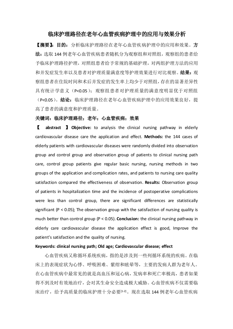 临床护理路径在老年心血管疾病护理中的应用与效果分析【摘要】:目的:分析临床护理路径在老年心血管疾病护理中的应用和效果。方法:选取144例老年心血管疾病患者随机分为观察组和对照组,观察组的患者给予临床护理路径护理,对照组患者给予常规的基础护理,对两组护理方法的应用和并发症发生率以及患者对护理质量满意度等护理效果进行对比观察。结果:观察组患者在住院时间和术后并发症的发生率上均少于对照组,存在的显著差异性具有统计学意义(P<0.05):观察组患者对护理质量的满意度明显优于对照组(P<0.05)。结论:临床护理路径在老年心血管疾病护理中的应用效果良好,提高了患者的满意度和护理质量。关键词:临床护理路径;老年;心血管疾病;效果abstract Objective:to analysis the clinical nursing pathway in elderlycardiovascular disease care the application and effect.Methods:the 144 cases ofelderly patients with cardiovascular diseases were randomly divided into observationgroup and control group and observation group of patients to clinical nursing pathcare,control group patients give regular basic nursing,nursing methods in twogroups of the application and complication rates,and patients to nursing care qualitysatisfaction compared the effectiveness of observation.Results:Observation groupof patients in hospitalization time and the incidence of postoperative complicationswere less than control group,there are significant differences are statisticallysignificant(P<0.05);The observation group with the satisfaction of nursing quality ismuch better than control group (P<0.05).Conclusion:the clinical nursing pathway inelderly care cardiovascular disease the application effect is good,Improve thepatient's satisfaction and the quality of nursing.Keywords:clinical nursing path;Old age;Cardiovascular disease;effect心血管疾病又称循环系统疾病,指的是涉及到一些列循环系统的疾病。在临床上的表现症状为心悸、呼吸困难、紫绀和眩晕等,主要的发病人群为老年人。在心血管疾病中最常见的就是高血压和冠心病,发病率和死亡率极高,患者如果得不到及时有效地治疗,会对其生命安全造成极大威胁。心血管疾病不仅需要临床治疗,给予高质量的临床护理十分必要-2。现在选取144例老年心血管疾病患者分别使用常规护理和临床路径护理,对两组护理方法的效果进行对比观察,报道如下。1、资料和方法1.1一般资料选取144例老年心血管疾病患者,男性患者占82例,女性患者62例,患者的年龄在40岁到72岁之间。其中经皮冠状动脉腔内成形手术的患者占26例,介入治疗手术的患者占88例,先天性心脏病封堵术的患者占10例,射频消融手术的患者占14例,永久性的心脏起搏器转入治疗的患者占6例。随机分为80例观察组和64例对照组,观察组的患者给予临床护理路径护理,对照组患者给予常规的基础护理。两组患者在基本资料上没有明显的差异性,不具有统计学意义(P>0.05),具有可比性。1.2方法1.2.1对照组患者给予传统的护理措施进行护理:观察组患者给予临床护理路径护理,主要的方法主要包括以下几个方面:1.2.1.1结合对患者的临床分析和查阅文献寻找护理路径,老年心血管疾病患者因为长期受病痛折磨、病情反复发作和药物疗效差等原因在术前都会产生恐惧、焦虑和紧张等不良的心理,对疾病的治疗缺乏信心,因此要根据患者的情况给予心理引导,让患者能够积极主动配合治疗,做好对并发症的预防工作,把健康教育当作主要的护理路径。1.2.1.2对并发症做好预防,对于老年心血管疾病在护理的过程中要做到早发现、早预防、早处理,术前提醒患者禁食的时间不要过长,也可以通过静脉补液对血容量进行补充:术前给予患者健康指导,让患者对排尿的意识加强训练,对排尿的条件反射进行强化。患者能够在穿刺的时候积极主动配合医生,避免反复穿刺:术后下床活动时引导患者不要用力下蹲,减少对腹部的压迫,做好预防发热引起的感冒和咳嗽等容易增加腹压导致穿刺点出血等症状。1.2.1.3给予患者健康教育指导,让患者更多的了解相关疾病预防和治疗措施,引导患者术前做好准备,术中积极主动配合治疗,术后按照医嘱按时吃药,注意对饮食结构的调整,保持大便的通畅,戒烟酒,预防感冒,出院后定期到医院进行复查。健康教育指导可以通过展板宣传、知识讲座和宣传手册等方式进行。1.2.2对患者在术后的临床症状、并发症的发生情况和住院的时间以及满意度进行观察并做好记录,通过随访工作观察患者的定期复诊率。1.2.3选用软件SPSS13.0对观察的数据进行统计学处理,使用t对计量资料进行检验,使用x2对计数资料进行检验,P<0.05则表示存在的差异性具有统计学意义。2、结果观察组患者在住院时间和术后并发症的发生率上均少于对照组,存在的显著差异性具有统计学意义(P<0.05),如下表1所示:观察组患者对护理质量的满意度明显优于对照组,两组护理效果间的差异性具有统计学意义(P<0.05)。表1,两组患者的护理效果对比:组别例数住院时间术后并发症发生率(%)低血压尿潴留血肿出血观察组8011±2.34.87%2.43%02.43%对照组6414±3.49.67%9.67%3.22%6.44%讨论:心血管疾病不仅需要临床治疗,给予高质量的临床护理十分必要。为了提高护理工作的预见性和计划性,达到缩短住院时间、提高护理质量和降低费用,临床护理路径已经被广泛应用于护理工作。通过上述结果显示,说明了临床护理路径在老年心血管疾病护理中的应用效果良好,能够有