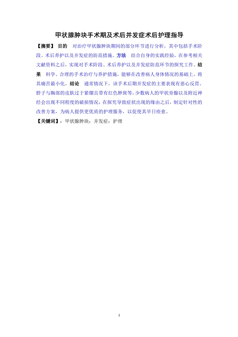 甲状腺肿块手术期及术后并发症术后护理指导【摘要】目的对治疗甲状腺肿块期间的部分环节进行分析,其中包括手术阶段、术后养护以及并发症的防范措施。方法结合自身的实践经验,在参考相关文献资料之后,实现对手术阶段、术后养护以及并发症防范环节的探究工作。结果科学、合理的手术治疗与养护措施,能够在改善病人身体情况的基础上,将其痛苦最小化。结论通常情况下,该手术后期并发症的主要表现有恶心反胃、脖子与胸部的皮肤过于紧绷且带有红色肿斑等,少数病人的甲状旁腺以及附近神经会出现不同程度的破损情况,在探究导致症状出现的缘由之后,制定针对性的改善方案,为病人提供更优质的护理服务,以促使其早日痊愈。【关键词】:甲状腺肿块:并发症:护理甲状腺肿块属于一种人们比较熟悉的颈部疾病,其具有很高的发病率,大部分病人的病变表现为良性,但是如果在前期没有及早发现并治疗的话,就极易转变成恶性肿瘤,将给病人带来更高的健康风险,甚至危及生命。现阶段依旧没有有效的方法来证实导致此疾病出现的原因,而这也是决定该疾病成为疑难杂症的关键性因素。参考相关临床资料后得知,目前,治疗这种疾病的主要手段即为外科手术,相对于其他治疗方式而言,它的安全性与治愈率也是最高的,根据实际情况科学的选择术式,不仅能够保证较高的手术成功率,还可以实现对复发率的有效控制,减轻病人在身理及心理层面的双重压力。1甲状腺肿块的诊断无论是前期的诊断阶段还是具体治疗环节中,出现了任何错误及问题,都有可能造成严重的后果,科学、合理的诊断方式,为治疗措施的规划环节以及具体的治疗阶段提供了前提保障。借助B超高频探头技术,能够实现对病变结构的精确观测,判断结节的囊实程度,更清晰地观察仅约两毫米的结节。此外,想要确保诊断工作的合理性,正确判断结节的性质,可以采取CT、MR和同位素扫描技术,不过在一些情况下,依旧难以保证对滤泡状癌的正确诊断,这一工作往往必须在观察术后切片样本之后,才能够完成,资深医师通过对细针穿刺细胞学相关理论的合理利用,能够将诊确率提升至88%,而这种诊断方式也因此得到了医学界的普遍认可,被广泛应用于相关领域,国外甚至有人认为其确诊度已经达到了90%。不过当下的情况是大部分基层医疗机构没有足够的经验,确诊率一直难以提升。大量的临床症状表明,普通的肿块不会使病人产生过多异常的表现,但恶性肿块病人的声线往往比较沙哑,而且很多人难以维持正常的呼吸状态,这成为判断肿块良恶性的关键风水岭。所以,治疗之前,应该综合考虑病人的具体情况,全面分析其病史,并进行系统的检查,在保证确诊无误的前提下,进行手术2甲状腺肿块的手术选择术式的选择在整个治疗及控制复发工作中都是比较重要的环节。尽管现阶段可以借助细针穿刺活检与冰冻切片技术维持较高的确诊率,不过在判别肿块良恶时,仍然存在诸多缺陷,此外,操作人员的技术水平与患者的实际情况也会在一定程度上影响着确诊率,而由于受到技术水平与经验等客观因素的限制,基层医院的确诊率必然会更低。还有很多医师对腺叶切除技术比较陌生,担心在操作时出现差错,对喉返神经等附近部位造成误伤,通常只做活检式切口,或处理掉少数腺叶,在微型创口内进行结节的切除工作,假设遇到恶性结节,这种操作方式会促进癌细胞的扩散,对部分软组织造成破坏,给之后的治疗工作带来不便。目前,相关领域人士开始反对这种治疗理念,并倡导废除这类手术方式。对良性结节的具体处理方式成为相关领域探讨的焦点,一部分人士认为应该采取次全切除术,而另一部分则认为应该采取全切除术,如今,很多专家开始主张使用全切兼峡部切除术同。该术式比较适用于孤立性结节患者。而全切术则适用于良性结节患者。这种术式并不会考虑具体的病理性质,无论哪种情况,都会将腺叶与峡部全部切除,以达到预期的预料效果⑥。3甲状腺肿块并发症发生原因和防治接受过全切术治疗的病人,其并发症多表现为呼吸困难,严重的话会出现室息情况,而术中止血工作没有做到位、大量出血会聚集于腺床、气管长时间受到肿块挤压都可能引发这类症状,插管操作会使得一部分病人的气管与喉部出现水肿,严重影响到病人的正常呼吸。在后期应进行全方位、细致的观测,只要病人出现这种问题,就应该尽快切开其气管,及时处理管内障碍,保证其呼吸的畅快。甲状旁腺损伤属于另一种比较常见的并发症,在所有接受过手术的病人中,平均每一百至两百人,就有一个人会出现该症状,有时候其发生率甚至会达到30%。旁腺的误切将会对血循环系统造成破坏,从而减少了病人的血钙量,同时神经、肌肉将变得更加敏感,导致病人出现抽搐症状。所以,在术期,需要注意对旁腺的保护,留下一部分动脉分支,保证供血系统的正常运作。喉返神经损伤属于比较严重的并发症,发生率峰值已经达到了13.3%。单侧损伤将对病人的发声系统留下永久性的伤害,双侧损伤会使得病人难以发出声音,严重时会危及生命。所以,在进行切除工作之前应该将喉返神经完全显露出现,已确保不会出现误伤其实甲状腺手术在技术层面的难度并没有想象中那么大,术野小才是导致其操作过程中频频出现失误的关键性因素,对于短期的旁腺功能受阻情况