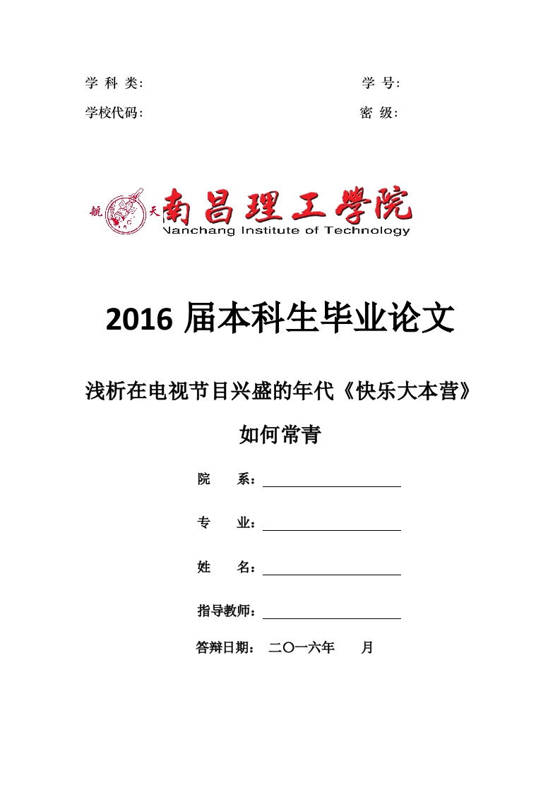 学科类:学号:学校代码:密级:Nanchang Institute of Technology2016届本科生毕业论文浅析在电视节目兴盛的年代《快乐大本营》如何常青院专姓名:指导教师:答辩日期:二0一六年月毕业论文诚信声明本人郑重声明:所呈交的毕业论文》是本人在指导老师的指导下,独立研究、写作的成果。论文中所引用是他人的无论以何种方式发布的文字、研究成果,均在论文中以明确方式标明。本声明的法律结果由本人独自承担。作者签名:指导教师签名:年月日南昌理工学院本科生毕业论文摘要随着科技的发展以及人民物质生活的提高,我国的文化及人民观念发生了一定的改变,尤其是在电视电脑的普及之后,电视娱乐节目逐渐成为现在电视节目的主打节目,当下电视娱乐节目可谓是“百花齐放”,作为已经在电视娱乐节目中存在了十九年的《快乐大本营》,如何长青下去则是其必须要注意的问题。本文以《快乐大本营》为研究对象,从中探究在电视节目兴盛的年代里,《快乐大本营》如何继续保持较高的收视率,并长久健康发展。文章第一部分是对电视娱乐节目的概述,论述了电视娱乐节目的内容形式、现状以及“真人秀”类电视娱乐节目的特征,第二部分从《快乐大本营》的流程、节目特点两方面对其进行分析,第三部分是《快乐大本营》过去和现在的对比及当下面临的问题,重点描述在当下快乐大本营面临的问题,第四部分提出相关建议,《快乐大本营》要想长青需在四方面进行改变。我国的电视娱乐节目目前正处于发展期,虽然发展欣欣向荣,但仍存在一定的问题,希望本文可以为我国电视娱乐节目的研究一共一些参考意见,从而使电视台创造更好的娱乐节目。关键词:电视节目:《快乐大本营》:发展