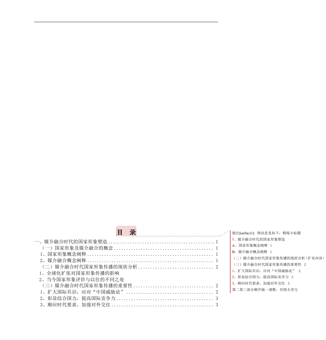 目录批注surfacel:小修改意见如下:精炼小标趣一、媒介融合时代的国家形象塑造....11、媒介融合时代的国家形象塑造A、国家形象概念阐释1B、媒介融合概念阐释11(二)媒介融合时代国家形象传播的现状分析(扩充内容)2(三)媒介融合时代国家形象传播的重要性21、全球化扩张对国家形象传播的影响1、扩大国际共识,应对“中国威胁论”22、当今国家形象评价与以往的不同之处2、彩显综合国力,提高国际竞争力3(三)媒介融合时代国家形象传播的重要性.23、顺应时代要求,加强对外交往31、扩大国际共识,应对“中国威胁论”2第二第三部分顺序做一调整,否则太突兀2、彰显综合国力,提高国际竞争力.·3错误!未定义书签。1、国家形象意识淡薄.·453、中国国家形象塑造缺乏均衡性.·4、中国国家形象的传播能力不足.....四、媒介融合时代下国家形象传播的有效途径781、构建仪式场域.…99(二)场景化服务提升政治话语传播效果10102、深度交互体验,提升在场参与感.…3、契合青年亚文化,满足传受双方信息匹配(三)柔性化策略转变政治传播语态121、人物平凡化,降低传播姿态121213五、结语错误!未定义书签。媒介融合时代国家形象传播研究以新中国成立70周年报道为例摘要国家形象是一个国家综合国力的重要体现。近年来,中国坚持走站起来强起来到富起来的发展道路,随着中国的不断崛起,世界各国对中国也投来了越来越热切的目光,作为世界发展重要一环的中国,其国家形象亦引起了国际社会的高度关注。然而,伴随着全球化的深入,媒介融合时代的到来,信息的力量越显强大。通过研究在媒介融合时代中国国家形象传播的概况,找到适合本国国家形象传播的路径,对我国塑造国家形象具有很强的现实意义。[关键词]:国家形象;媒介融合;主流媒体ABSTRACTAs the times progress and technological development,more and more harmonious society bythe govemment,the media and general public attention,has become the direction of the joint