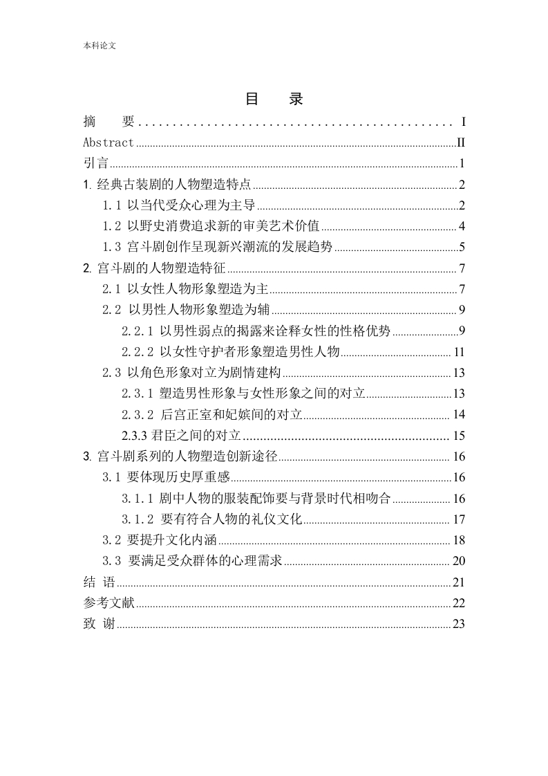 本科论文目录摘引言.1.经典古装剧的人物塑造特点21.1以当代受众心理为主导21.2以野史消费追求新的审美艺术价值1.3宫斗剧创作呈现新兴潮流的发展趋势52.宫斗剧的人物塑造特征2.1以女性人物形象塑造为主2.2以男性人物形象塑造为辅2.2.1以男性弱点的揭露来诠释女性的性格优势92.2.2以女性守护者形象塑造男性人物.112.3以角色形象对立为剧情建构….132.3.1塑造男性形象与女性形象之间的对立132.3.2后宫正室和妃嫔间的对立.…142.3.3君臣之间的对立153.宫斗剧系列的人物塑造创新途径163.1要体现历史厚重感.163.1.1剧中人物的服装配饰要与背景时代相吻合.163.1.2要有符合人物的礼仪文化.173.2要提升文化内涵183.3要满足受众群体的心理需求20结语21参考文献22本科论文摘要经典古装剧以历史题材为背景,在塑造人物和叙述事件时不必依据史料,而是借用古人的思想情感来提升现代社会的审美情趣,即以情节和人物虚构,趋向于大众娱乐和文化审美等诉求。传统的经典古装剧多以意识形态说教塑造人物形象,然而在受众群体市场需求下,现今的经典古装剧人物塑造多以受众群体的娱乐快感宣泄为主,这也促成了新兴古装宫斗剧的到来。针对我国经典古装剧的人物塑造特点展开研究,可以找出当前经典古装剧的发展趋势,并对新兴古装宫斗剧人物塑造进行深入解读,为的是提高经典古装剧在影视市场中的竞争优势,扩大古装剧市场效益。通过进一步研究新兴古装宫斗剧的人物形象和文化审视,探索新兴古装剧的发展方向。结果表明新兴宫斗剧人物塑造方式可以开拓古装剧市场和满足受众心理。此外,针对研究结果提出科学合理的建议,旨在创新和完善新兴古装宫斗剧的人物塑造途径,促进我国经典古装剧的健康发展。本科论文AbstractThe classical costume drama takes the historical theme as thebackground,which does not need to be based on the historical materialswhen shaping the characters and narrating the events,but uses thethoughts and emotions of the ancients to enhance the aesthetic taste of themodern society,that is,to make up the plots and characters,and tends tothe demands of mass entertainment and cultural aesthetics.The traditionalclassical costume dramas mostly use ideological sermons to shape thecharacters.However,under the market demand of the audience,today'sclassical costume dramas mostly focus on the entertainment of theaudience,which also contributed to the arrival of the new ancientcostume palace.In order to improve the competitive advantage of classiccostume drama in the film and television market and expand the marketefficiency of costume drama,we can find out the development trend ofthe current classic costume drama,and make a deep interpretation of thenew ancient costume palace.Through further research on the charactersand culture of the new costume palace drama,the paper explores thedevelopment direction of the new costume drama.The results show thatthe new way of character building can open up the market of costumedrama and satisfy the audience's psychology.In addition,scientific andreasonable suggestions are put forward for the research results,aiming atinnovating and improving the way of character creation of the newancient costume palace drama,and promoting the healthy development ofthe classic ancient costume drama in China.Keywords:Ancient costume drama;Gong Dou drama;characterization;classic;new