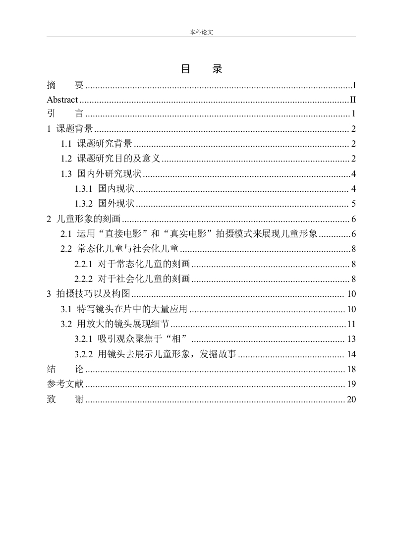 本科论文目录摘要…Abstract....引1课题背景21.1课题研究背景21.2课题研究目的及意义21.3国内外研究现状…41.3.1国内现状.42儿童形象的刻画2.1运用“直接电影”和“真实电影”拍摄模式来展现儿童形象62.2常态化儿童与社会化儿童…82.2.1对于常态化儿童的刻画…82.2.2对于社会化儿童的刻画3拍摄技巧以及构图.…103.1特写镜头在片中的大量应用103.2用放大的镜头展现细节113.2.1吸引观众聚焦于“相”133.2.2用镜头去展示儿童形象,发掘故事14结论参考文献.19致20本科论文摘要在对这部作品进行研究的时候,本文采用了叙事手法来进行具体的阐释,当中在塑造儿童形象的时候,采用了直接电影和真实电影的拍摄手法,从而能够更真实的捕捉到儿童的日常状况,运用了特殊的拍摄技巧,采用大量的特写镜头,以故事化的手段来进行剪辑,从而能够更好的进行内涵的挖掘,用镜头来体现故事性,保证故事也能够更好地吸引到观众。在人物纪录片拍摄当中,特写镜头扮演非常重要的角色,能够凸显出人物的形象,吸引观众的注意点,让观众能够知道拍摄者想要表达的东西是什么,能够给观众留下深刻的印象。本部纪录片《记得那个腾空而起的夏天》一方面记录了儿童的日常生活,另外一方面也反映出了当下的社会实际情况,能够帮助其他学者更好进行儿童研究,也能够促进儿童更好发展,具有很强的现实意义。本科论文AbstractIn the study of this work,this article uses narratology theory for specificinterpretation.Among them,when shaping the image of children,the shootingmethods of direct movies and real movies are adopted,so that children 's Indaily life,special shooting techniques are used,a large number of close-up shotsare used,and storytelling is used to edit,so as to better excavate the connotation,use the lens to reflect the story,and ensure that the story can be better attractedto the audience.In character documentary shooting,close-up plays a very important role.Itcan highlight the image of the character,attract the attention of the audience,letthe audience know what the photographer wants to express,and leave a deepimpression on the audience.On the one hand,the documentary "remember thesummer rising from the sky"records children's daily life,on the other hand,italso reflects the current social reality,which can help other scholars better carryout children's research and promote children's better development,with strongpractical significance.Keywords:Image of children:Story:Close-up shot;Documentary